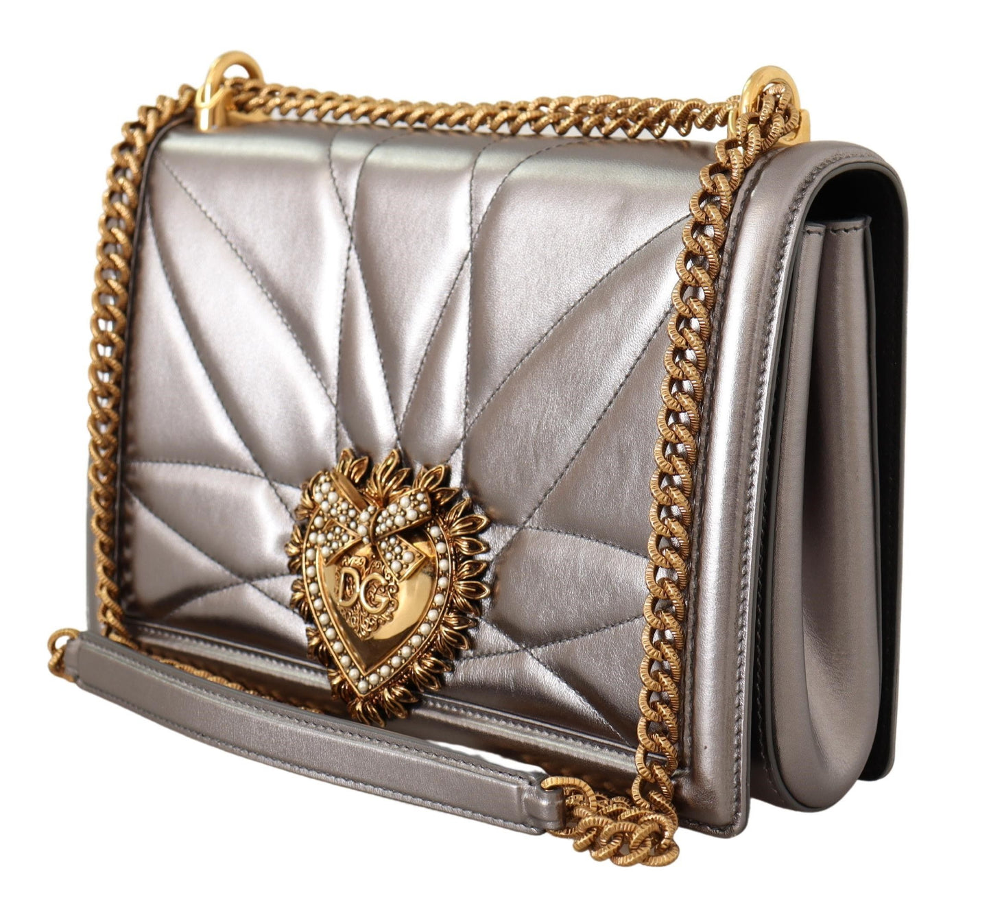 Indulge in the opulent elegance of this Dolce & Gabbana shoulder bag from the exclusive DEVOTION collection. Meticulously crafted from the finest leather in a striking silver hue, this purse epitomizes luxury with its gold metal detailing and iconic front flap adorned with a bejeweled branded heart, hand-tooled from a metal alloy with a delicate pearl inlay. Chic and versatile, it features a chain shoulder strap with a nappa leather insert, allowing you to wear it elegantly over the shoulder or across the body.