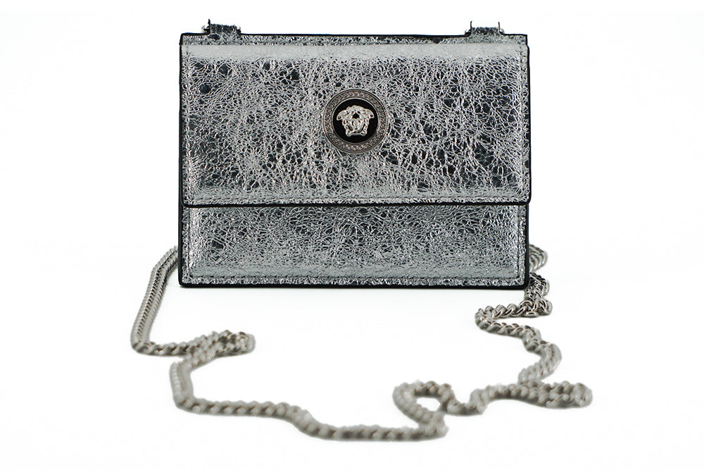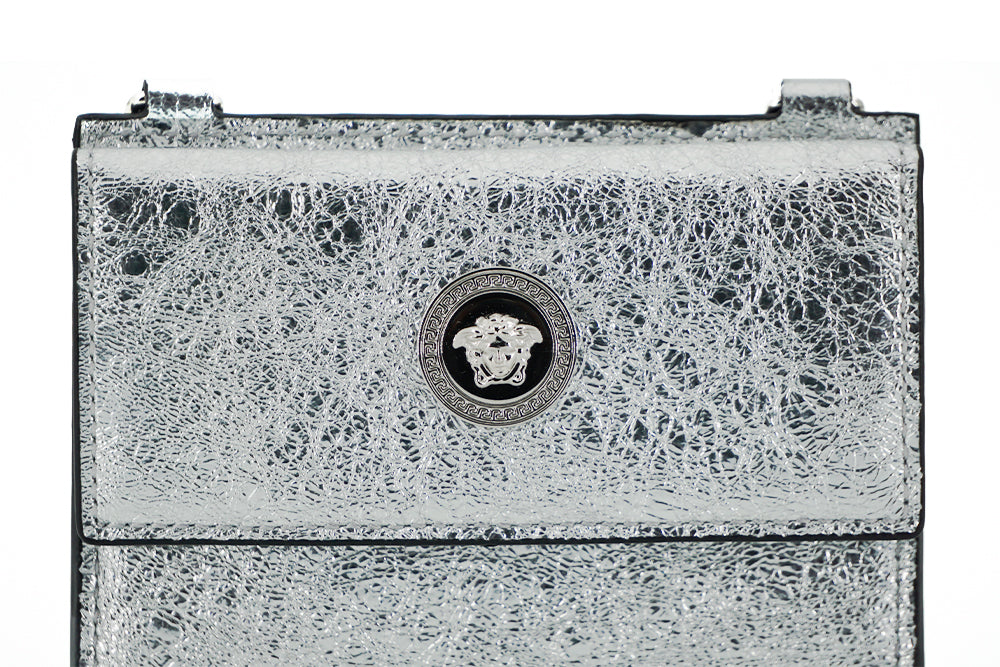 Featuring a secure flap snap closure, the case is adorned with the iconic Medusa head logo hardware, symbolizing Versace’s legacy of opulence and style. Organize your cards in the utmost sophistication with two main compartments and four card holder slots. The addition of a removable 110cm chain strap offers versatility, allowing you to wear it gracefully around your neck as a chic alternative to the traditional wallet.