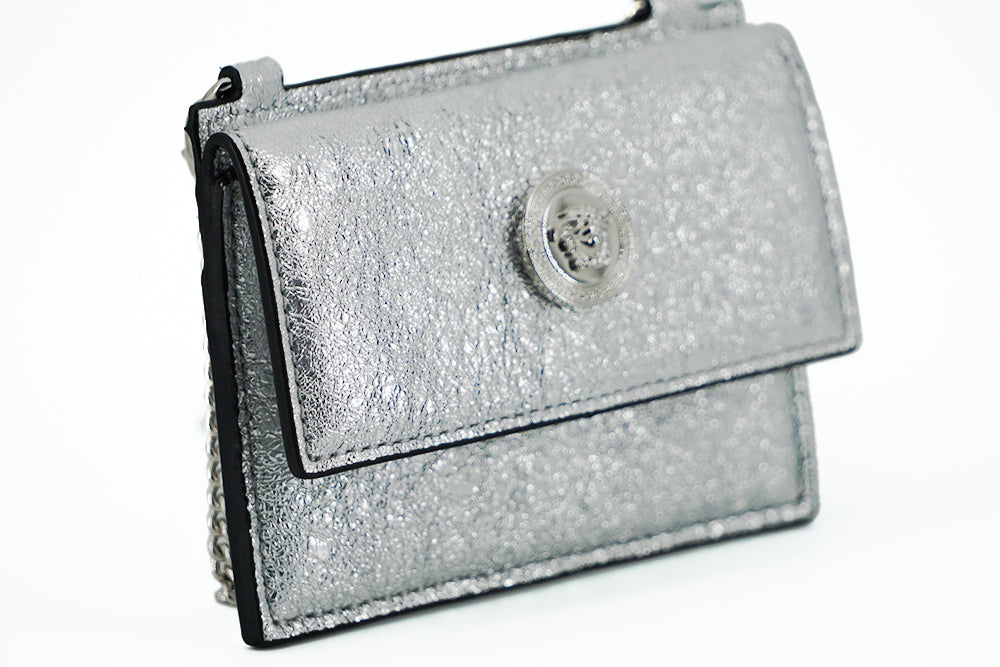Discover the epitome of luxury with our stunning Versace Nappa Leather Card Case, a true statement piece for the fashion-forward individual. This brand new, tag-accompanied accessory comes in a protective dustbag, ensuring its pristine condition upon arrival. The gleaming silver hue complements the smooth Nappa leather construction, providing a touch of elegance to your daily essentials.