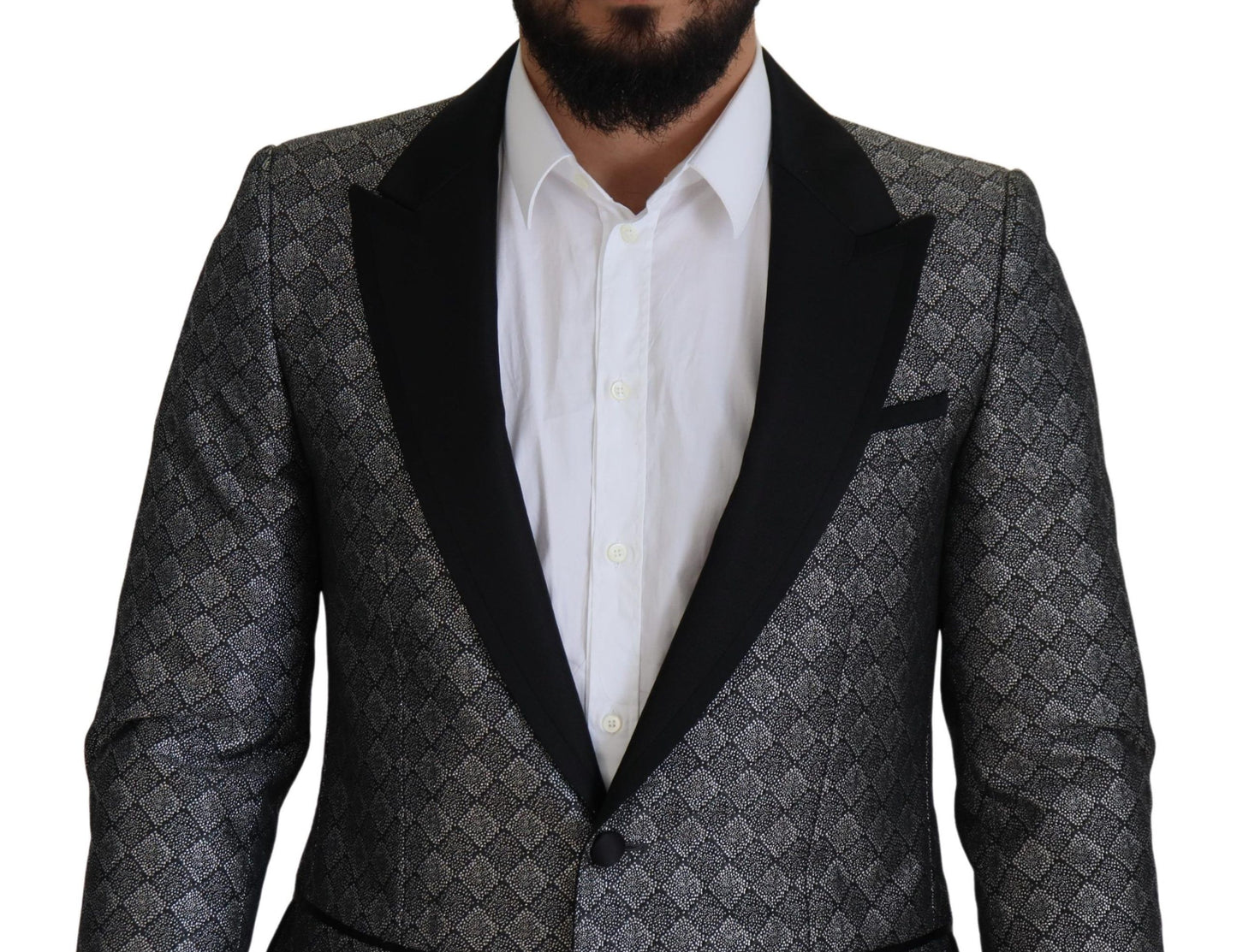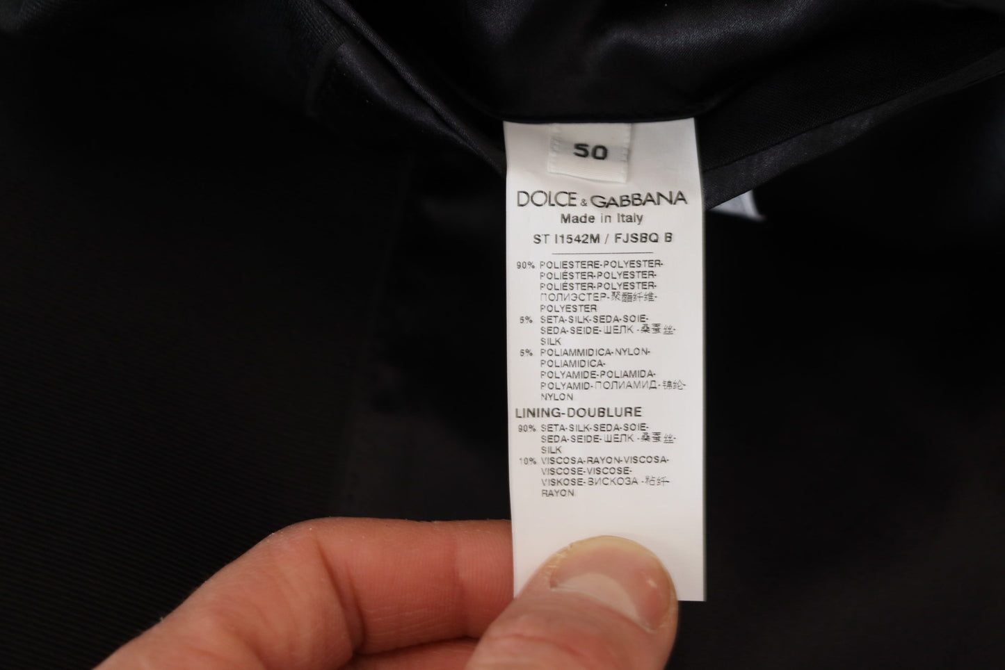 Discover the epitome of Italian luxury with this 100% authentic Dolce & Gabbana MARTINI suit. Effortlessly elevate your formalwear with this stunning silver two-piece suit, featuring exquisite craftsmanship and a sleek, slim fit design. The blazer showcases a stylish peak lapel and is complemented with a chest pocket, sophisticated side flap pockets, and elegant button cuffs. Accompanying trousers offer a perfect match with their meticulous mid-rise cut, button and zip fly, and convenient belt loops for an impeccable silhouette. Luxury meets practicality with logo details and this suit’s high-quality fabric blend creating a piece that’s not only visually striking but also comfortably wearable for any distinguished event.