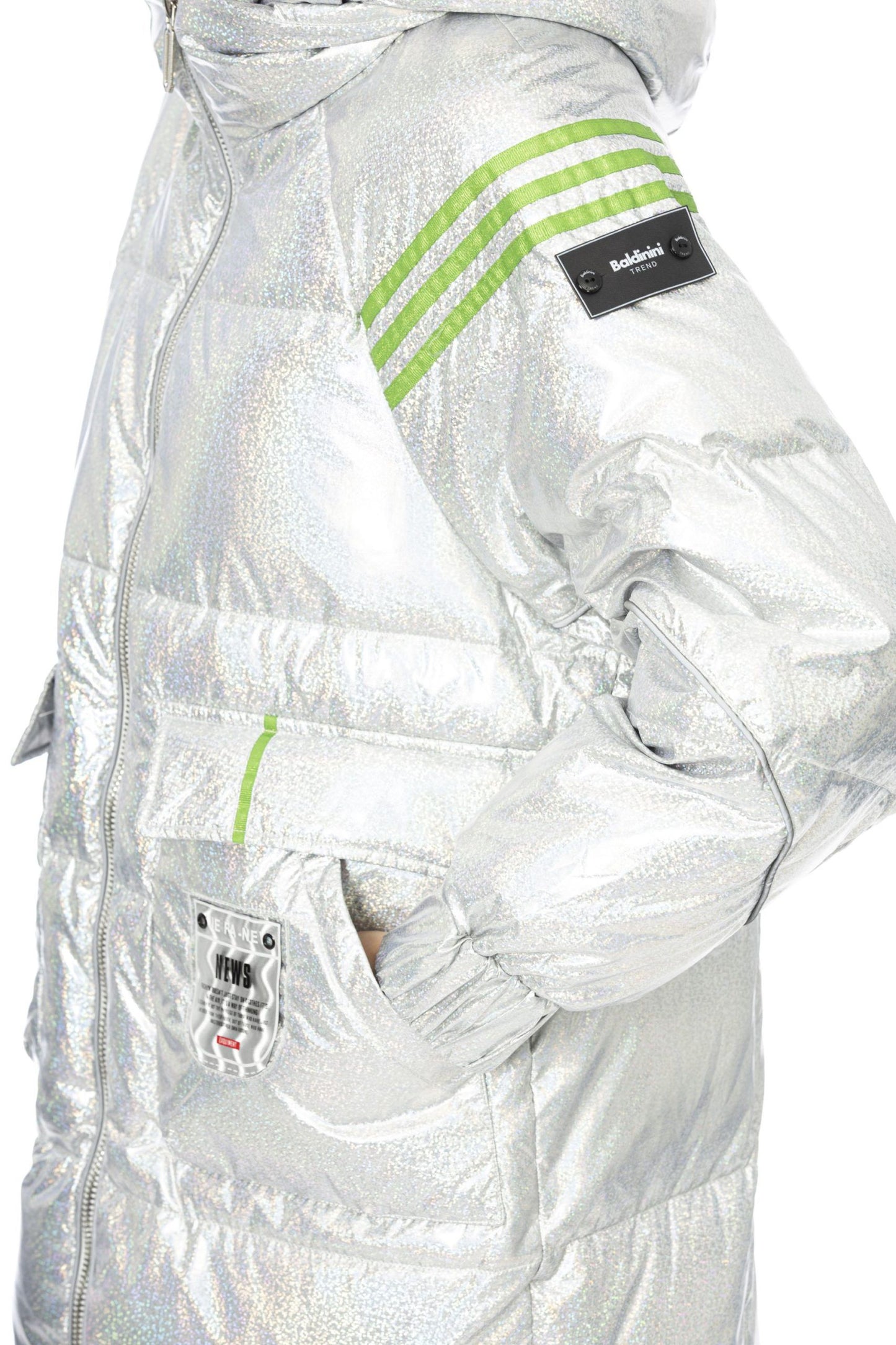 Experience the epitome of Italian elegance with this exquisite Silver Glam Long Down Jacket from Baldinini Trend. Crafted with care, this jacket features luxurious 100% Polyester material to keep you enveloped in warmth and style. The adjustable hood grants adaptability to any chilly conditions while you remain chic. Its unique metal Baldinini monogram adds a signature touch of sophistication. The jacket’s external welt pockets and front zip closure, complete with a customized zip puller, ensure both functionality and flair. Stand out in this beautifully designed piece that effortlessly combines utility with glamour.
