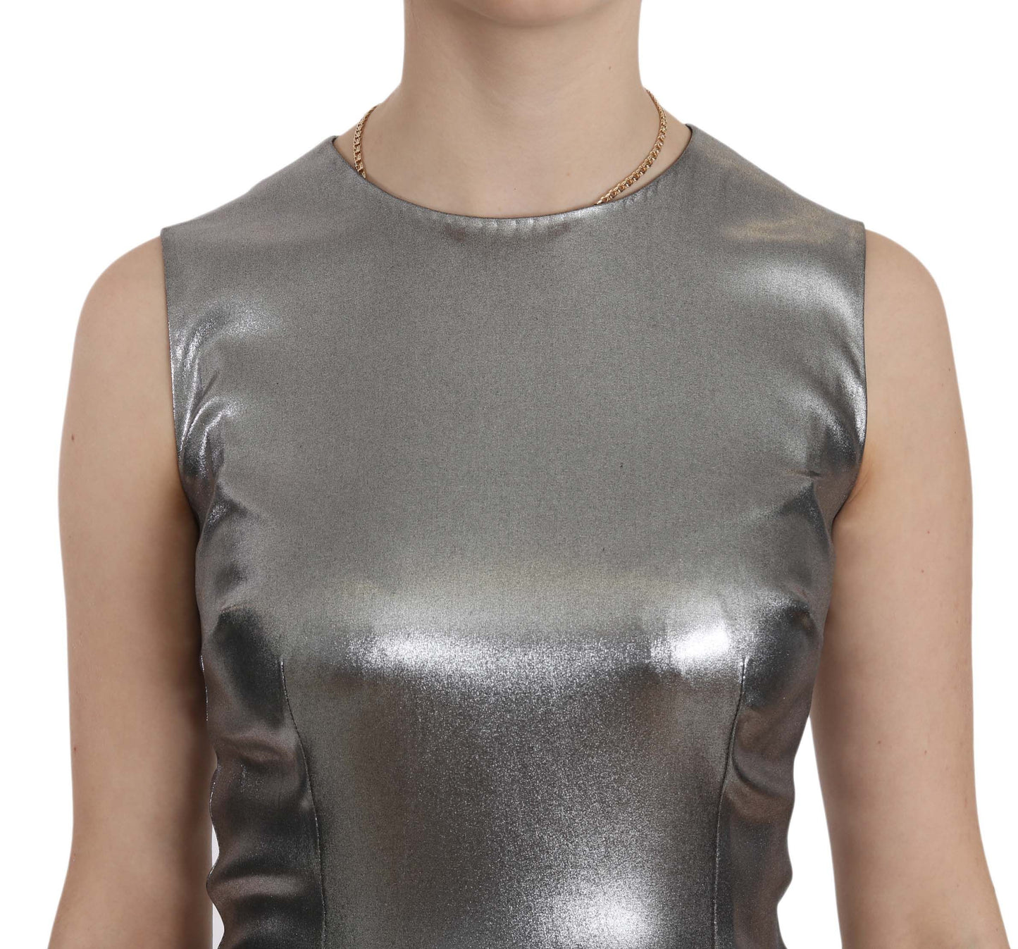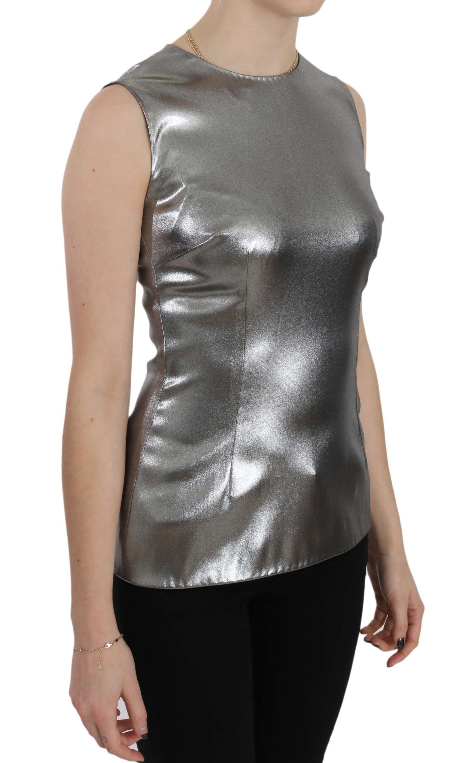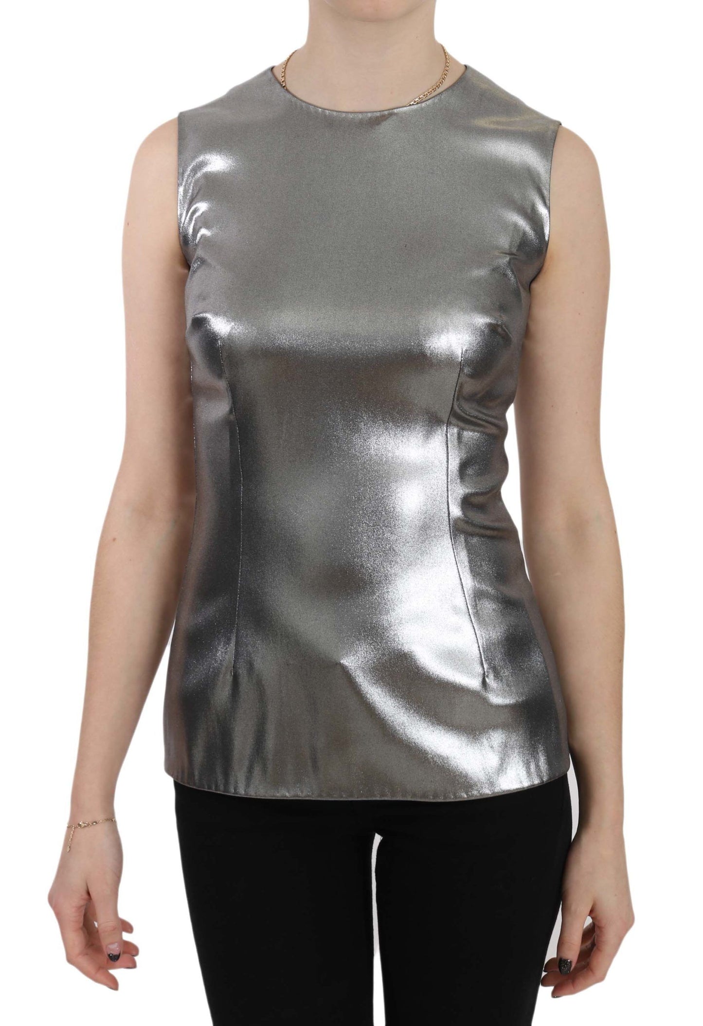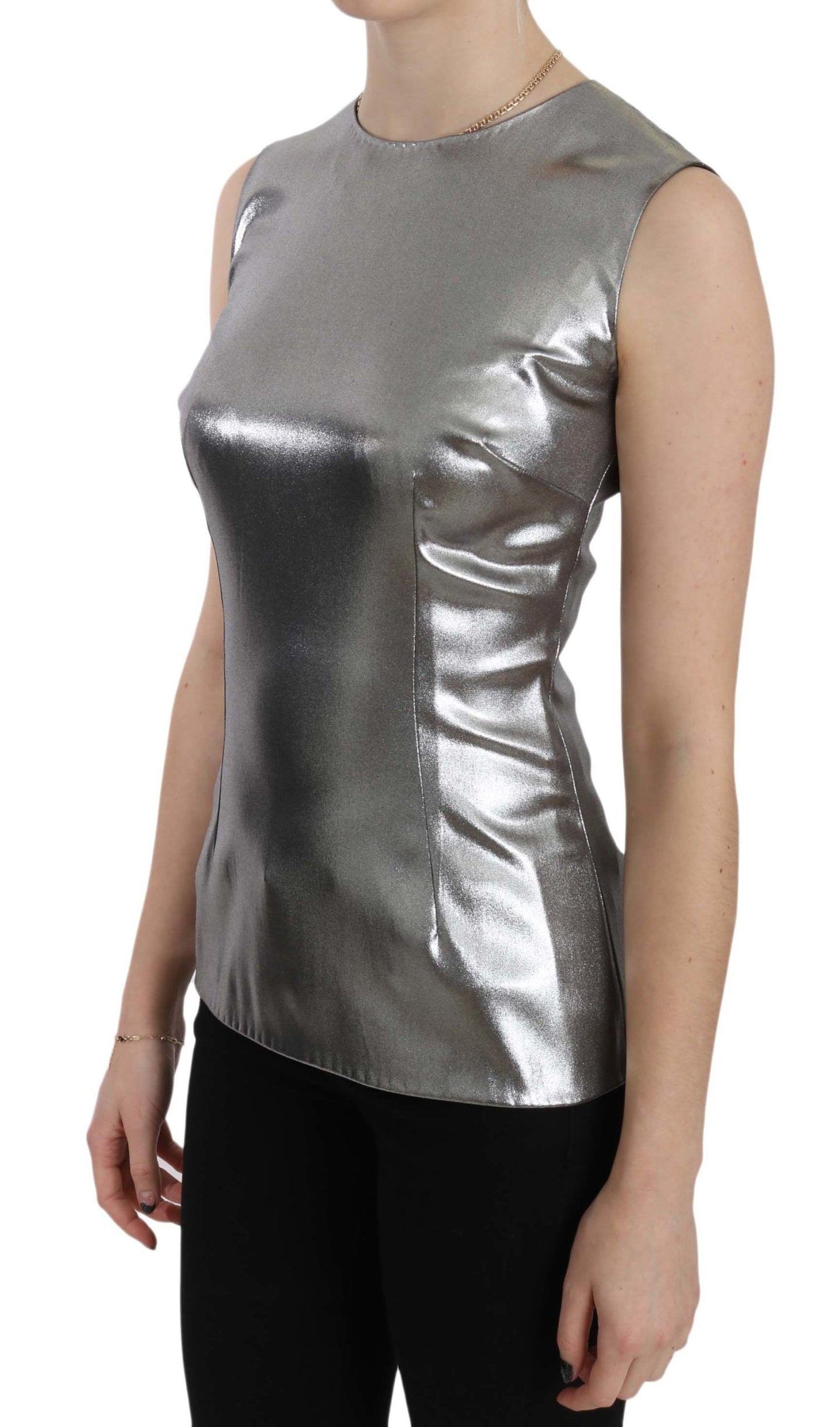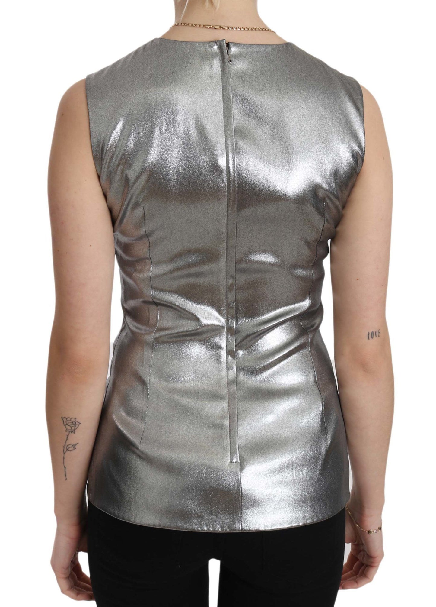 Indulge in the exquisite elegance of this 100% Authentic Dolce & Gabbana sleeveless silk top, tailored with stunning silver tulle that catches the light with every movement. Designed and crafted in Italy, this top showcases the brand’s commitment to unparalleled craftsmanship and luxury. It features the label’s subtle logo details, ensuring an exclusive and high-end addition to your wardrobe. Perfect for a glamorous evening out, this piece is a true testament to Dolce & Gabbana’s dedication to style and quality.