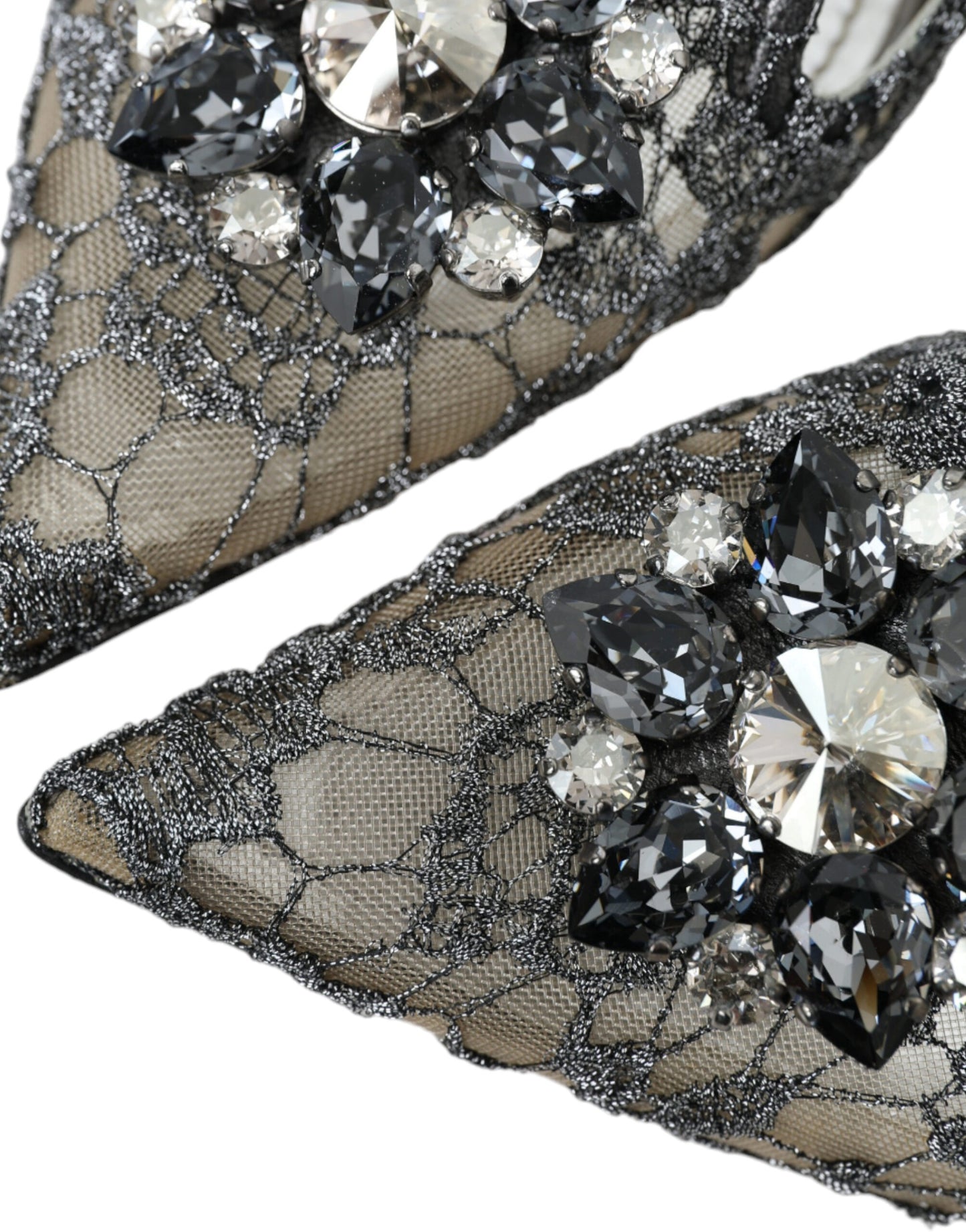 Gorgeous, brand new with tags 100% Authentic Dolce & Gabbana elegant Vally shoes are exquisitely crafted in Italy from the finest Taormina lace. Seen here in silver, these pretty floral lace Vally slippers from Dolce & Gabbana will instantly lift your look to new sartorial heights. Featuring an almond toe, a branded leather insole and a wearable flat leather sole, these beauties are finished with a sparkling decorative crystal flower on the front.