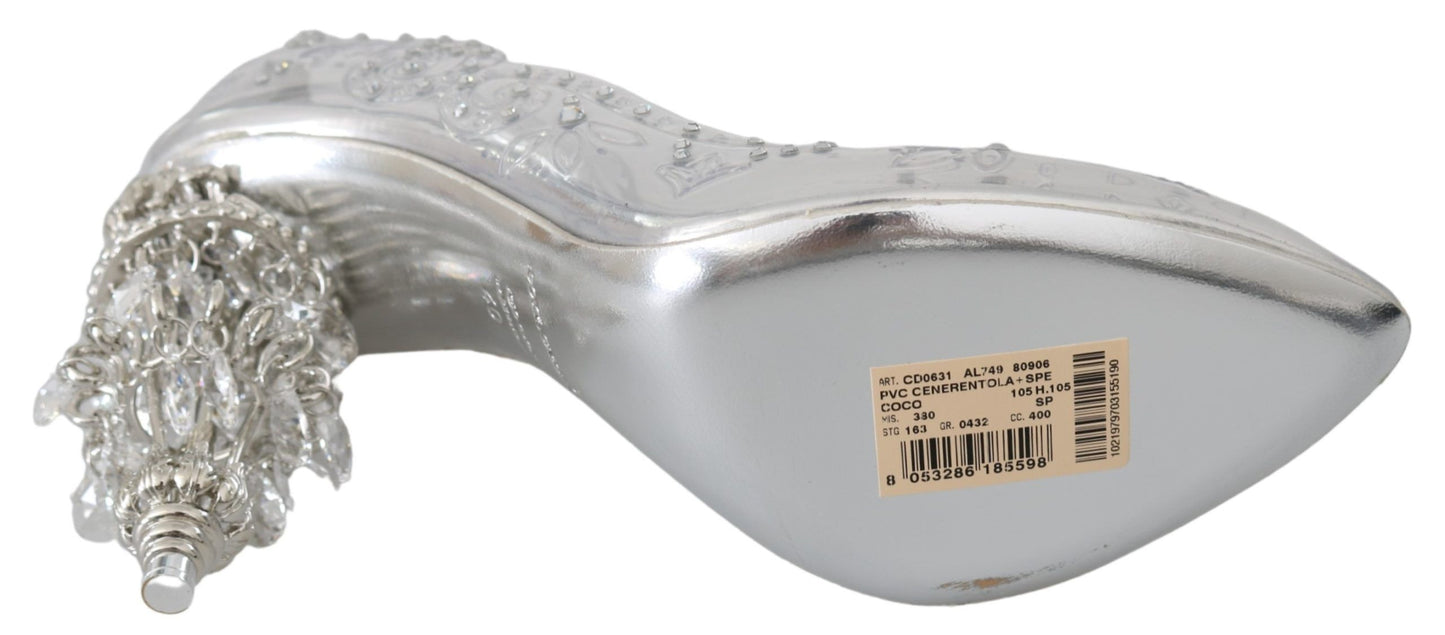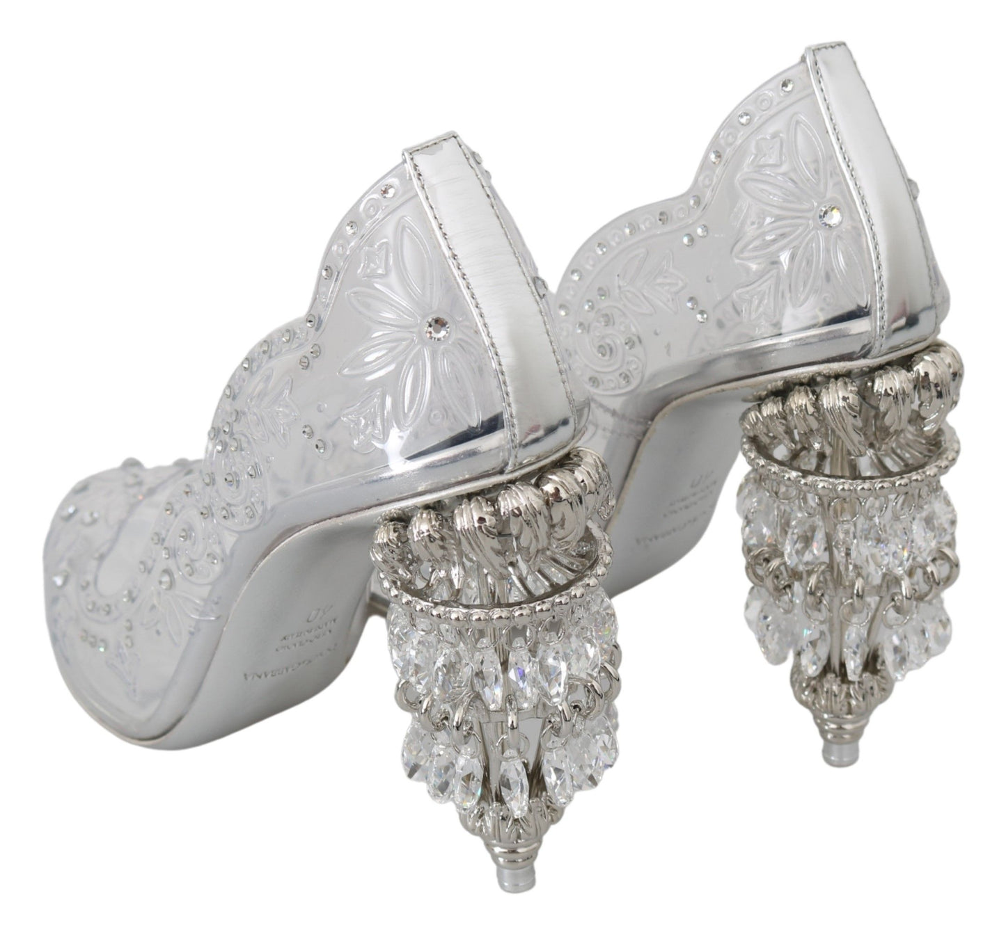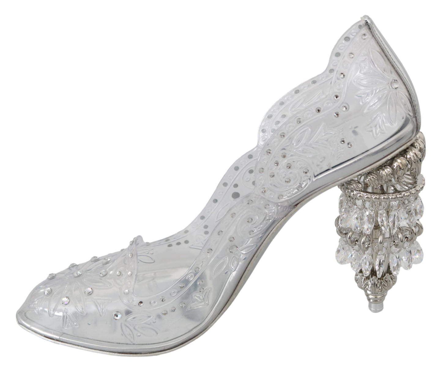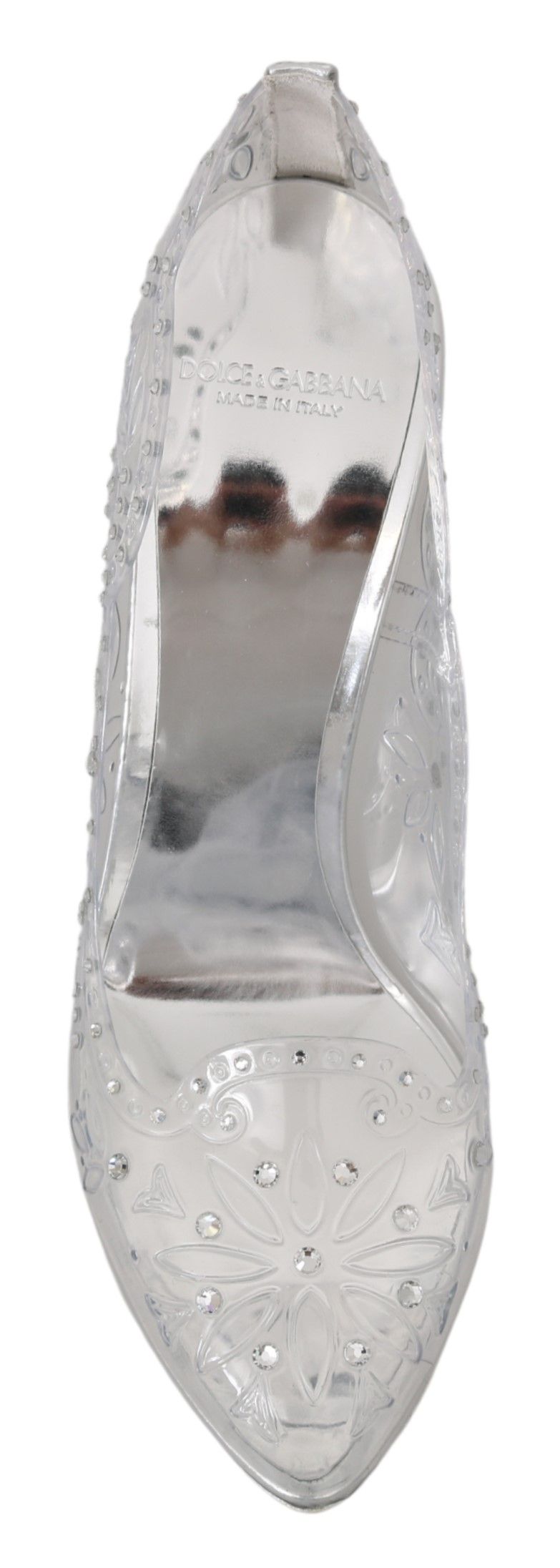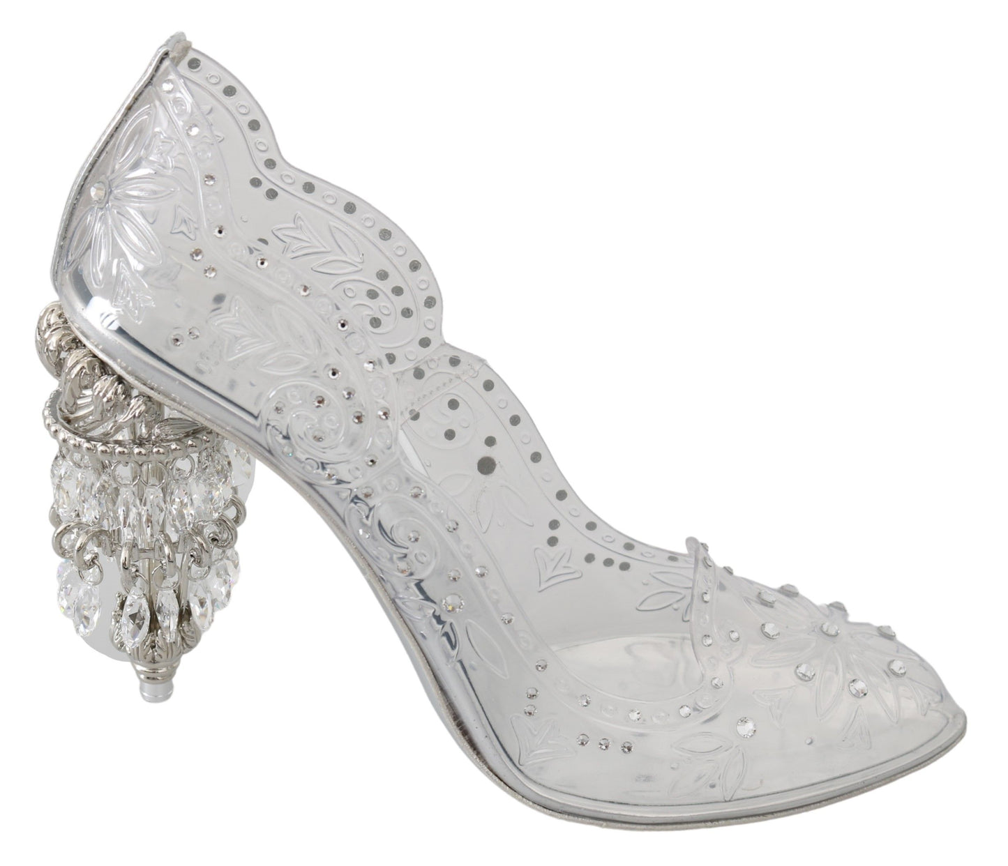 Step into a modern fairy tale with the gorgeous, brand new Cinderella pumps by Dolce & Gabbana. These transparent PVC heels are adorned with sparkling clear crystals, sure to enchant at any event. Crafted in Italy, they feature a rubber sole for comfort and the iconic Dolce & Gabbana logo as a testament to their authenticity and luxury appeal.