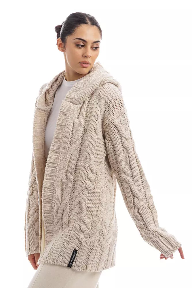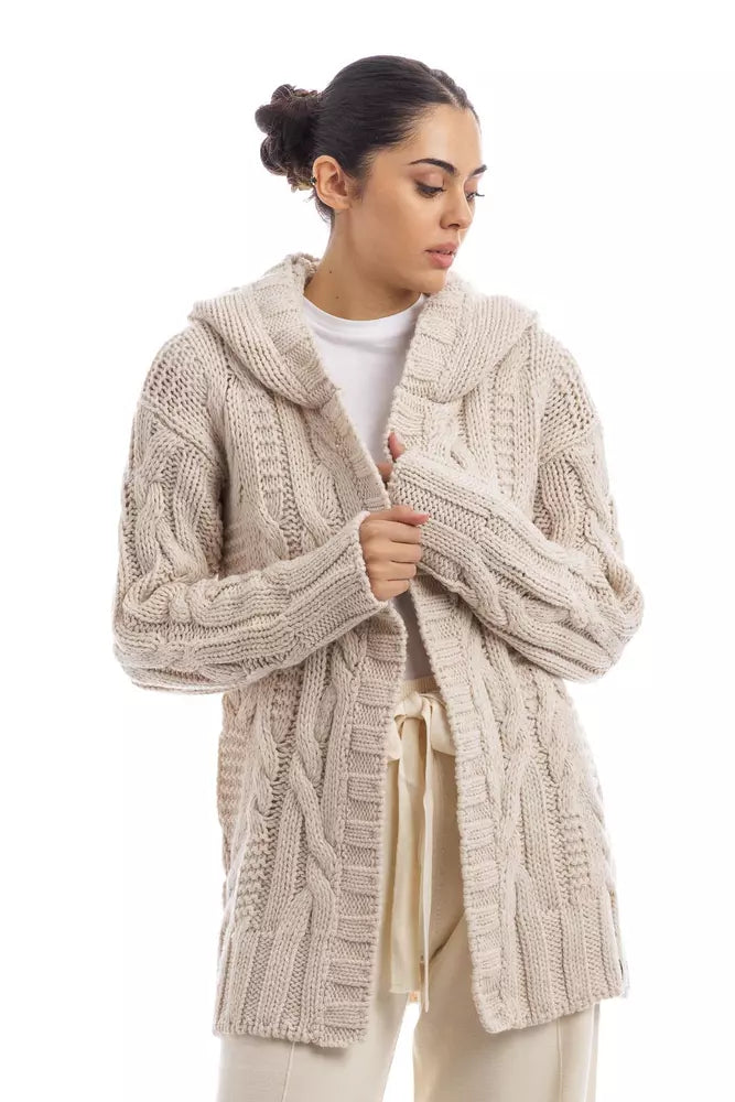 Discover cozy elegance with this luxurious long open cardigan, expertly crafted with thick yarn and a charming cable knit design. A snug hood adds a touch of whimsy while the subtle logo embellishment nods to refined branding. Perfect for crisp days or cool evenings, this cardigan, hailing from the artisan workshops of Italy, promises comfort and style.