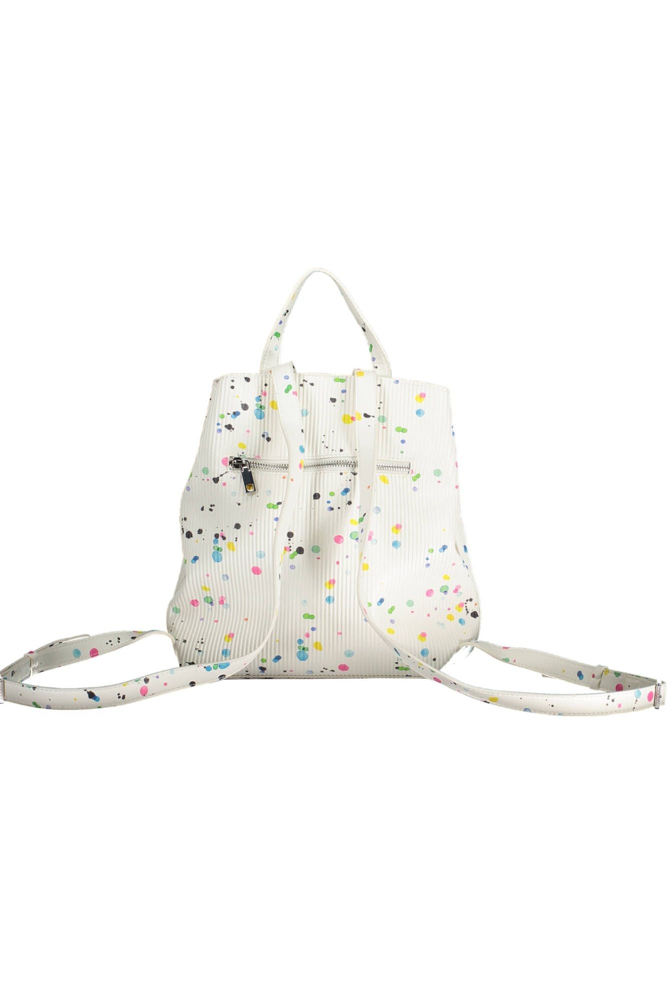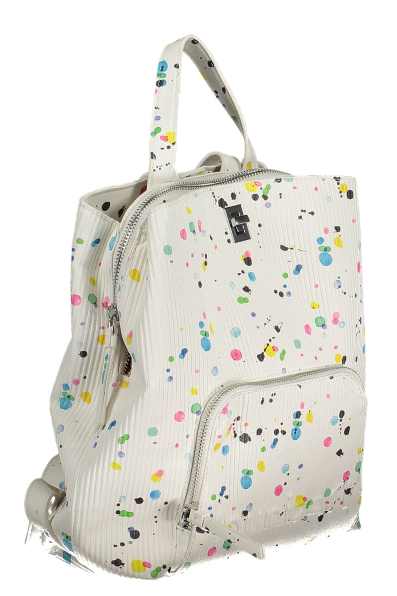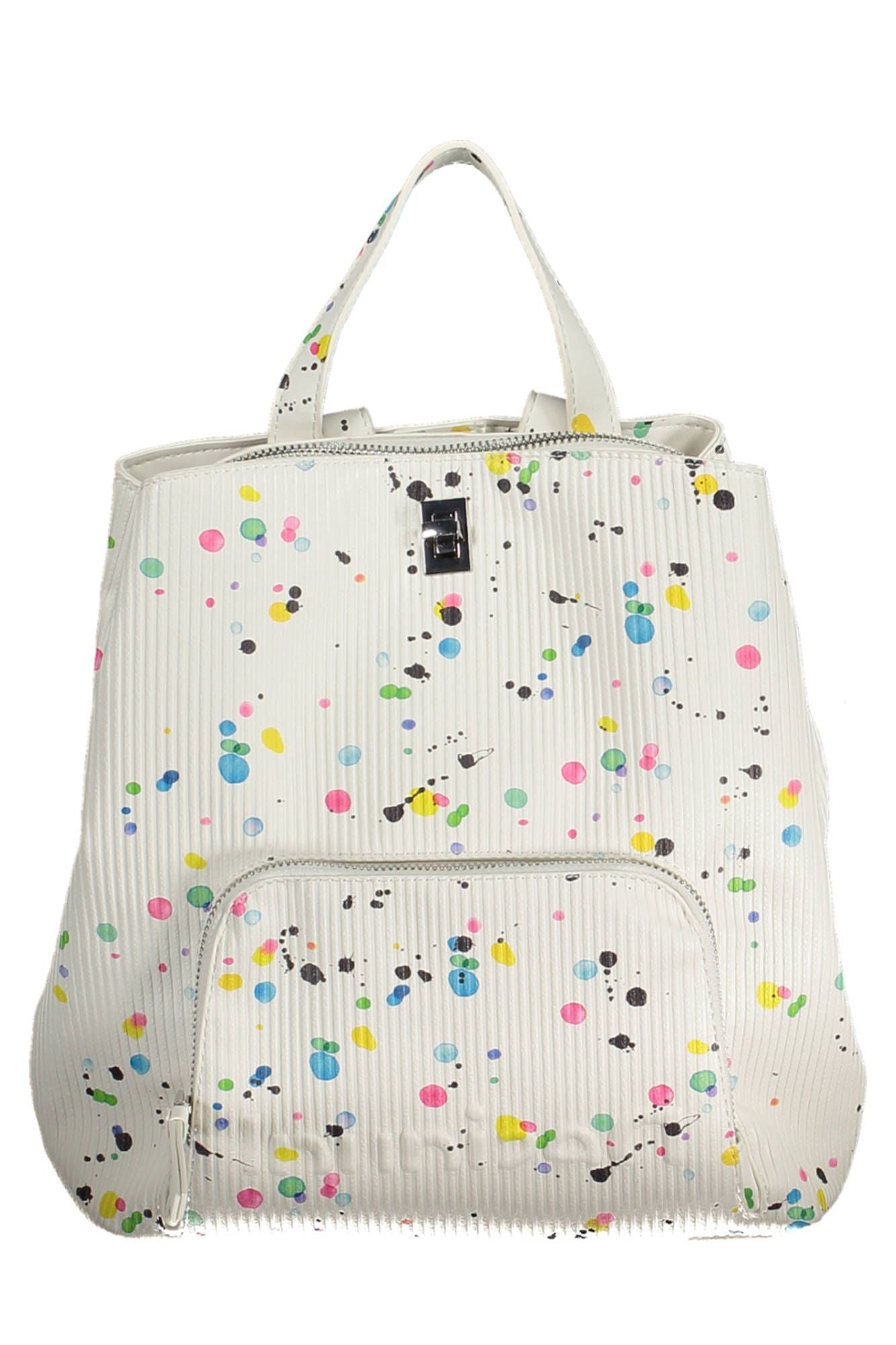 Embrace functionality with a dash of style with this white Desigual backpack, perfect for the fashion-forward individual on the go. Featuring adjustable shoulder straps for comfort, a handy external back pocket, additional outer pocket, and three separate compartments to keep your essentials organized. The stylish contrasting details add a touch of elegance, complemented by a secure zip closure, turn lock and snap to keep your belongings safe. Finished with a prominent logo that showcases your love for the brand. It’s not just a backpack, it’s a statement!