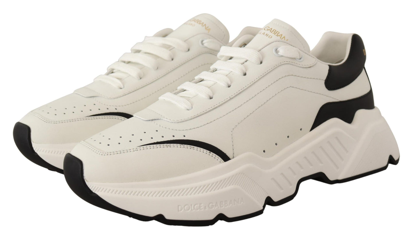 Step up your footwear game with these pristine Dolce & Gabbana White Sneakers, brand new and ready to enhance your ensemble. These Daymaster Sneakers are elegantly crafted from high-quality nappa calfskin leather, and boast a sleek black mirrored heel that will catch the light and gazes alike. Equipped with a super flexible rubber sole, these sneakers epitomize comfort without compromising on style. Each step you take will be a statement with the iconic logo detail, a hallmark of luxury and refinement. Made with care in Italy, these sneakers are not just a pair of shoes but a testament to impeccable craftsmanship and timeless design.