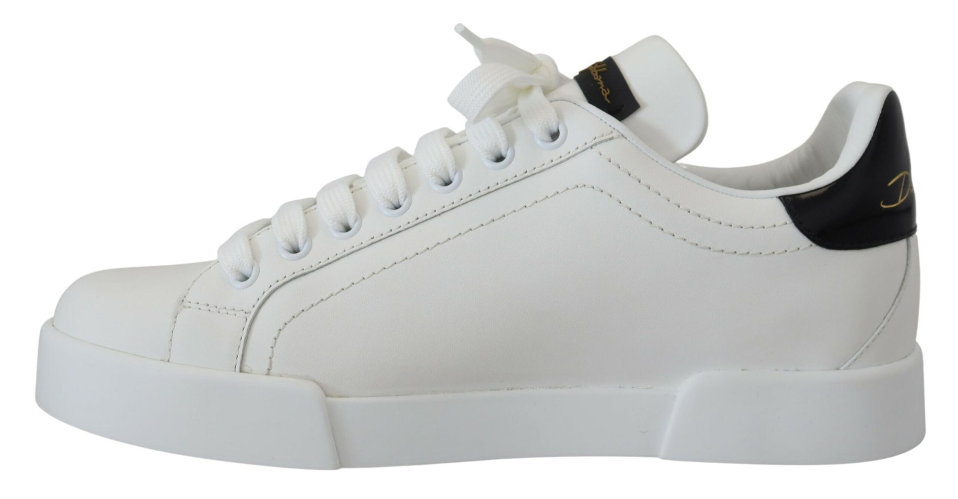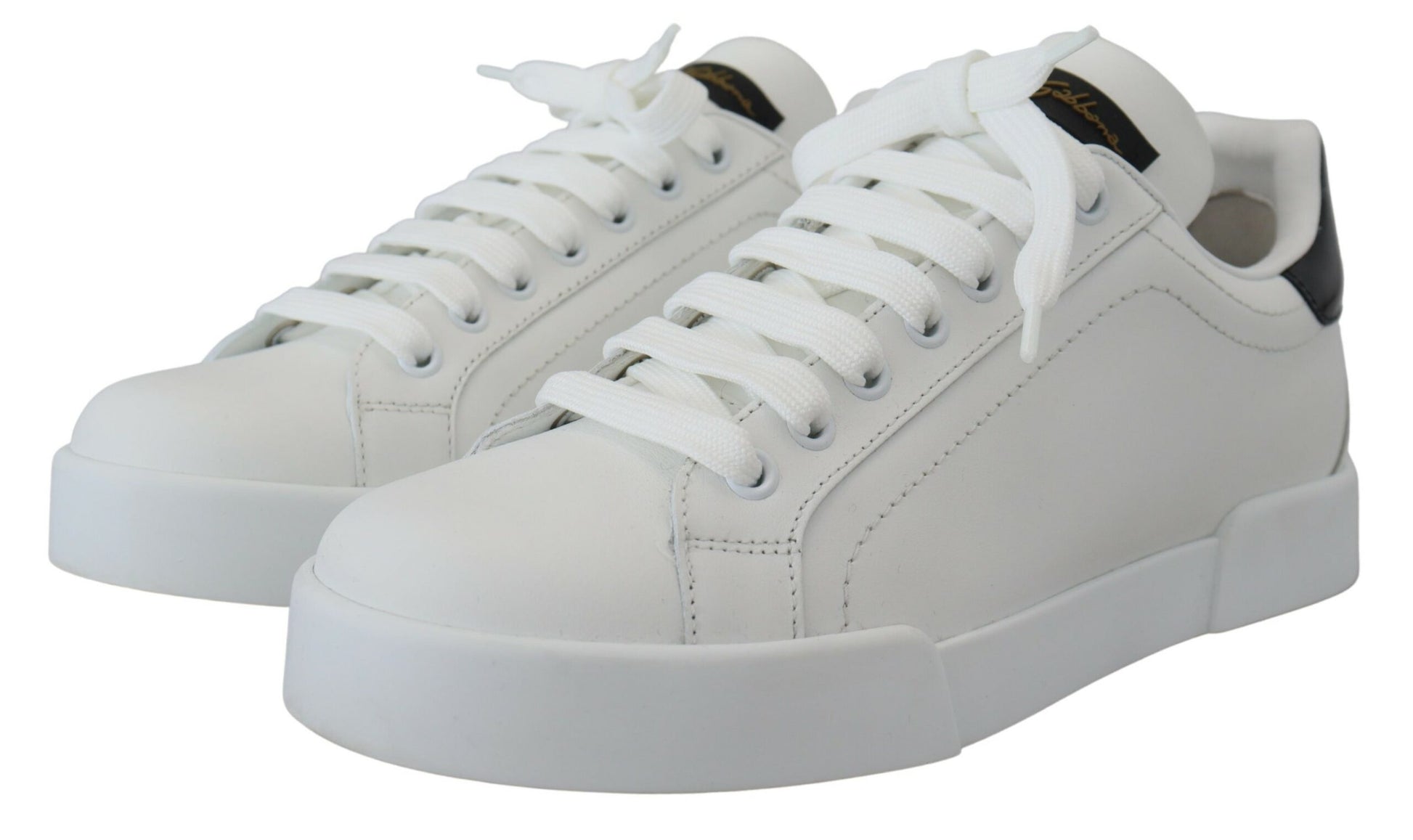Indulge in the elegance of high fashion with these exquisite sneakers from Dolce & Gabbana. These brand-new, tag-inclusive sneakers are not just footwear but a statement of luxury. The pristine white surface color matched with a contrasting black accentuates their classic Portofino design. Detailed with a chic lace-up feature and the iconic logo, they reflect sophistication with an athletic twist. Crafted from the highest quality leather, they promise both comfort and durability, while the rubber sole ensures you enjoy every step with a resilient spring. Made in Italy, these sneakers embody an exclusive and commendable craftsmanship that’s synonymous with the prestige of Dolce & Gabbana.