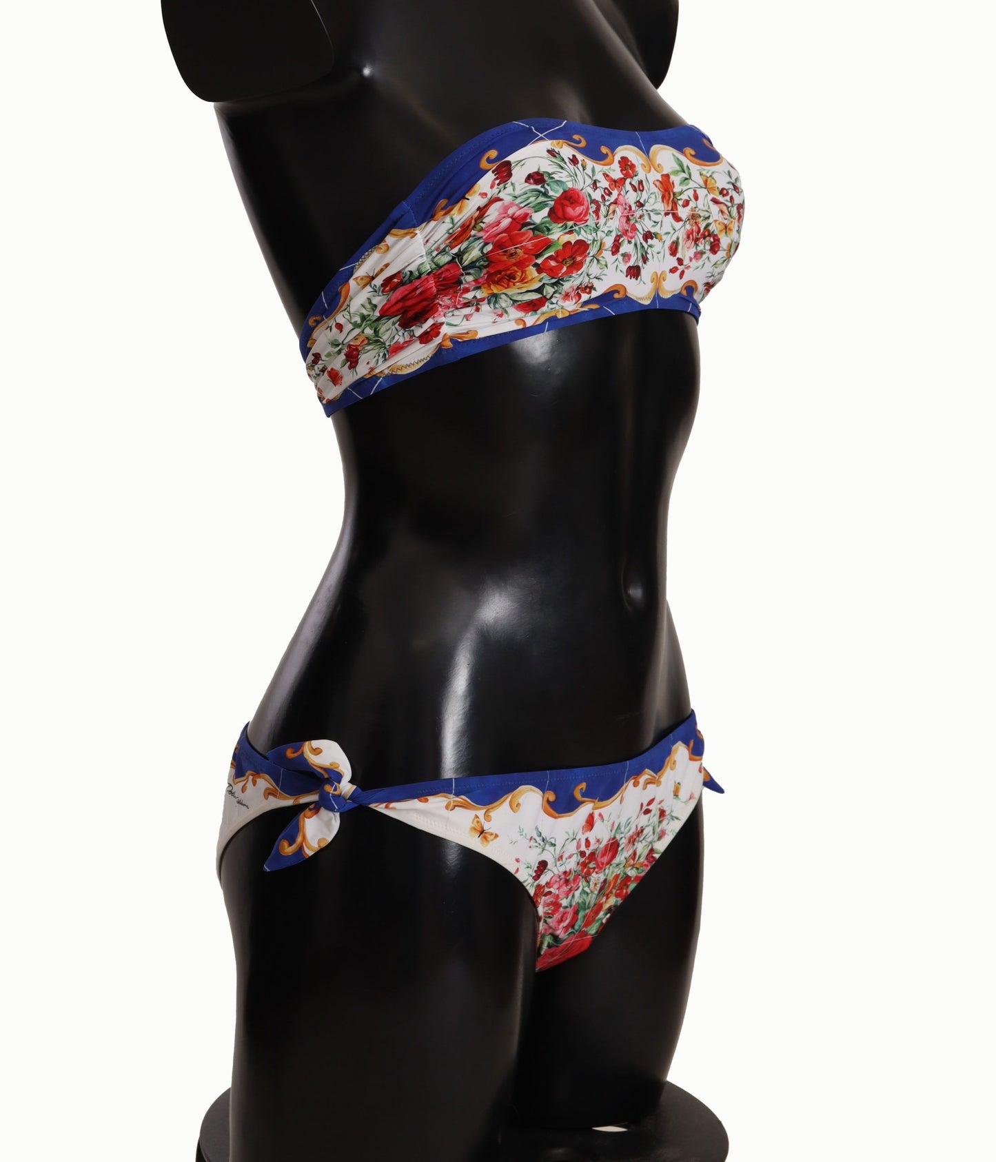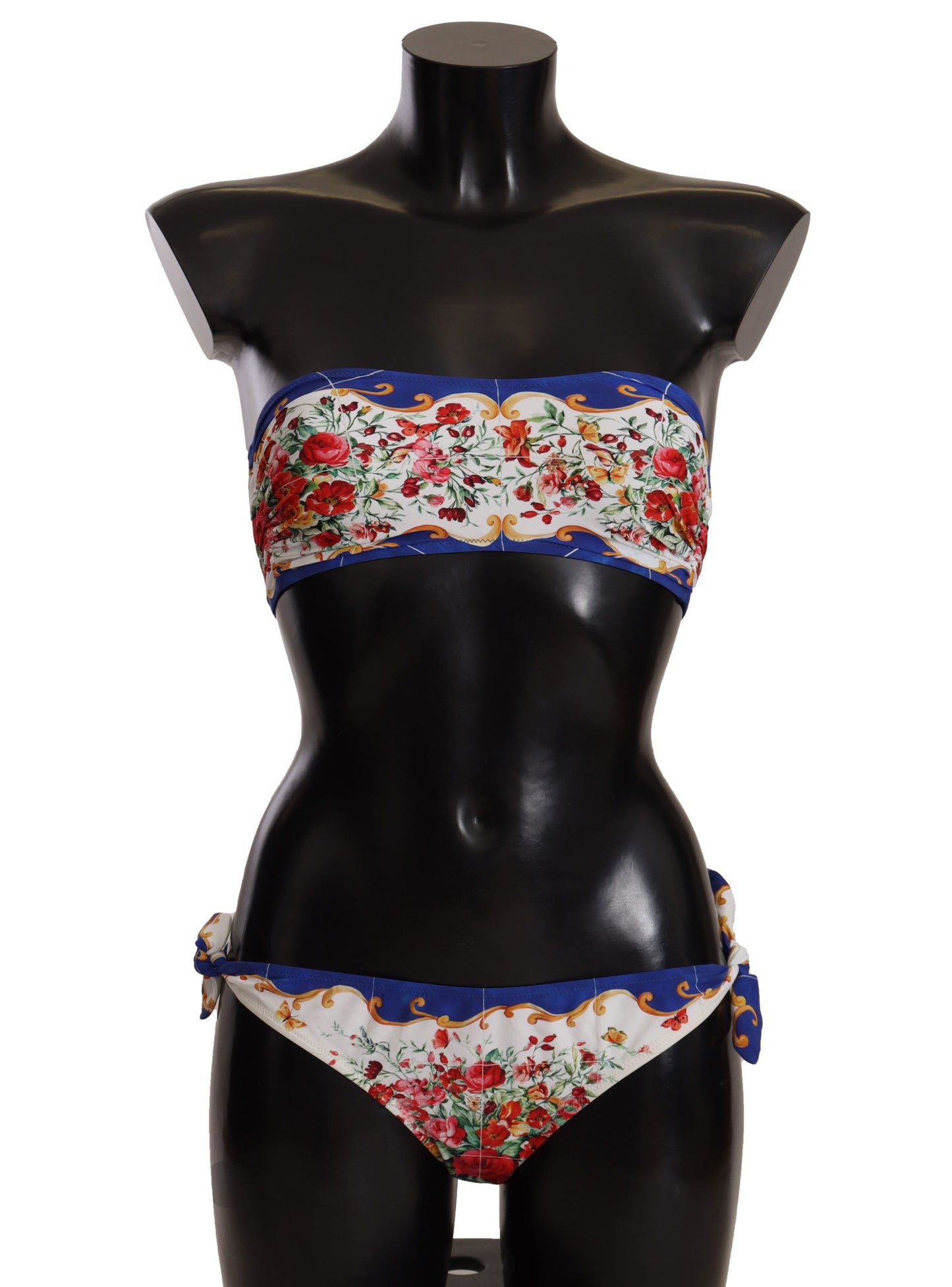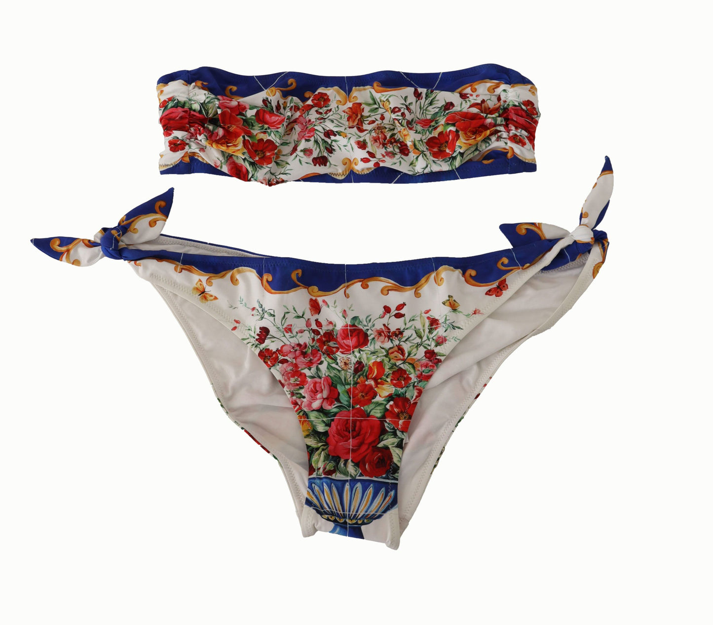 Step into the sun with this stunning two-piece bandeau bikini from Dolce & Gabbana. Impeccably designed with a bright and vivacious white and blue floral pattern, this swimsuit ensures a classy yet playful beach look. The graceful bandeau bodice, free from additional straps, combines style and comfort, perfect for basking in the luxury of Italian fashion. A back closure secures the top, promising both support and a seamless silhouette. Indulge in this beautiful ensemble, which reflects impeccable craftsmanship and Dolce & Gabbana’s eye for exquisite details.