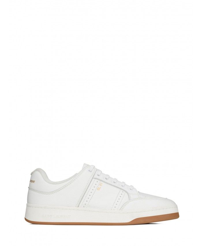 Elevate your sneaker game with these pristine white, low-top sneakers crafted from sumptuous calf leather. With their stylish lace-up design, perforated toe, and the iconic gold-tone Saint Laurent logo adorning the heel, these shoes are a symbol of high fashion and sophistication. Each step reveals the exquisite detail of the tone-on-tone logo embossed on the outsole while flaunting the ‘SL 61’ gold-tone signature on the side. Complete with original tags, dustbag, and box, they are ready to step up your wardrobe. Made with love in Italy.