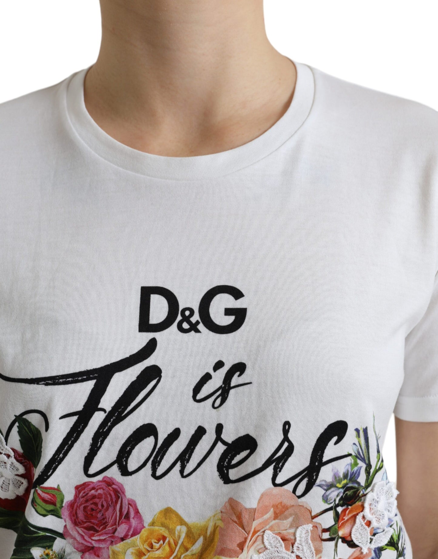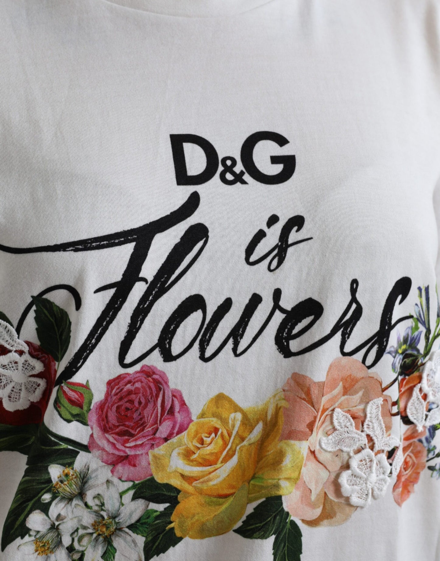 Step into the world of high-end style with a Gorgeous and Authentic crew neck t-shirt from Dolce & Gabbana. This charming ‘DG Is Flower’ tee boasts intricate logo details on a pristine white canvas, offering both comfort and craftsmanship with its 100% cotton material. A true blend of luxury and casual elegance, made with love in Italy.