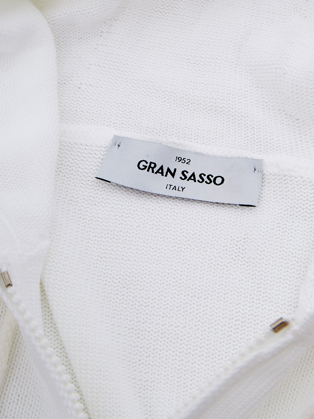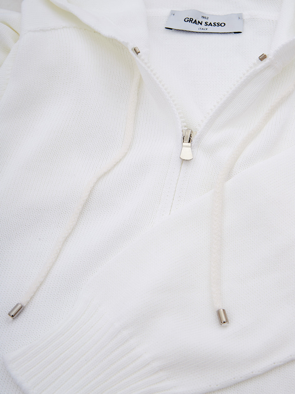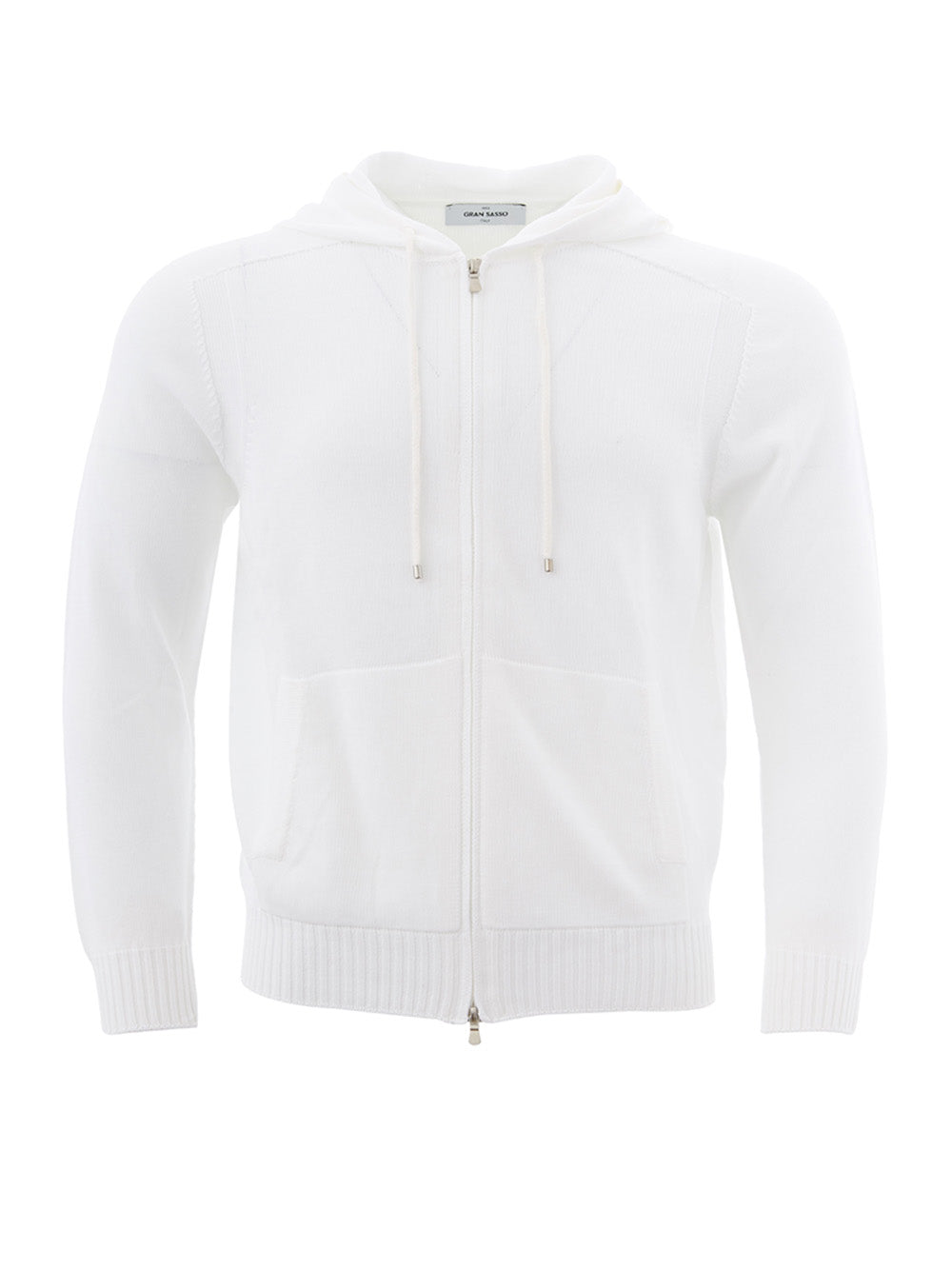 Introducing the epitome of sophistication and comfort—our Gran Sasso white cotton hooded sweater. This brand new item comes with tags and is crafted in Italy, ensuring top-notch quality and style. It features a stylish knitwear effect, full zip front closure, two handy side pockets, and an adjustable hood for a personalized fit. Its regular fitting silhouette makes it a versatile addition to your wardrobe, perfect for those who appreciate luxury and laid-back elegance.