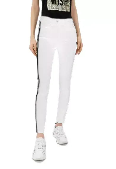 Elevate your wardrobe with these stylish white trousers, featuring sleek black side bands embellished with subtle studs for that extra flair. Designed to offer a snug yet comfortable fit, these trousers are crafted to complement your silhouette, complete with convenient zip and button closure.
