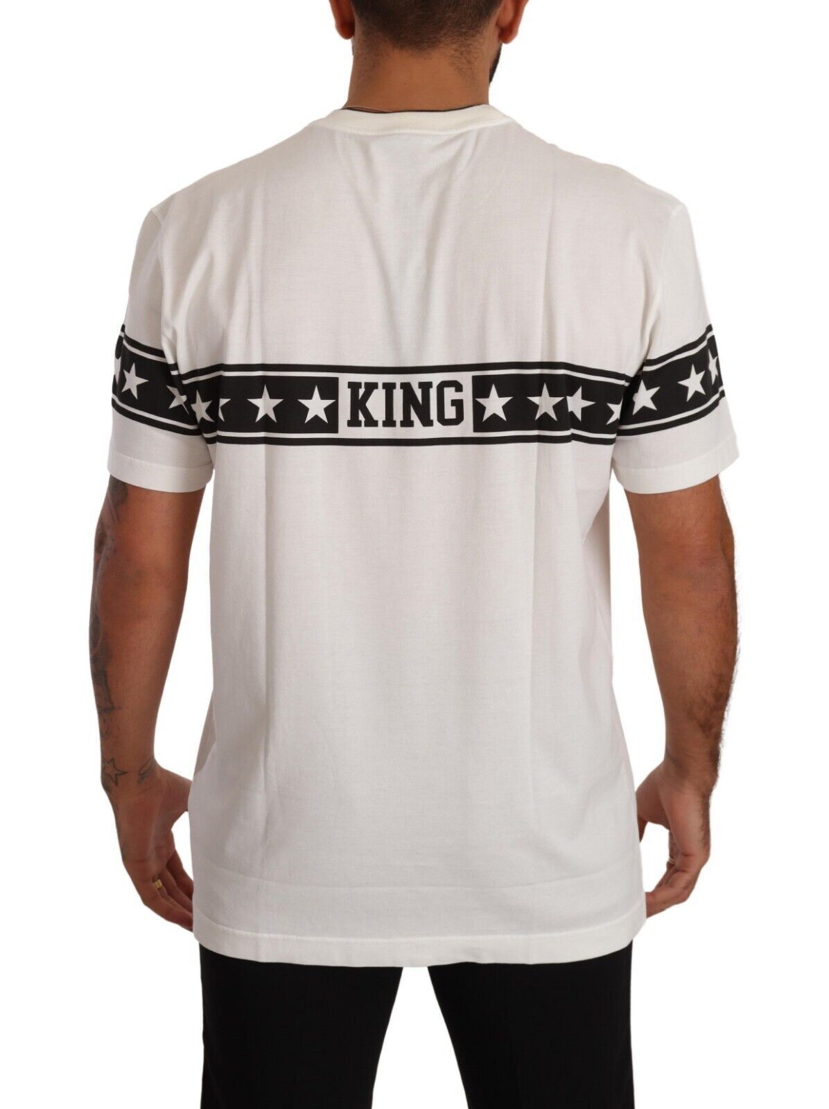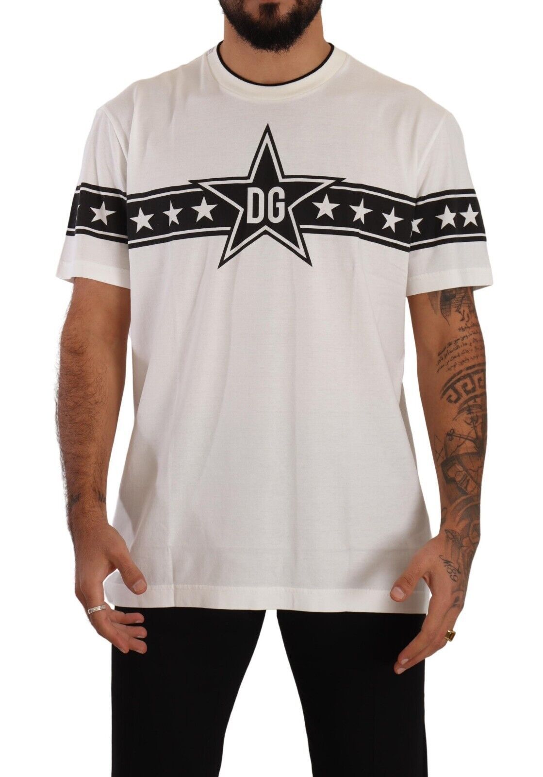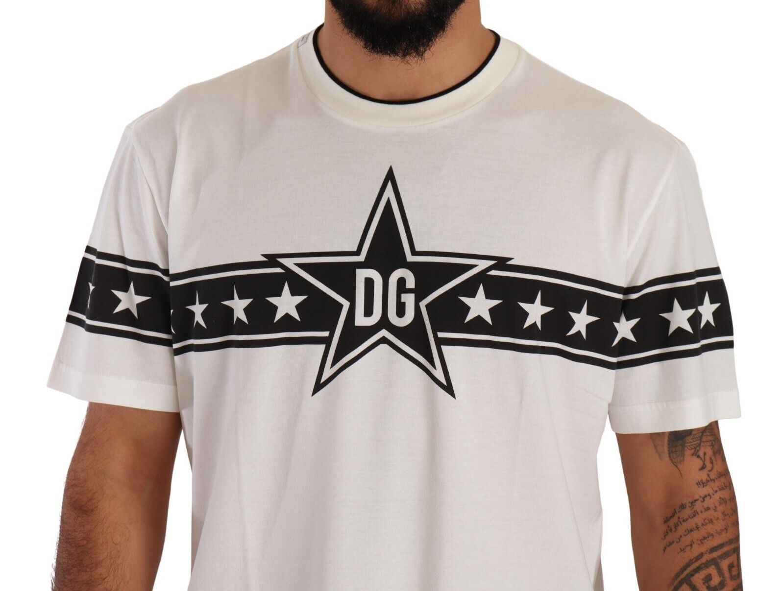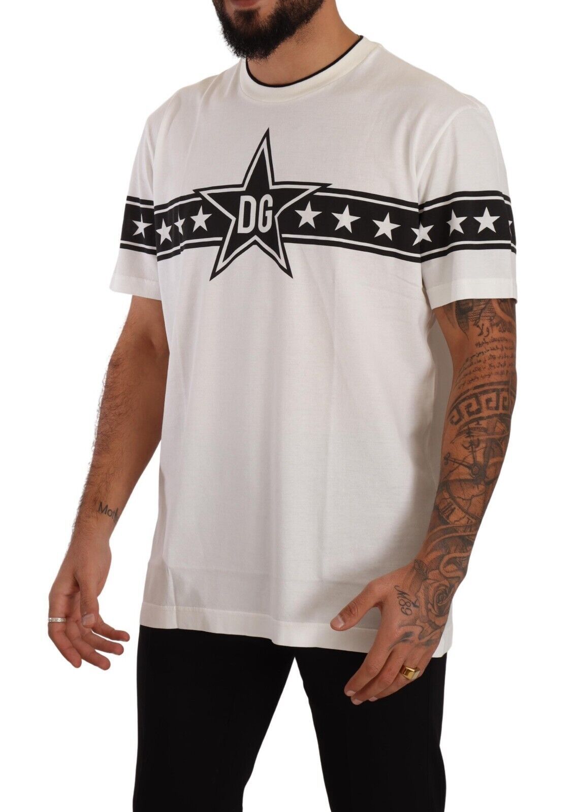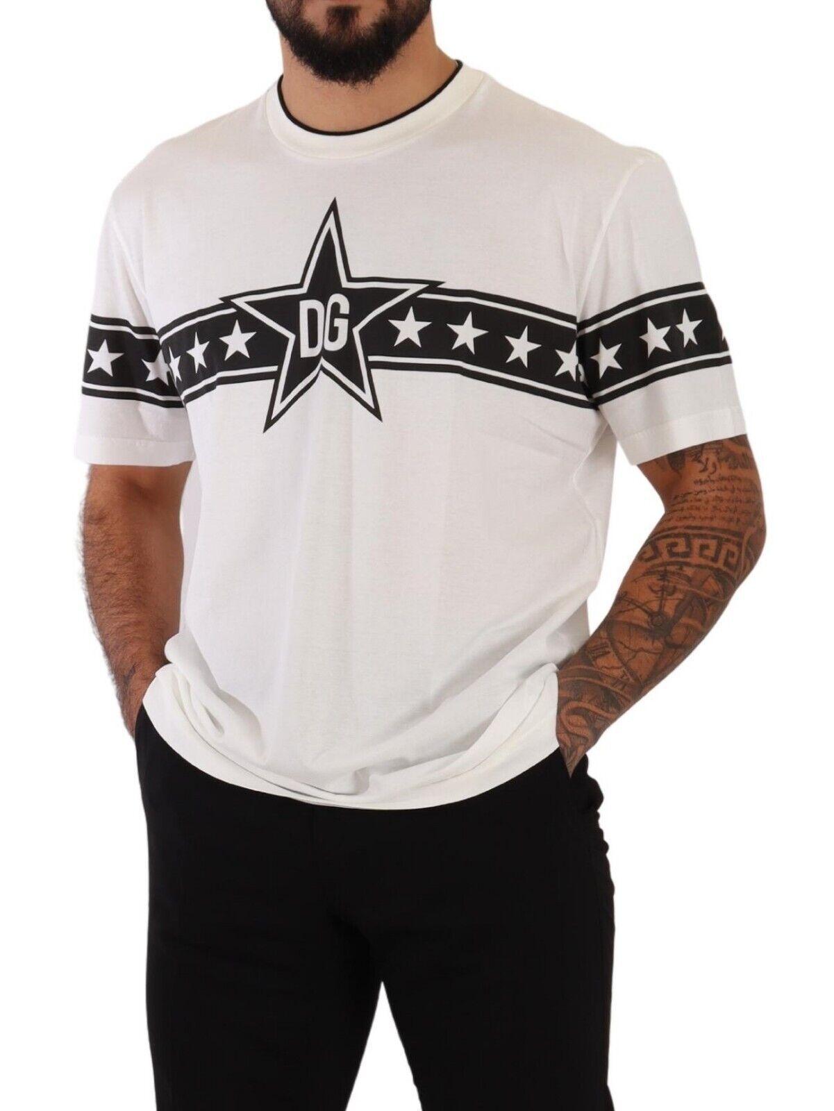 Indulge in the epitome of Italian craftsmanship with this 100% Authentic Dolce & Gabbana cotton t-shirt. Adorned with a logo stars print, this pristine white tee features a classic crew neckline and short sleeves – an embodiment of style and comfort. Perfect for those who appreciate luxury in their everyday wardrobe.