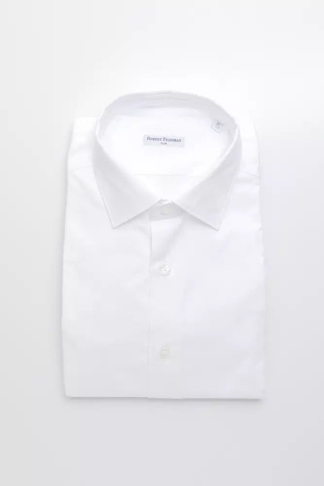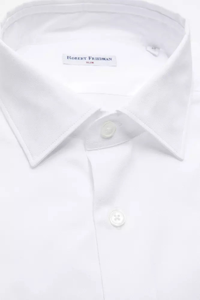 Discover the epitome of chic sophistication with Robert Friedman’s medium slim collar shirt. Immaculately tailored to provide a sleek silhouette, this piece is a timeless addition to your wardrobe. Created with high-quality cotton, it affords comfort and durability seamlessly blended with style. Its pristine white hue ensures versatility — a go-to shirt for business meetings or high-end social events.