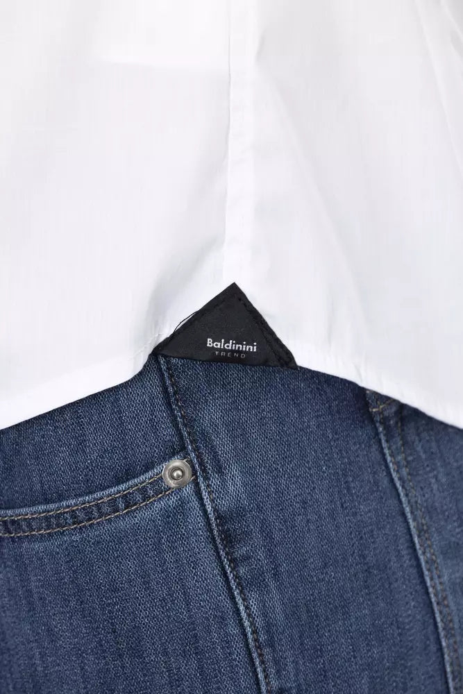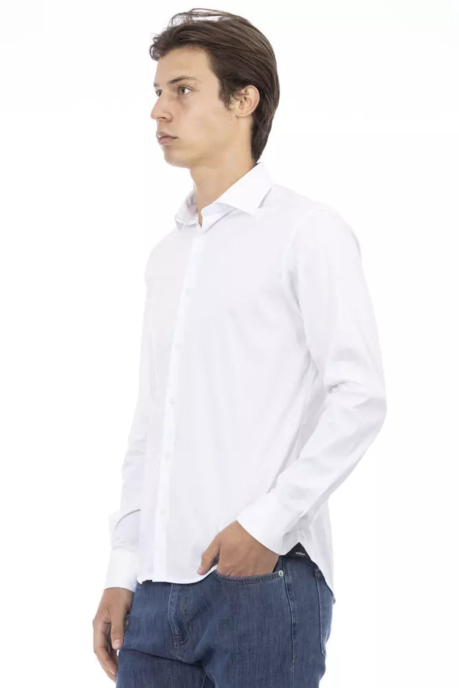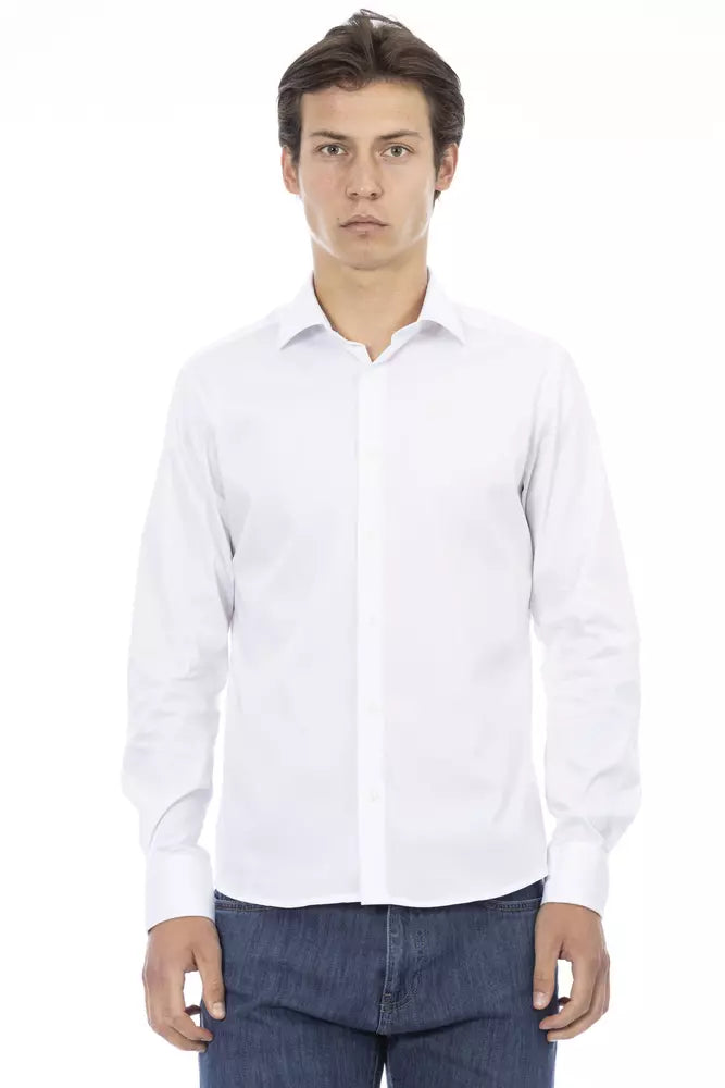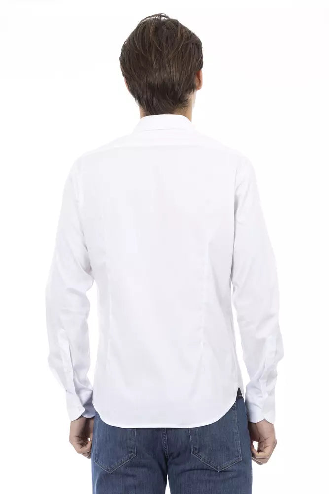 Embrace the epitome of Italian elegance with this sleek, white slim shirt from Baldinini Trend. Designed for the modern man, this shirt features a sharp Italian collar and a smooth front button closure. The subtle insert with the brand’s logo, as well as the musket bearing the distinctive logo, adds a touch of luxe to your wardrobe. Ideal for both formal and fashion-forward occasions.