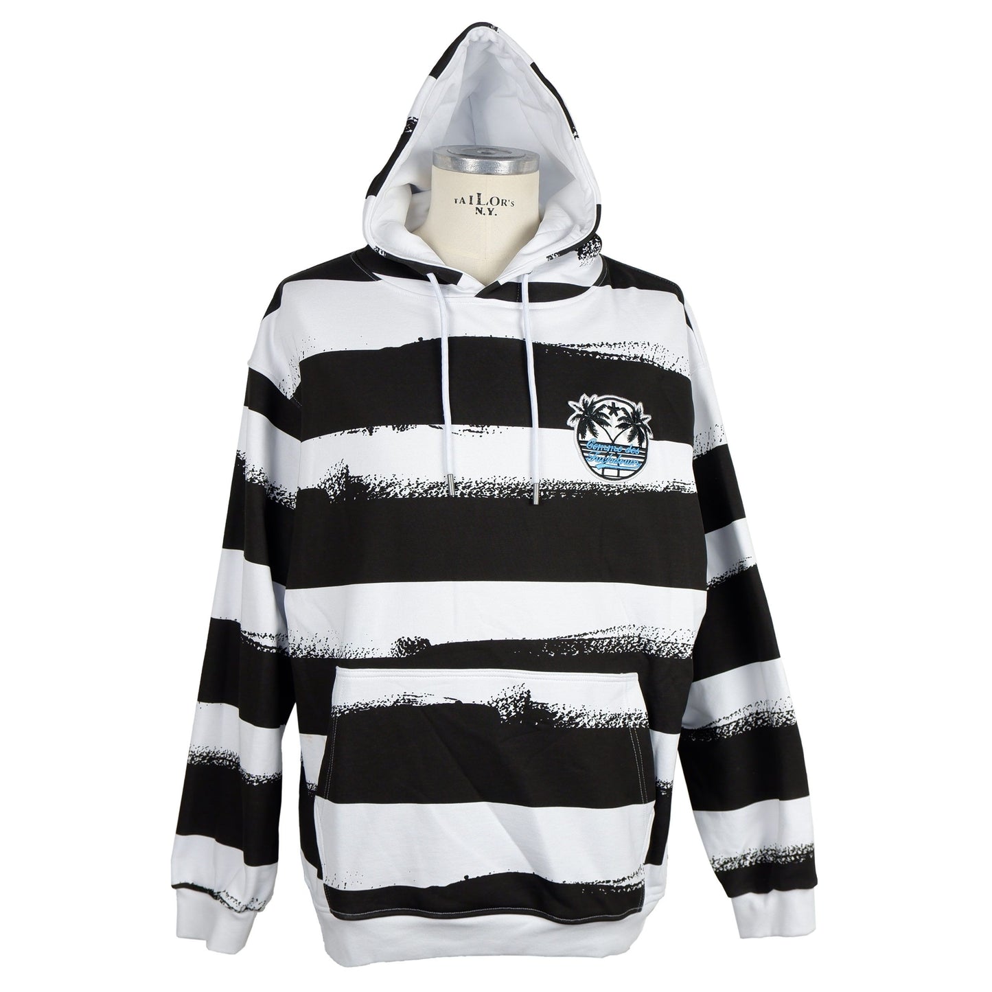 Elevate your casual ensemble with our Striped Logo Patch Cotton Sweatshirt, a perfect blend of style and comfort. This sweatshirt features a bold black and white striped print, an eye-catching embroidered logo patch on the front, a cozy hood with drawstring, and a convenient large front pocket.