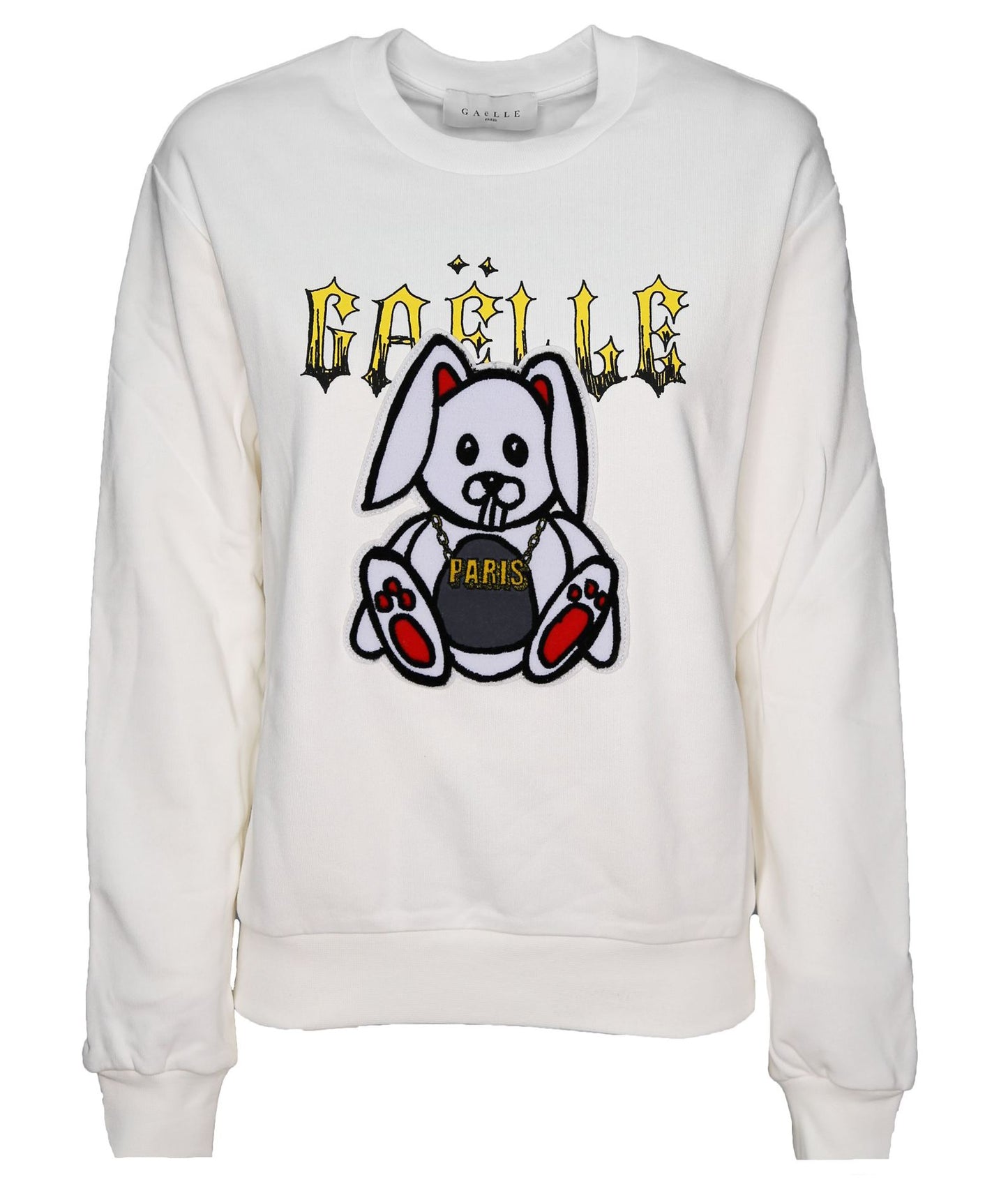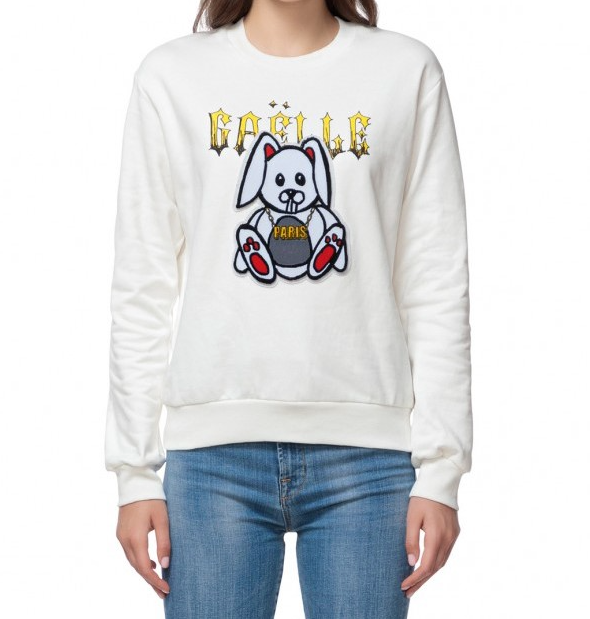 Embrace understated elegance with this pristine white crewneck sweater, featuring a sleek GAELLE logo print and a luxurious velvet patch on the front. Perfect for those who appreciate a blend of casual comfort and sophisticated style.
