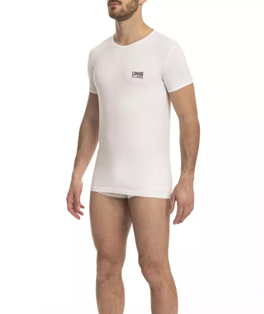 Step up your style game with this Cavalli Class White Crew Neck T-shirt. This top is not only a blend of comfort and chic, but it also flaunts the brand’s sleek logo, adding a touch of class to its simple elegance. Perfect for those who appreciate a refined yet laid-back look.