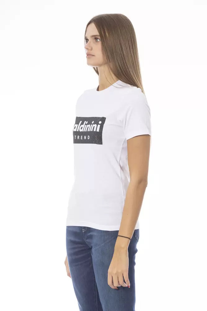 Exude effortless style with this pristine White Cotton T-shirt featuring a sleek crew neck and short sleeves, adorned with a distinctive Baldinini Trend print on the front – a subtle nod to the brand’s fashion-forward aesthetics. Perfect for adding a touch of luxury to your casual ensembles.