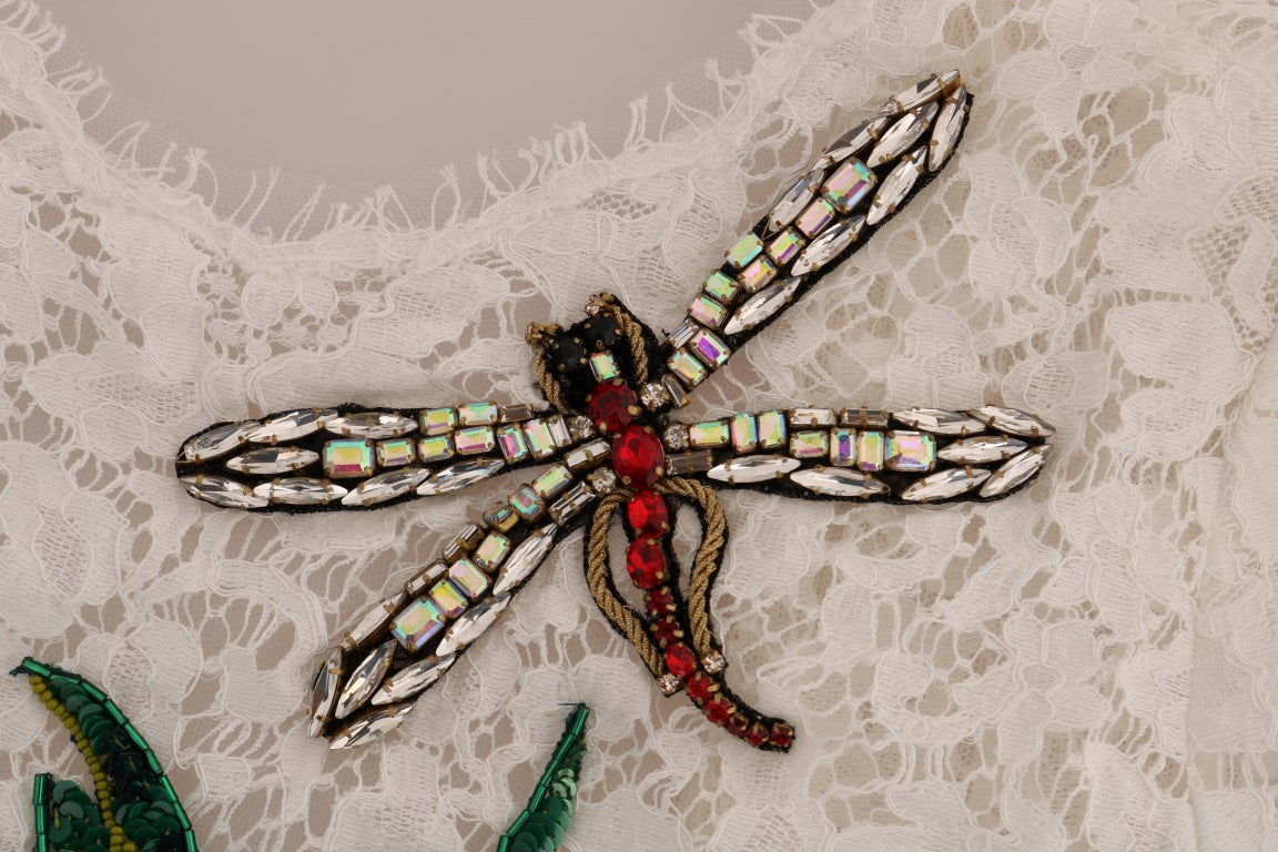 Step into a world of unparalleled sophistication with our exquisite Dolce & Gabbana white lace embellished mini blouse. Intricately designed with intricate lace detail, this blouse features captivating sequined embellishments, including a tropical pineapple, banana leaf motifs, and a charming firefly, all artfully arranged to create a stunning visual impact. Impeccably made in Italy with the highest craftsmanship, this blouse is a testament to luxury and style, perfect for those who demand excellence and elegance in their wardrobe.
