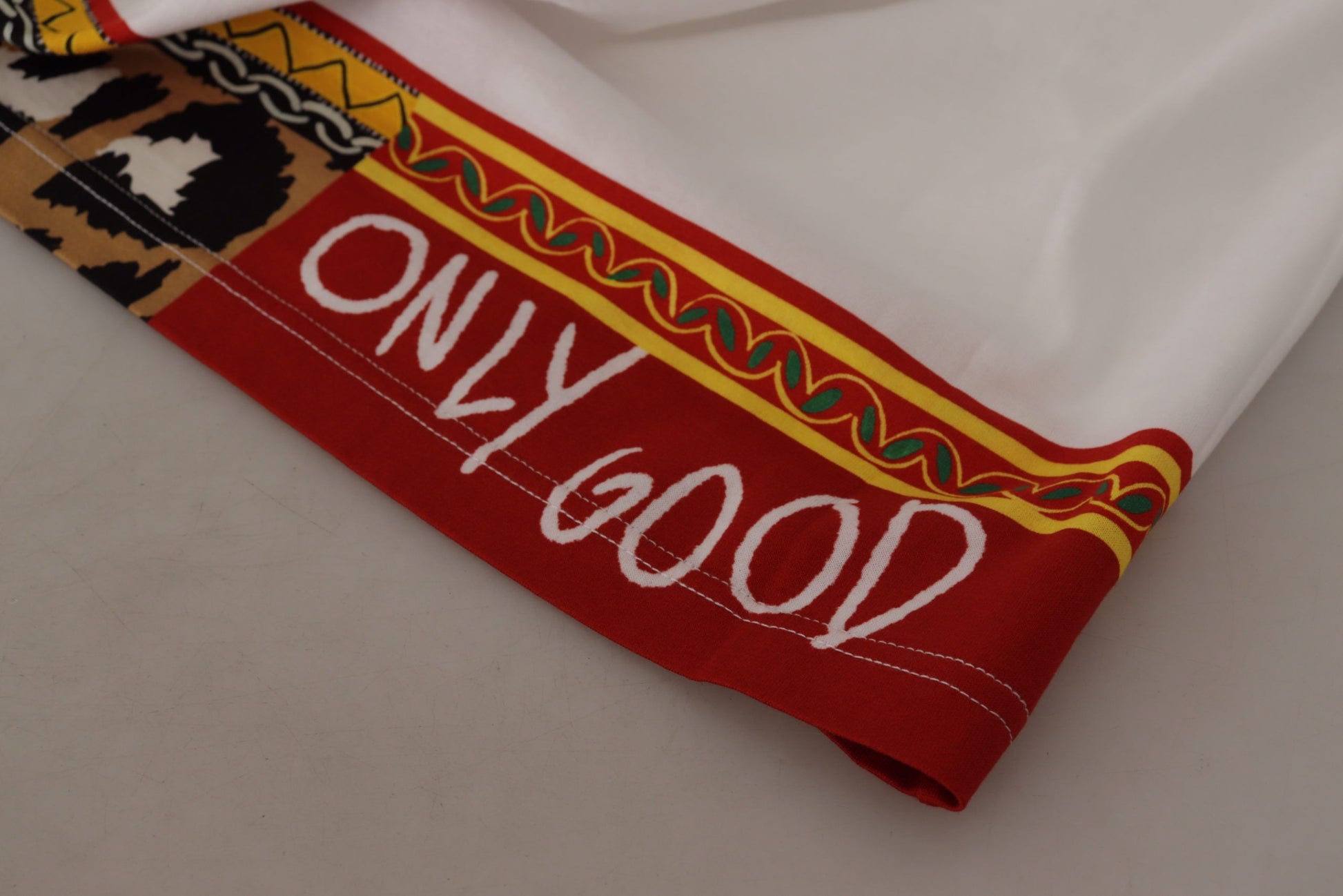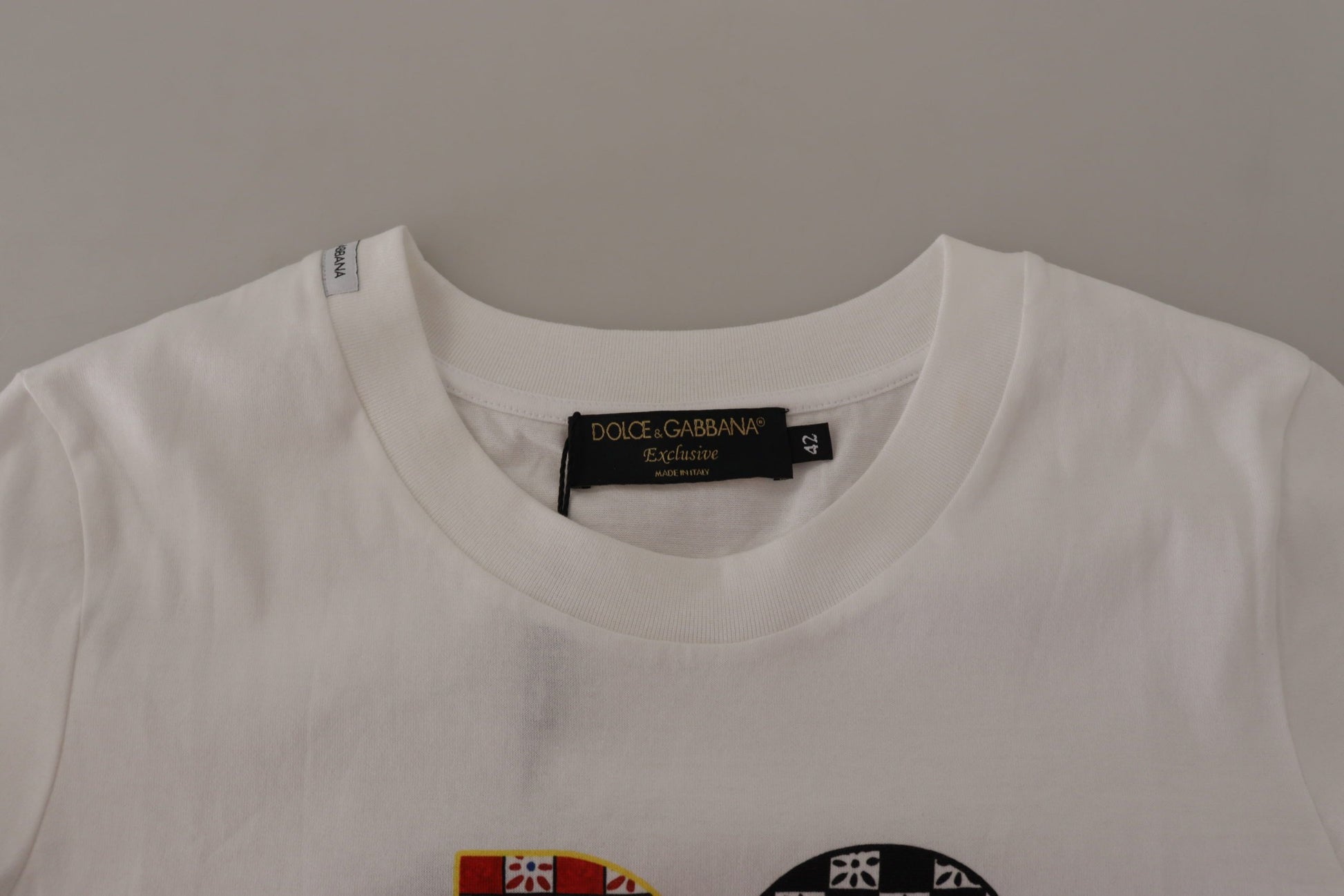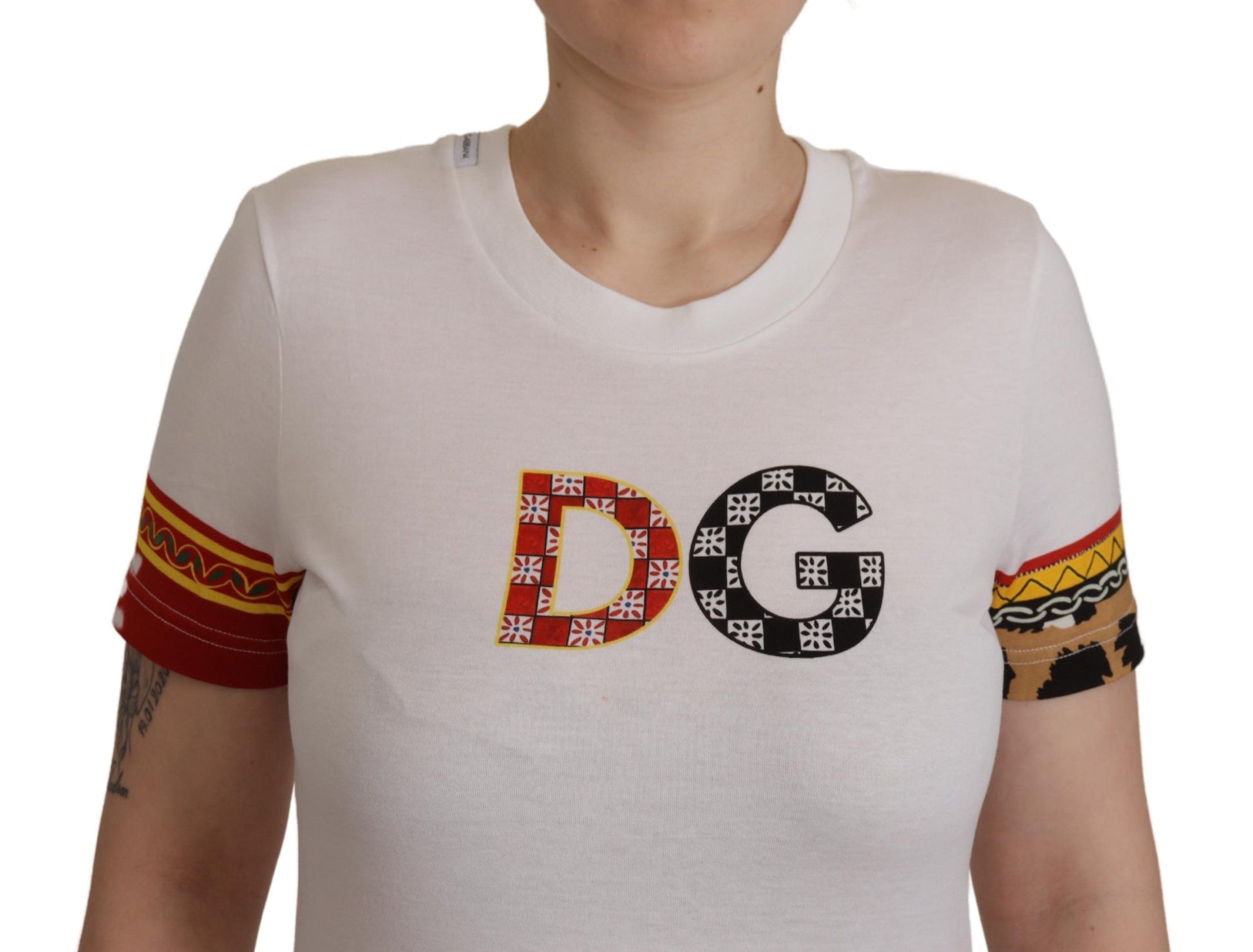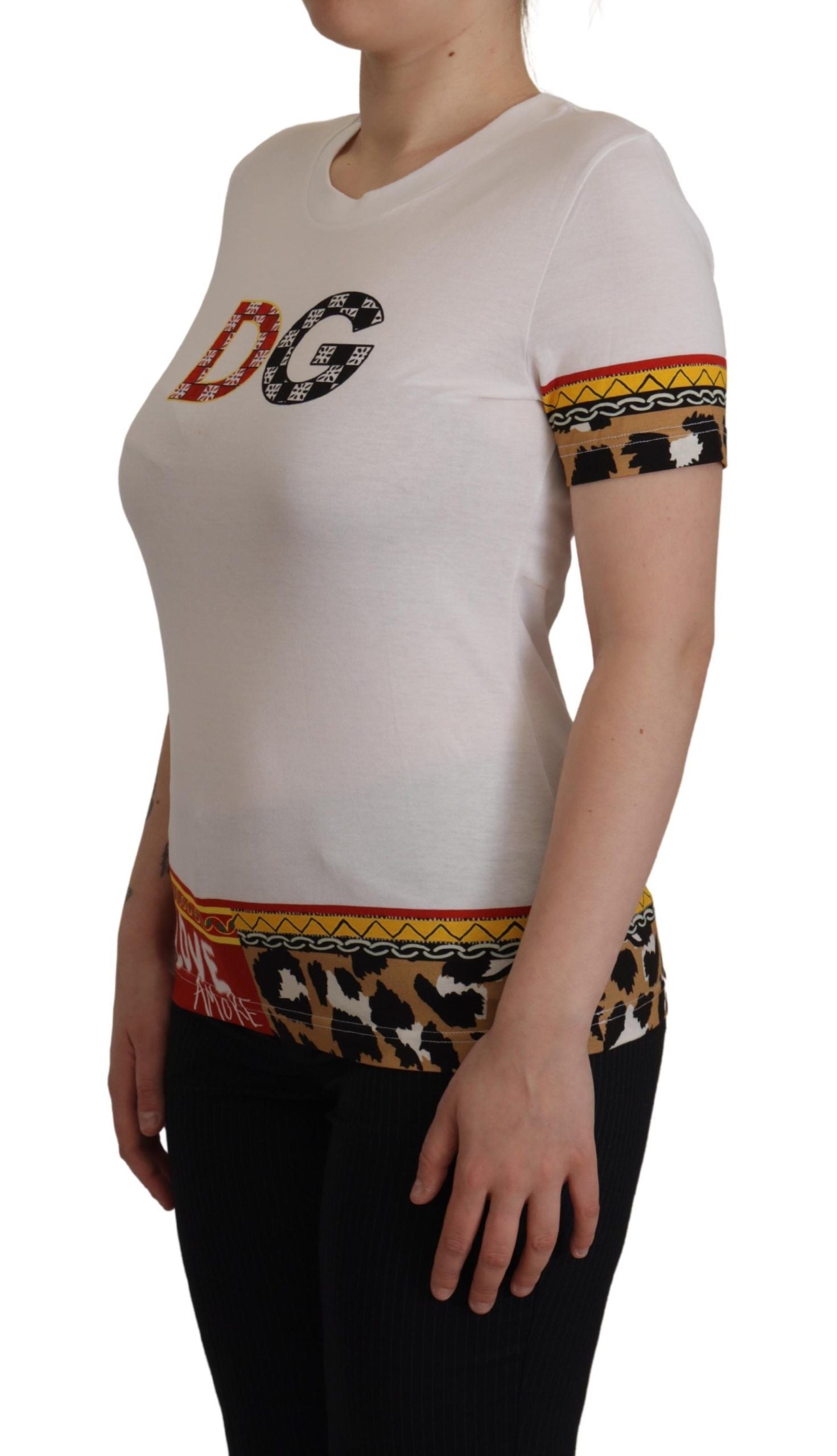 Discover the epitome of Italian craftsmanship with this Dolce & Gabbana short-sleeved blouse top. Featuring a chic patchwork print, this round neck T-shirt is a versatile addition to your wardrobe, ensuring both comfort and elegance with its high-quality cotton fabric. Perfect for pairing with denim or tailored pants, it brings a touch of luxury to everyday attire. Logo details subtly showcase the iconic brand, while the classic white hue makes it a timeless piece.