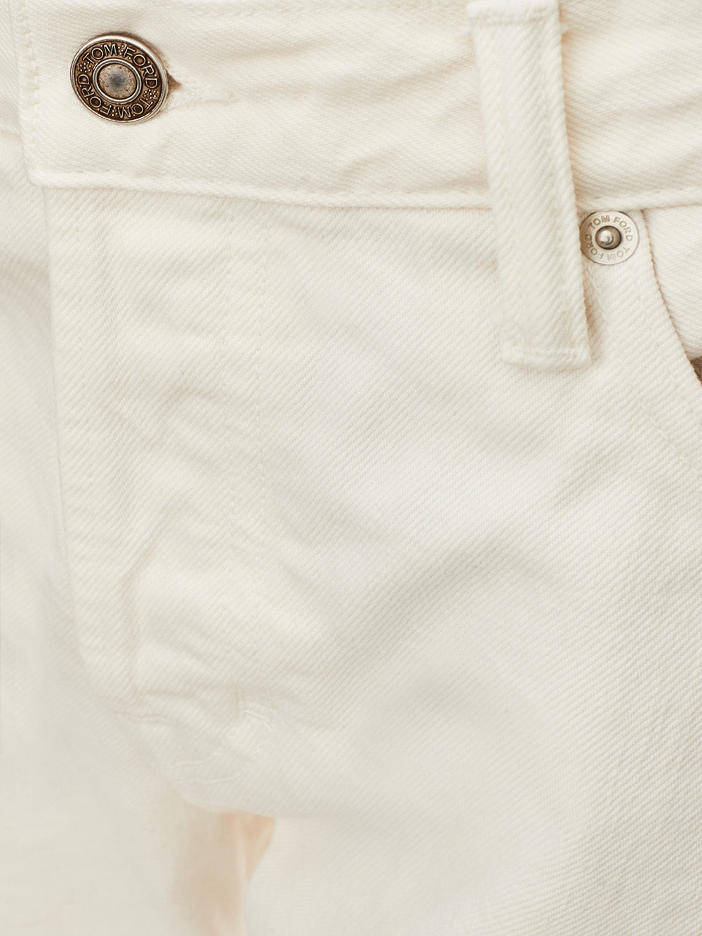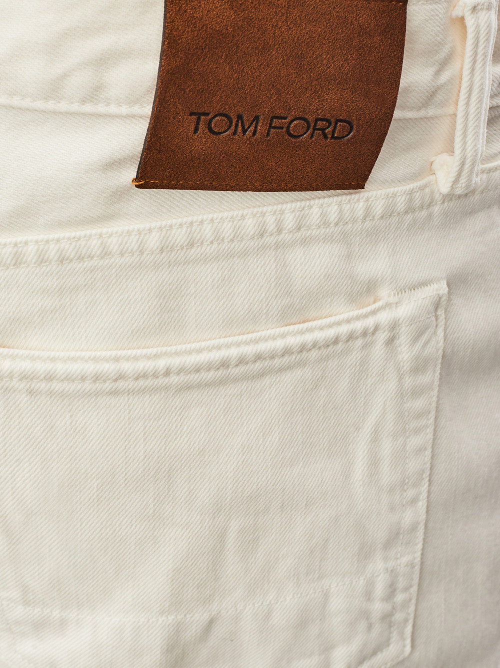 Indulge in the epitome of sophistication with our stunning white denim. This pair is not just any ordinary addition to your wardrobe; it’s a statement of luxury and style. Crafted from premium 100% cotton, these slim-fit jeans by Tom Ford offer a seamless blend of comfort and elegance. Perfect for casual outings or upscale events, they feature two side pockets, a charming tiny pocket, and two back pockets for functionality without compromising on fashion. A distinct leather tag adorned with the Tom Ford logo provides an exclusive touch of branding to these crisp white jeans, meticulously made in Italy.
