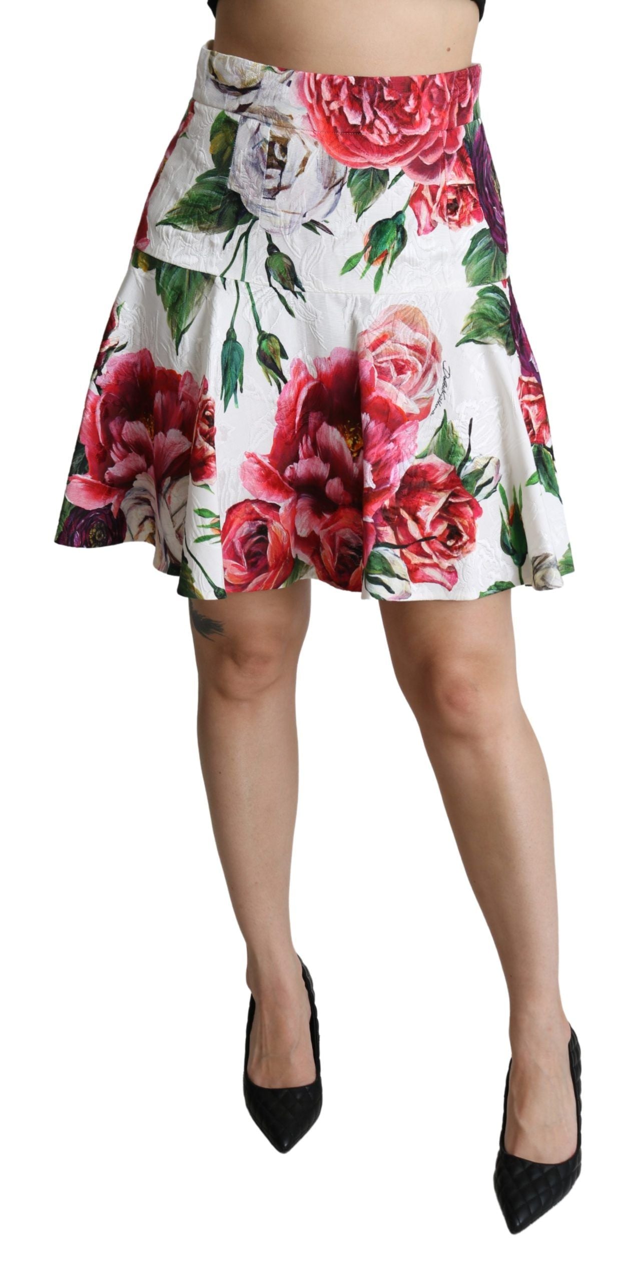 Discover the epitome of luxury Italian craftsmanship with this stunning Dolce & Gabbana floral brocade A-line mini skirt. A true representation of high-end fashion, this skirt boasts a vibrant white floral design, perfect for adding a touch of elegance to any outfit. Tailored to accentuate your waistline, it promises to be a timeless wardrobe staple with its flattering A-line cut and discreet zipper closure. Made in Italy, this skirt is a testament to exquisite style and quality.