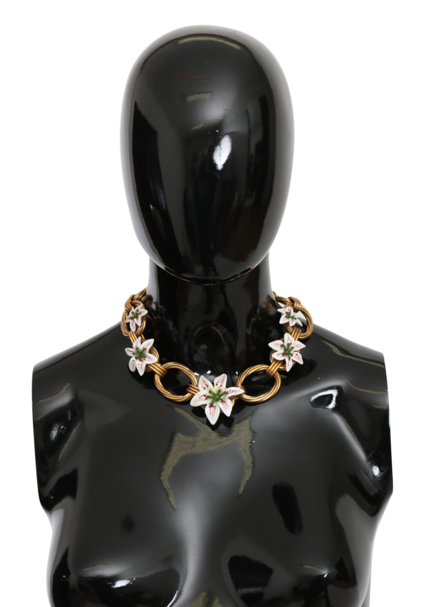 Adorn your neckline with the opulence of Dolce & Gabbana’s Floral Charm Crystal Necklace. This stunning piece showcases a delicate lily flower pendant surrounded by shimmering crystals set in gold-plated brass, perfect for making a glamorous statement. With a comfortable lobster clasp closure and the brand’s iconic logo details, this necklace is a testament to Italian luxury and craftsmanship.