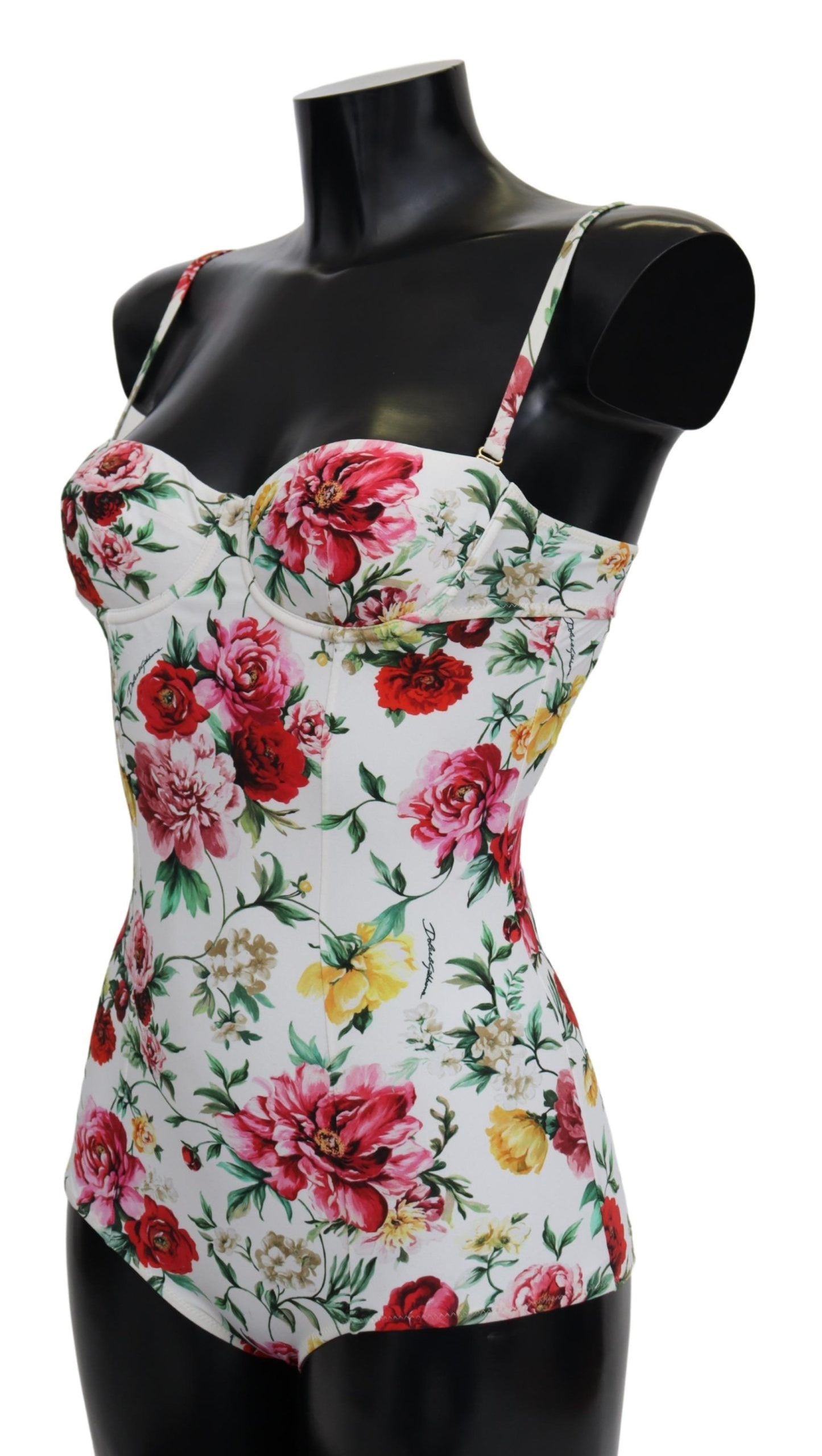 Embrace the sun with the exquisite elegance of Dolce & Gabbana’s Floral One-Piece Swimsuit. This stunning piece is brand new with tags, offering a lush white backdrop adorned with vibrant multicolor floral prints. Crafted in Italy, the blend of 25% elastane and 75% polyamide assures a flattering fit, while the subtle logo detailing adds a touch of luxury. Perfect for those serene beach getaways or lounging by the pool in style.