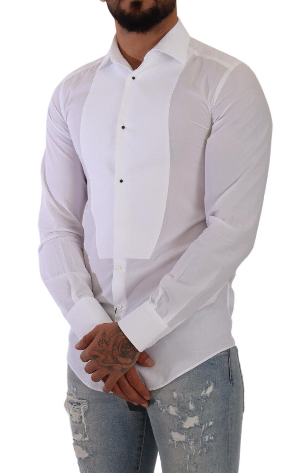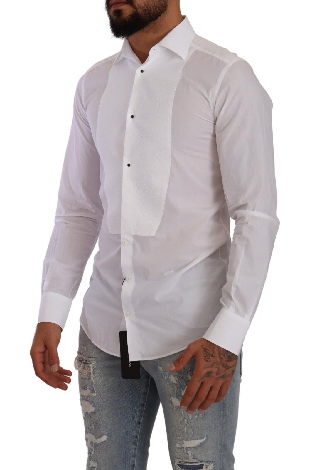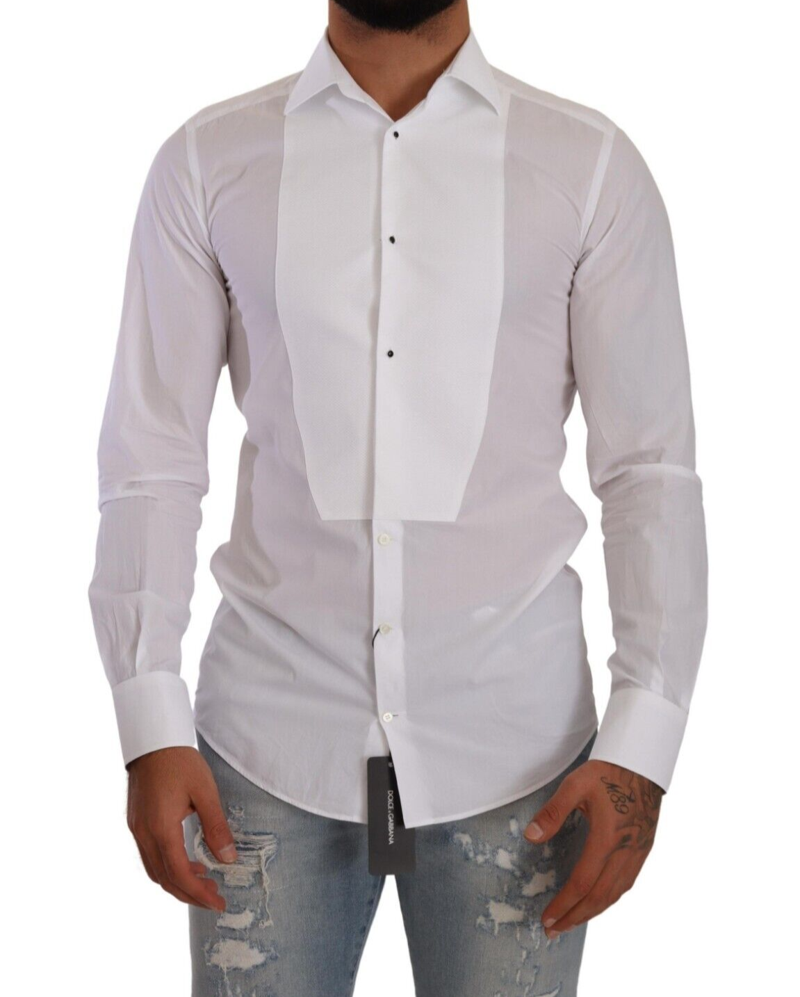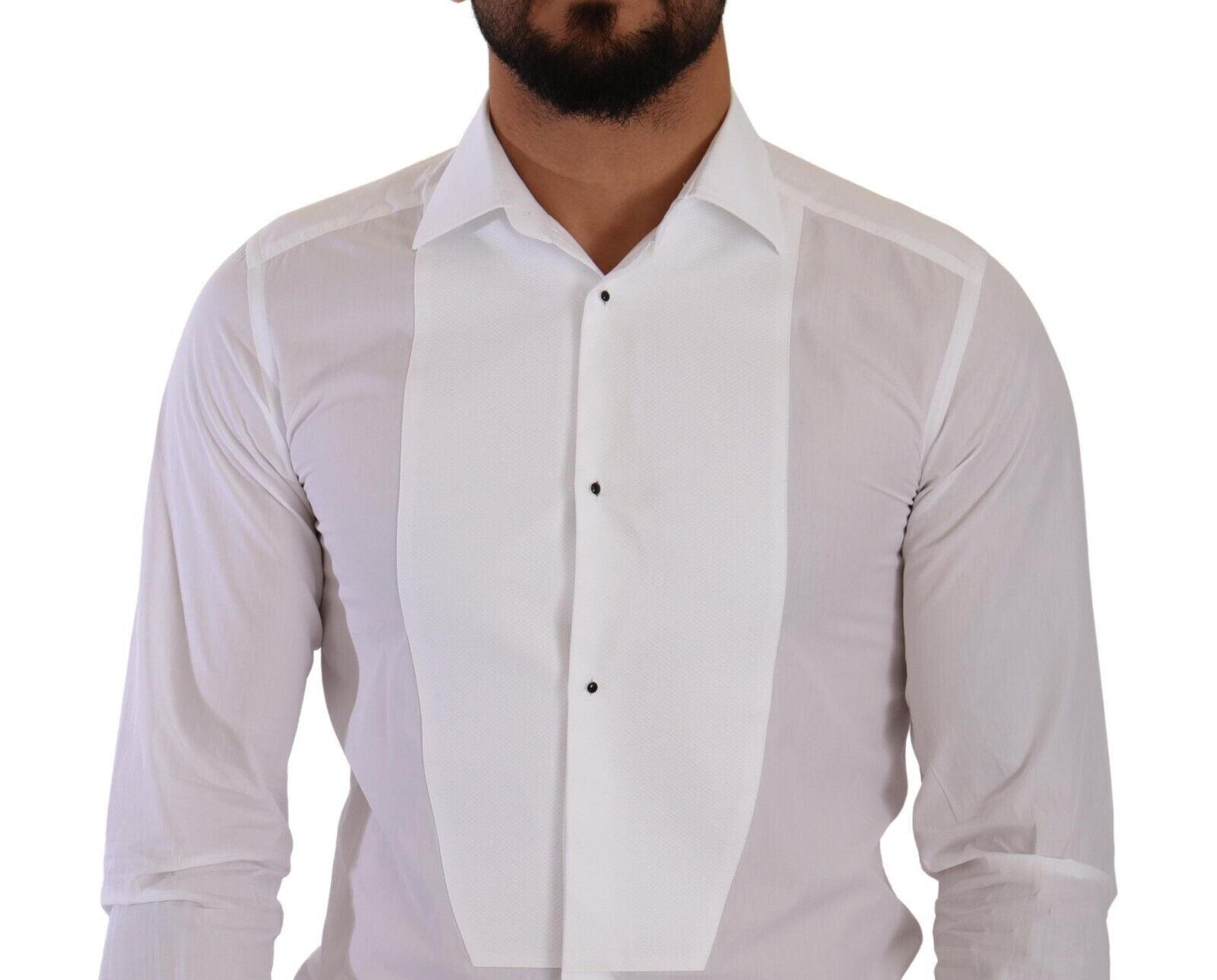 Elevate your formalwear with this absolutely stunning, 100% Authentic Dolce & Gabbana white cotton poplin shirt. This luxurious GOLD line dress shirt features a sophisticated bib with buttons, tailored to a slim fit that ensures a sharp silhouette for any high-class event. Exquisitely crafted in Italy, it boasts elegant front button closure and distinctive logo details for an added touch of class.