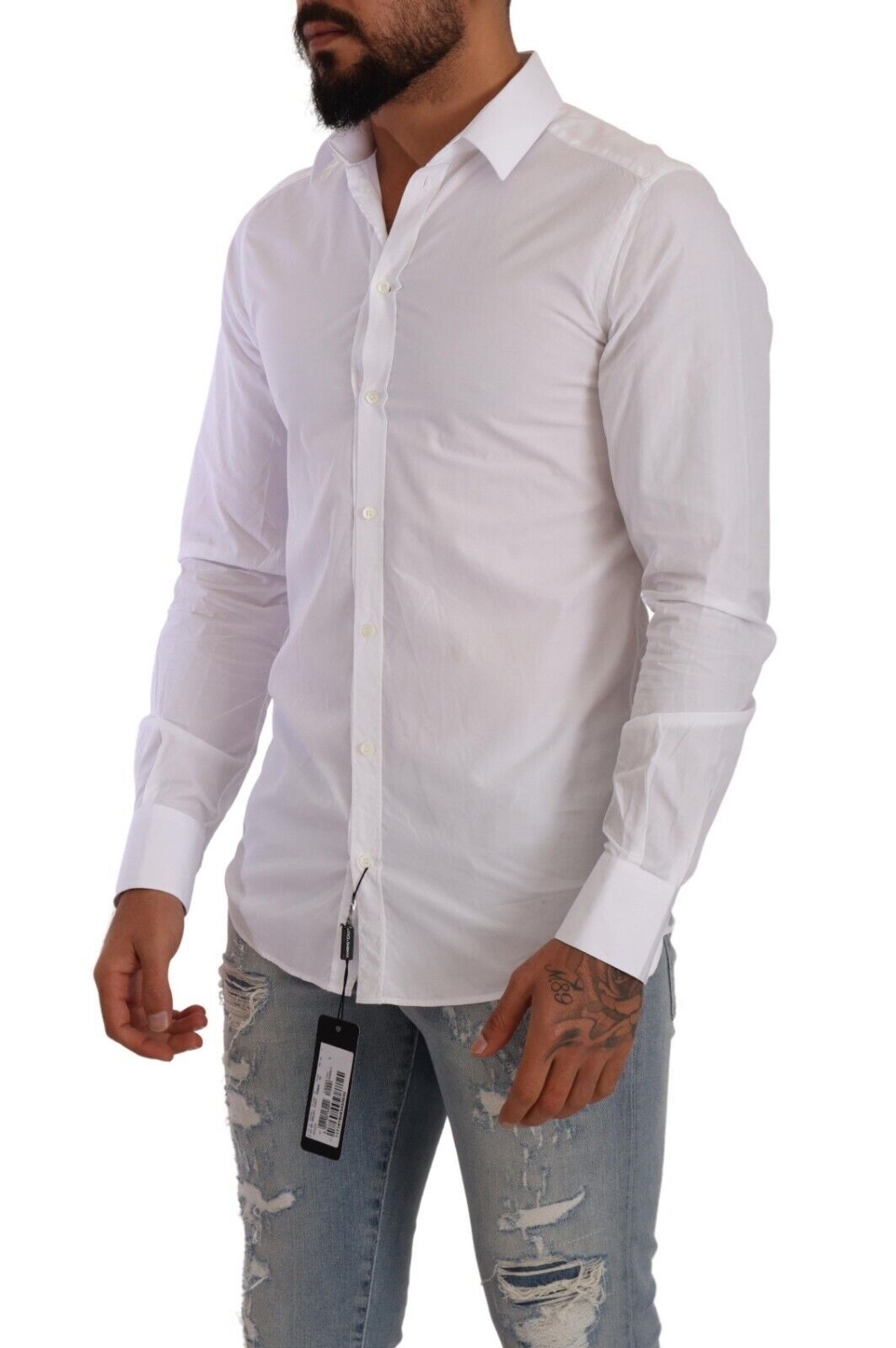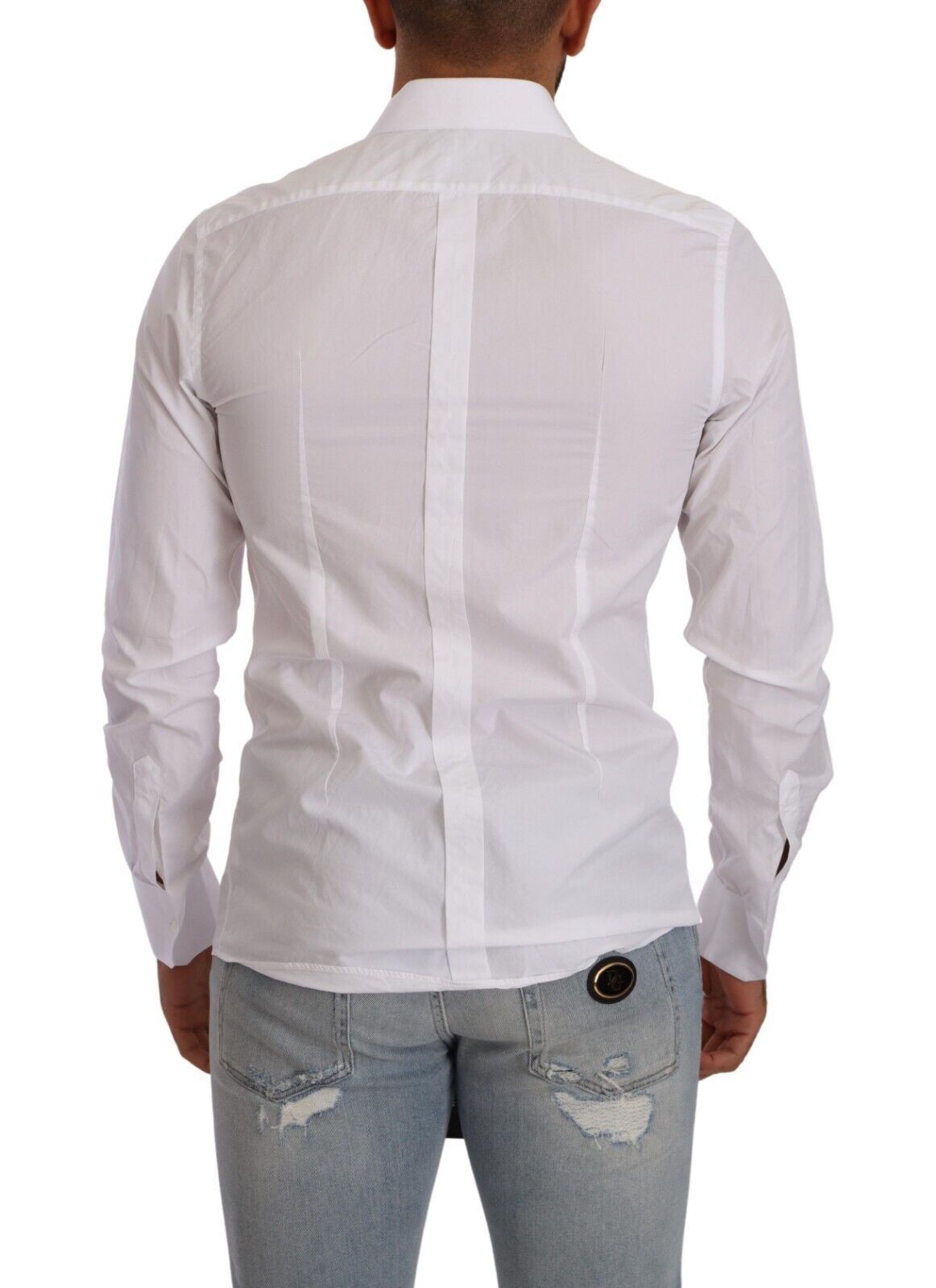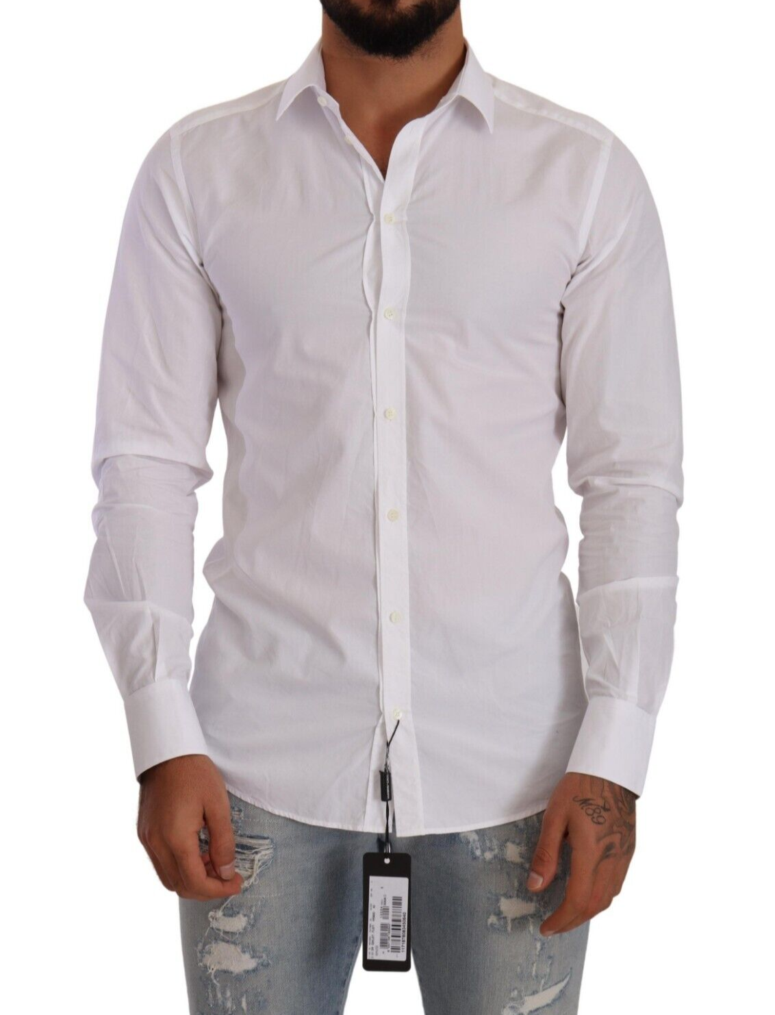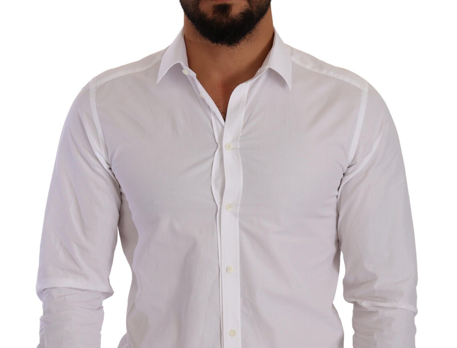 Adorn your wardrobe with the immaculate elegance of this stunning Dolce & Gabbana dress shirt. Crafted with the discerning gentleman in mind, it features a crisp, white hue, accentuated with a sleek, slim-fit design, befitting any formal or high-fashion occasion. The classic collar, long sleeves, and front button closure lend it a timeless charm, while subtle logo details add a signature touch of luxury. Made in Italy, this piece is a testament to exquisite tailoring and unparalleled style.