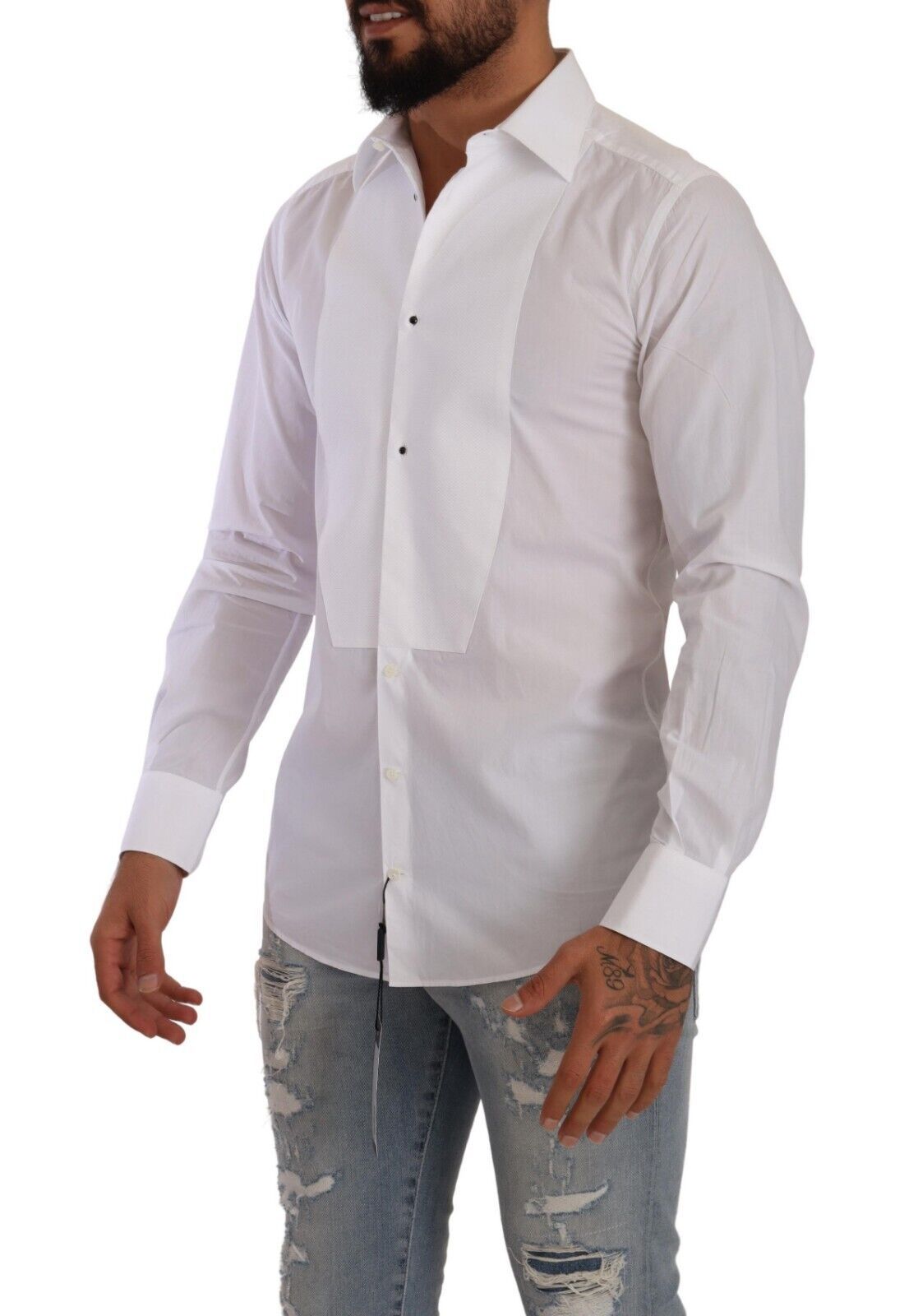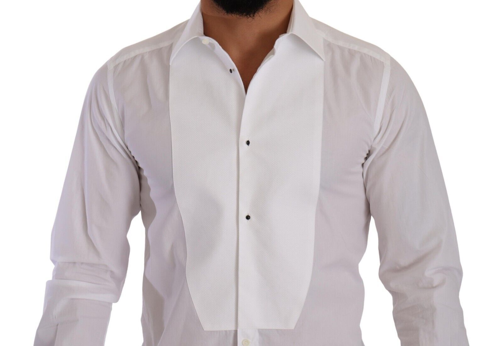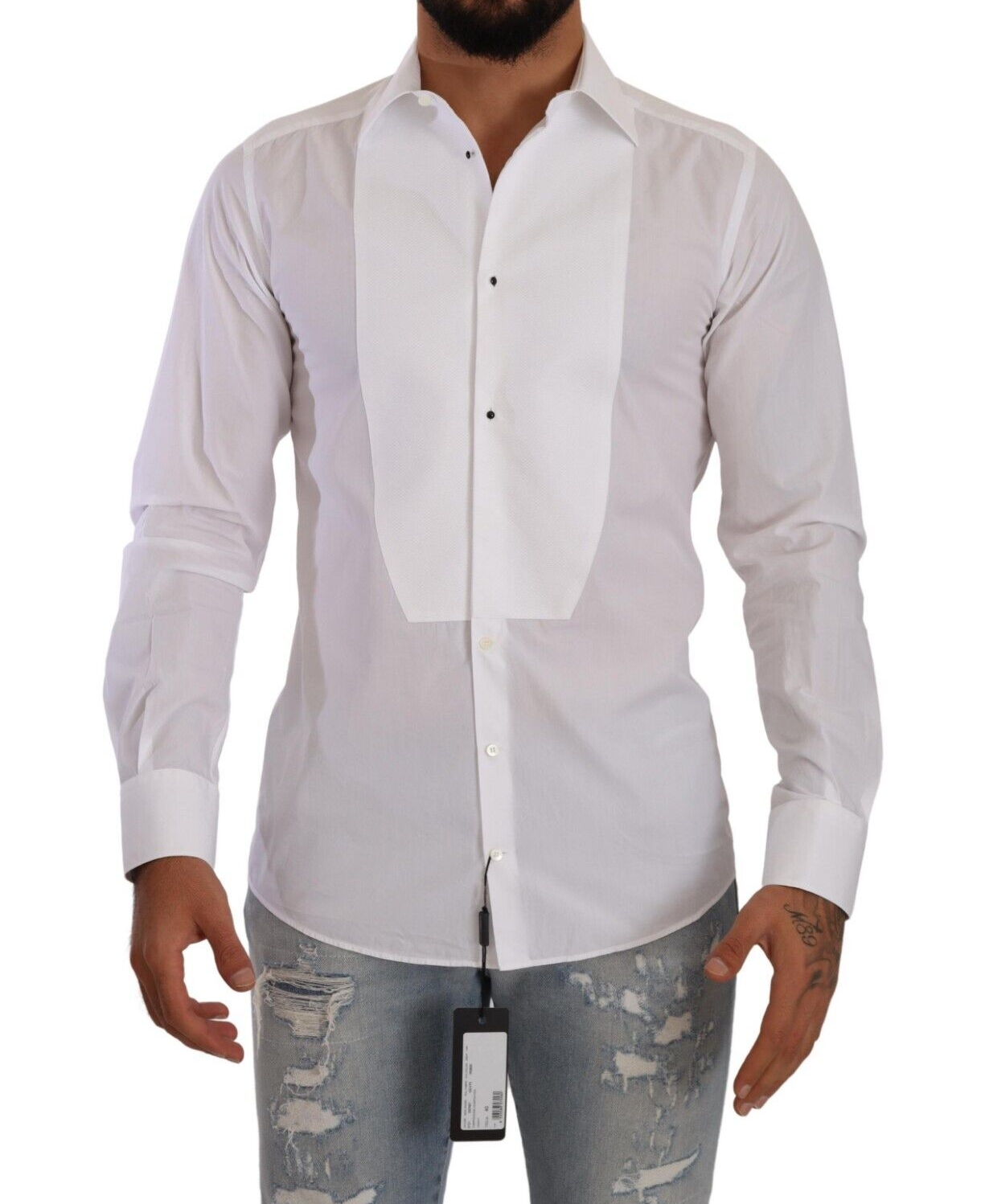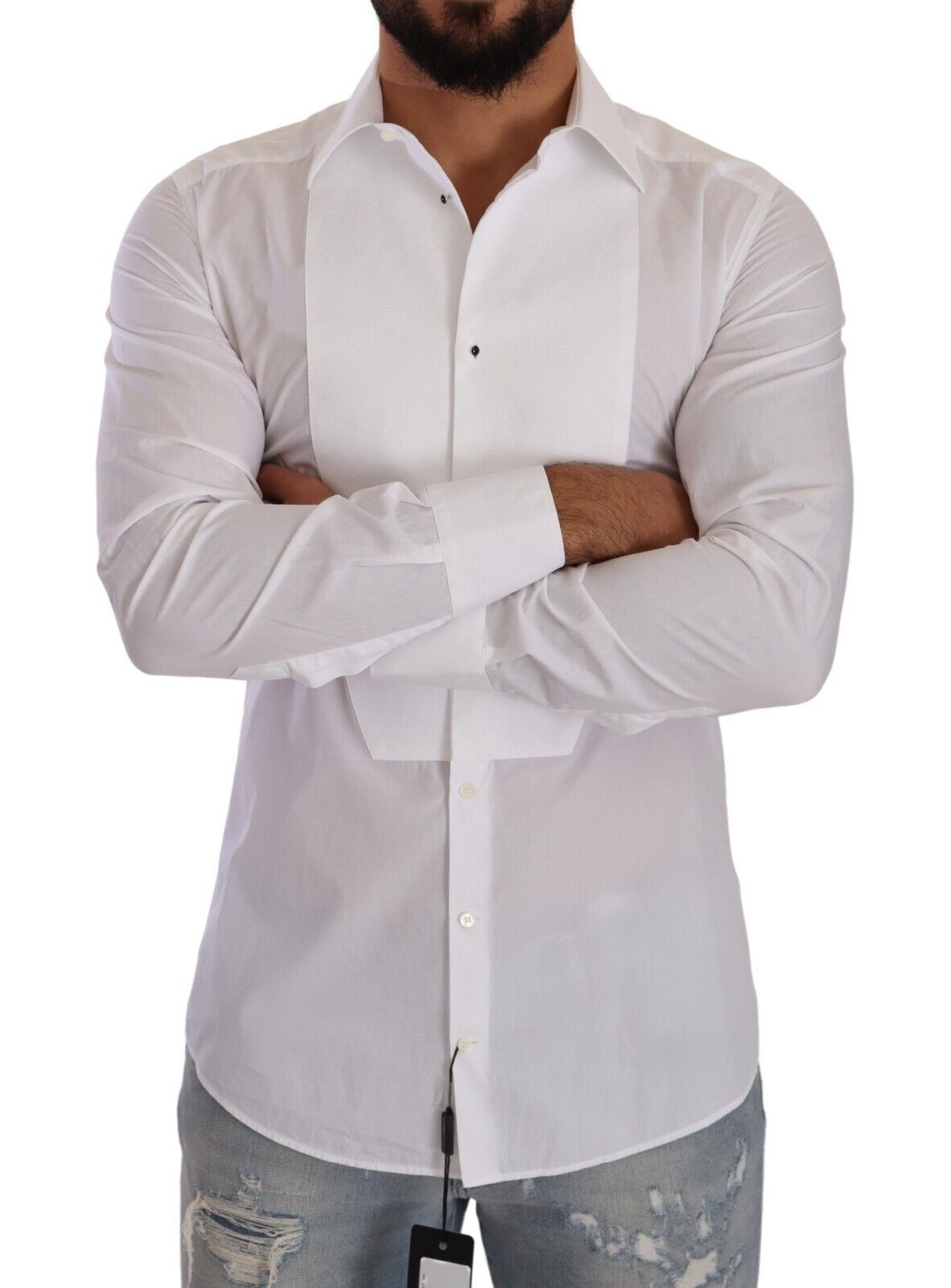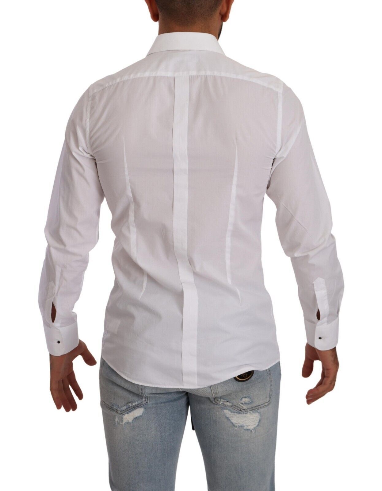 Step out in sophistication with the authentic new arrival—Dolce & Gabbana’s white cotton poplin shirt. This exquisite piece is a true icon of style, highlighting a sleek slim fit design that adds a touch of Italian elegance to your wardrobe. Its distinguished front button closure and logo details elevate the classic white shirt into a statement garment, perfect for any occasion. Crafted in Italy, experience the unparalleled quality of Dolce & Gabbana with this luxurious wardrobe staple.