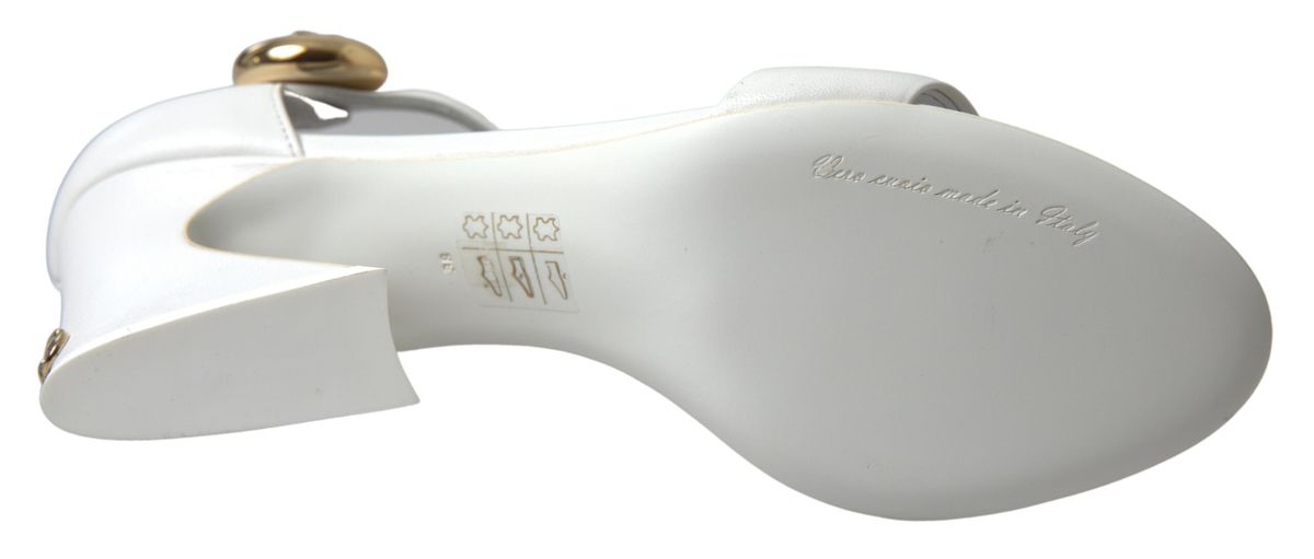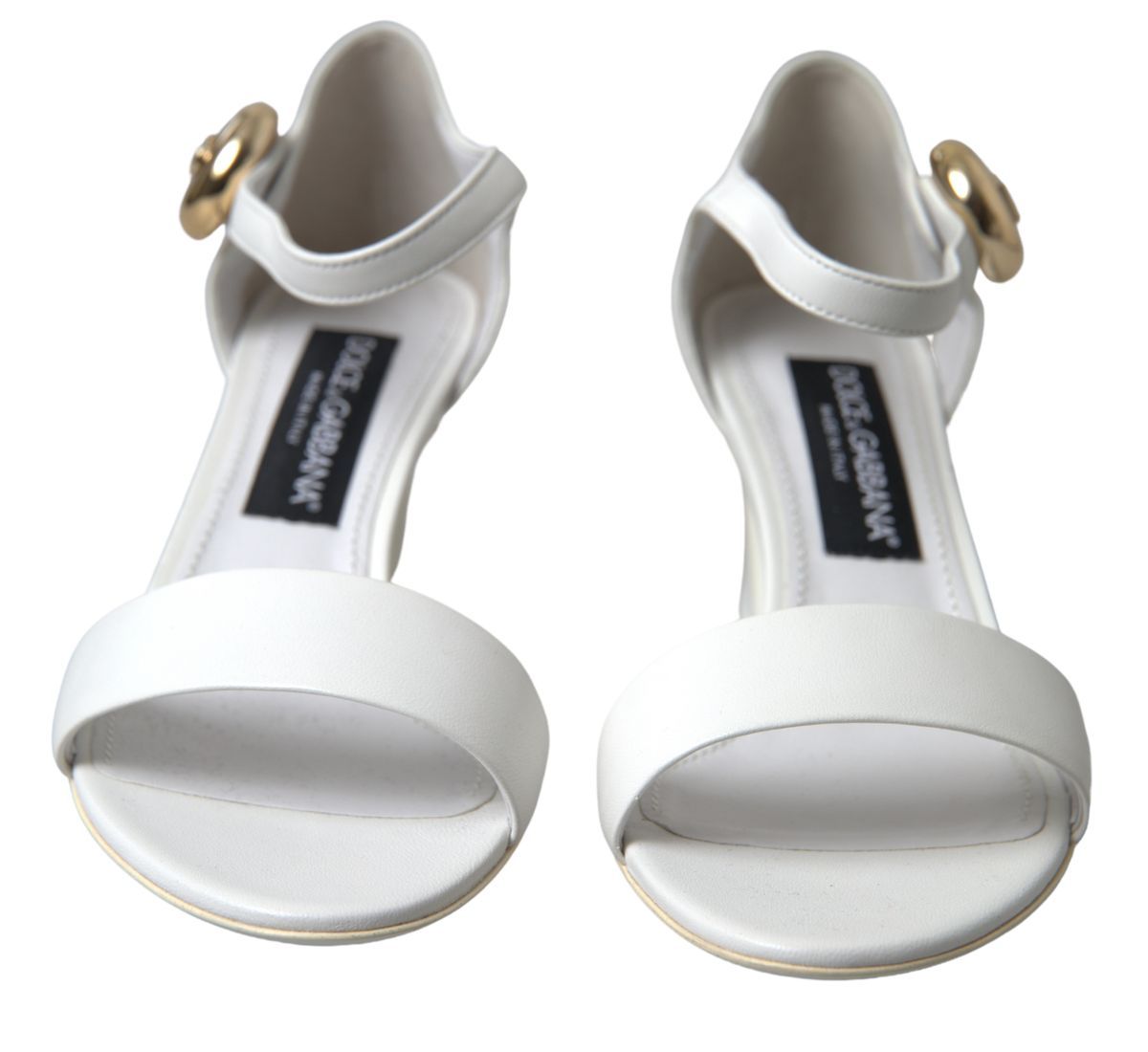 Step into luxury with these exquisite white sandals from Dolce & Gabbana. These brand new heels embody elegance with their smooth Nappa leather composition and striking gold-tone hardware. Crafted with precision in Italy, they feature a unique curved Cuban heel that adds a touch of sophistication to any ensemble. Complete with a secure buckle closure and the prestigious engraved logo, these sandals are a testament to timeless style and artisanal craftsmanship.