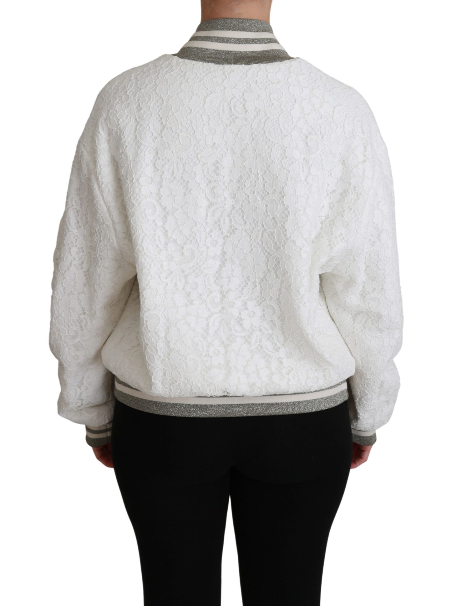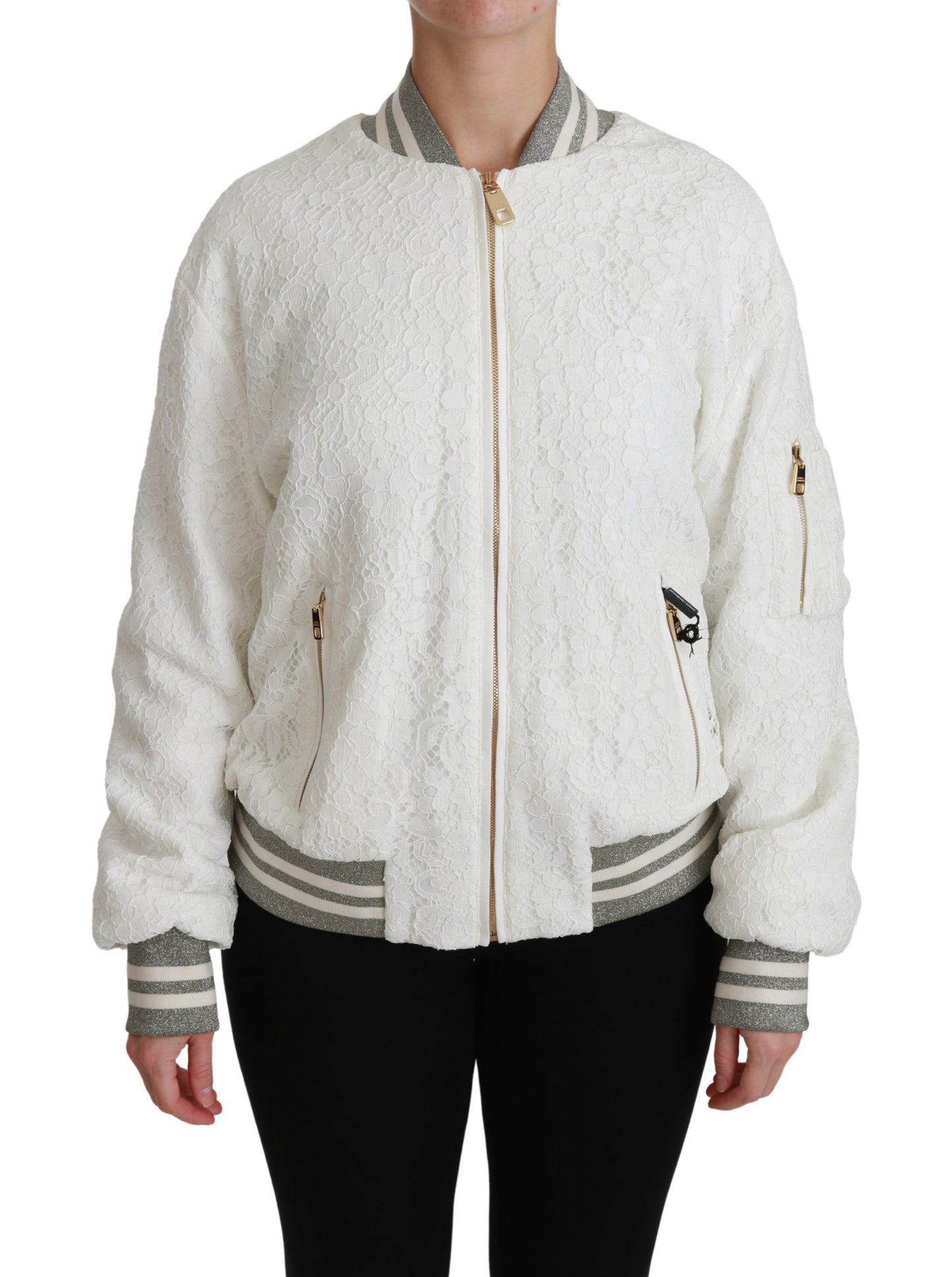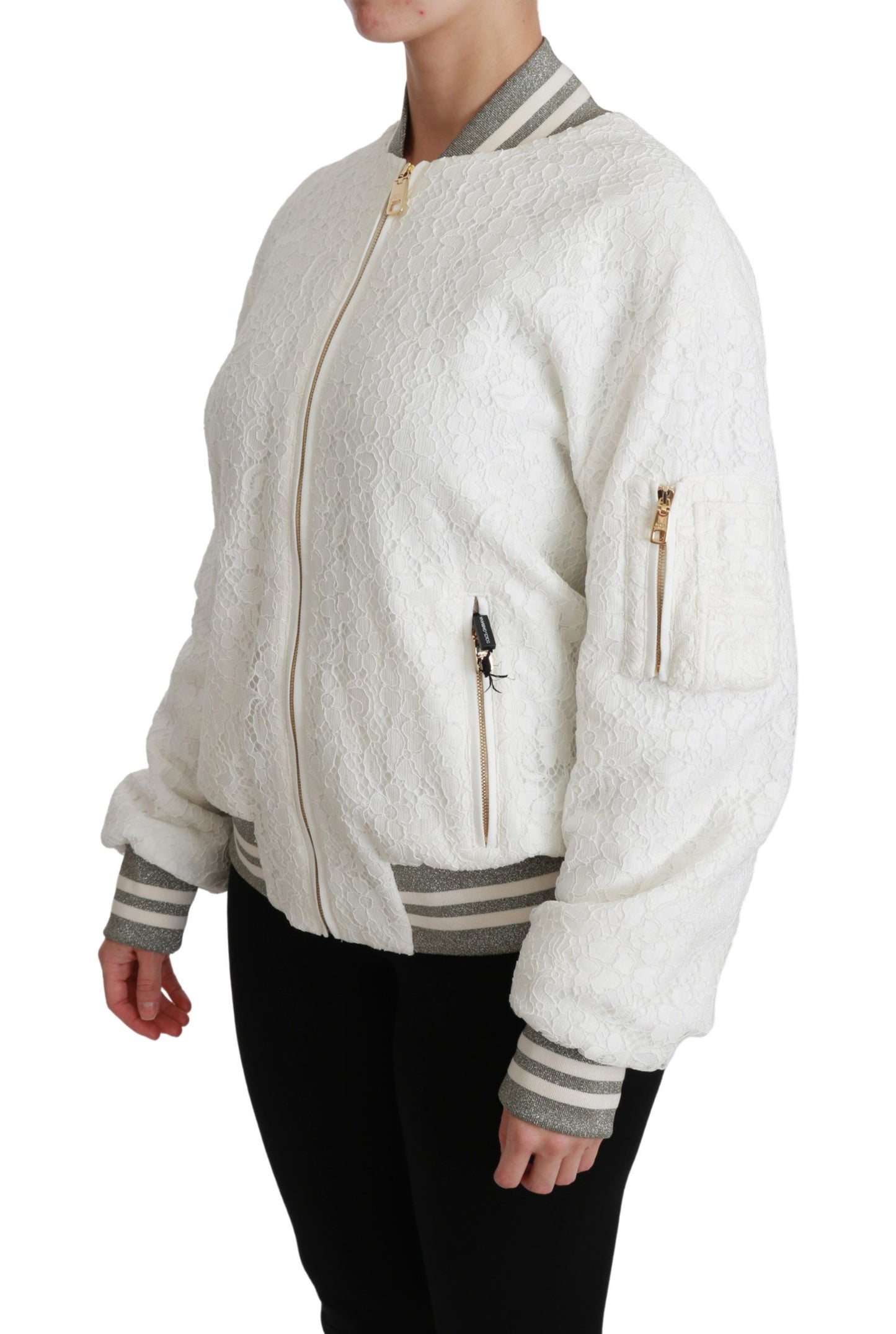 Embrace luxury with this pristine Dolce & Gabbana White Lace Bomber Jacket, a perfect blend of sophistication and contemporary design. Adorned with gold metal details and contrasting gray stripes, this jacket features a full zip closure and practical pockets, ensuring both style and functionality. Made in Italy, this piece showcases the brand’s dedication to exceptional craftsmanship.
