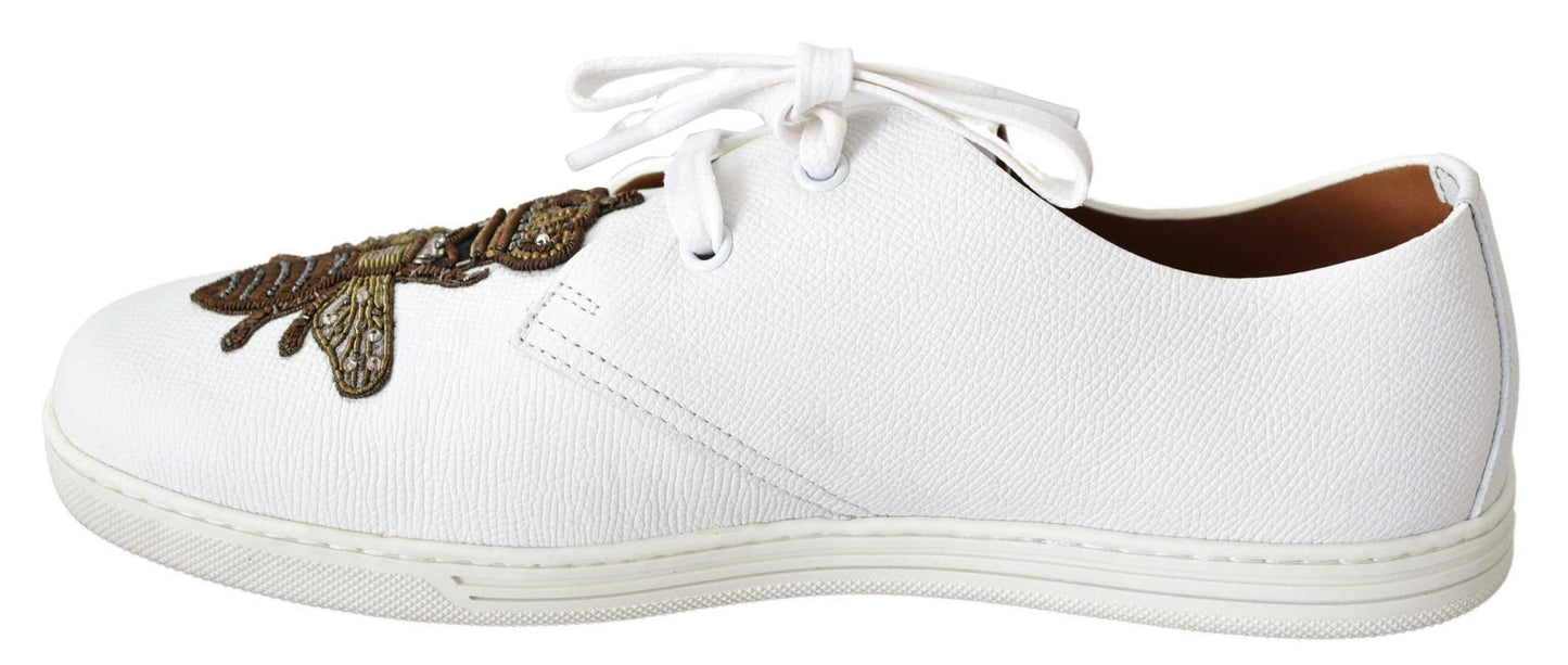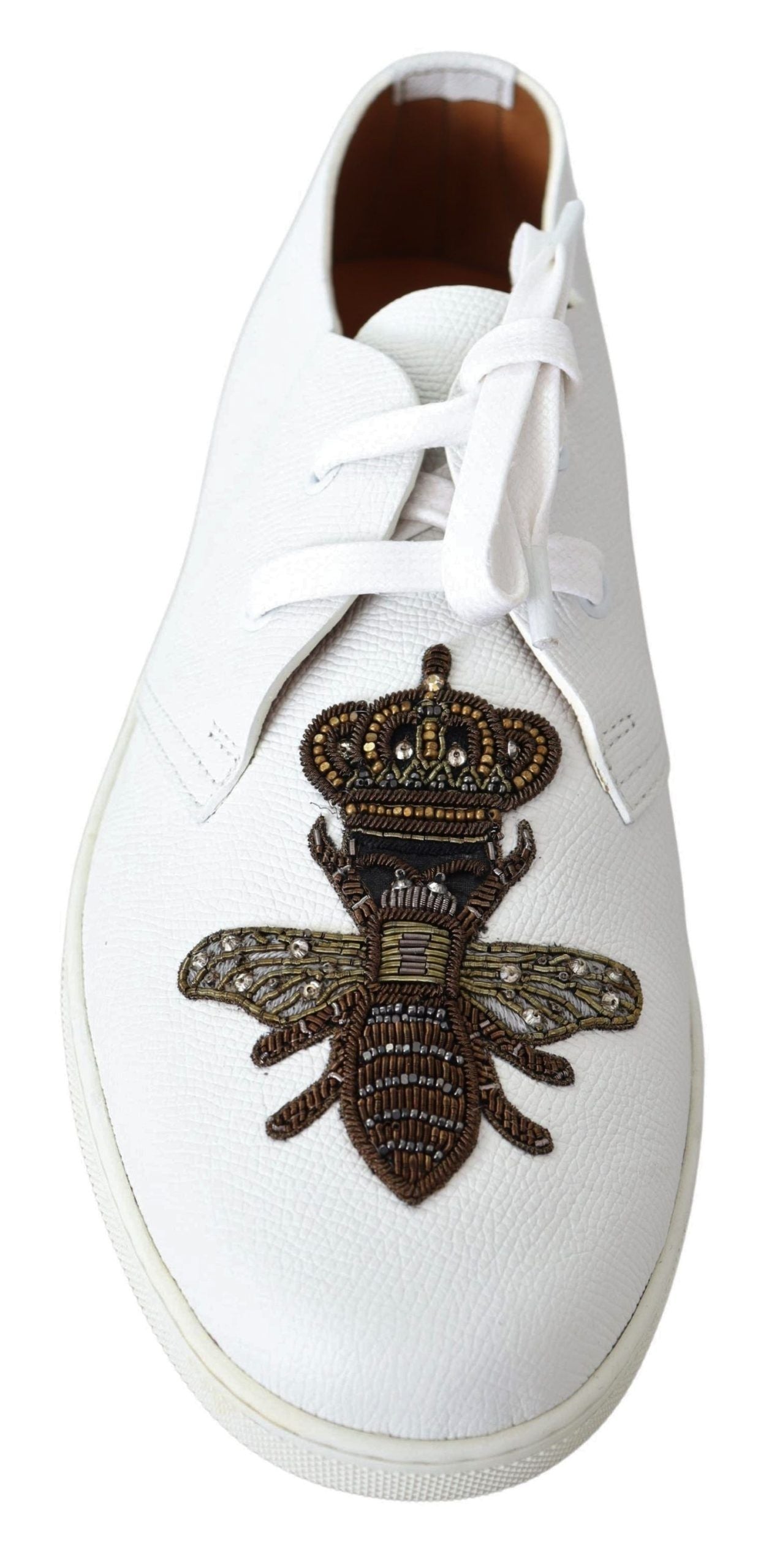 Step into luxury with these stunning white sneakers from Dolce & Gabbana. Known for high craftsmanship, these shoes are designed to offer both style and comfort. The standout feature is the gold crown bee embroidery, adding a royal touch to your casual attire. These sneakers embody the essence of Italian fashion and are sure to elevate any outfit.