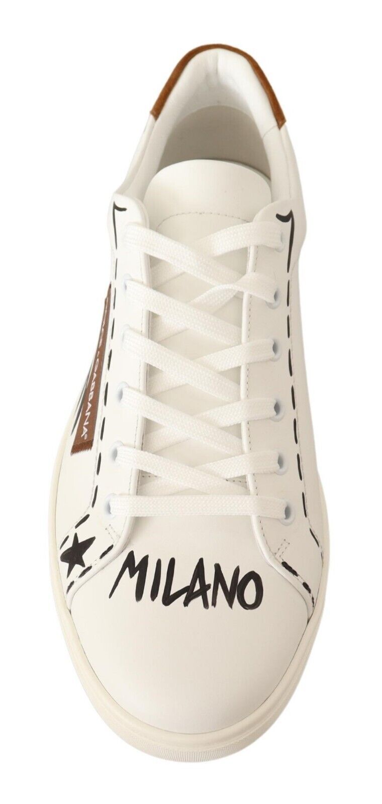 Step into sophistication with these Gorgeous brand new with tags, casual sneakers by Dolce & Gabbana. These white leather sneakers with brown suede accents boast a classic silhouette, complete with a lace-up closure for adjustable comfort. Experience the luxurious touch of a lightly padded leather insole along with the practicality of a rubber sole designed for traction. The attention to detail is evident with the logo details, signaling the high craftsmanship that Dolce & Gabbana is known for. Made in Italy, these sneakers represent both elegance and exclusivity.