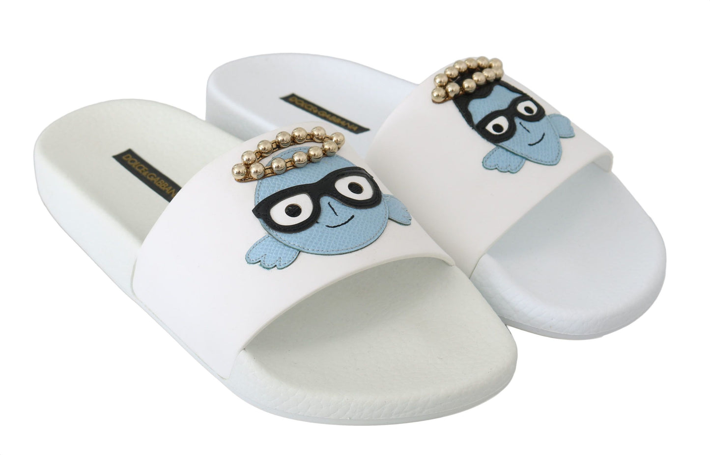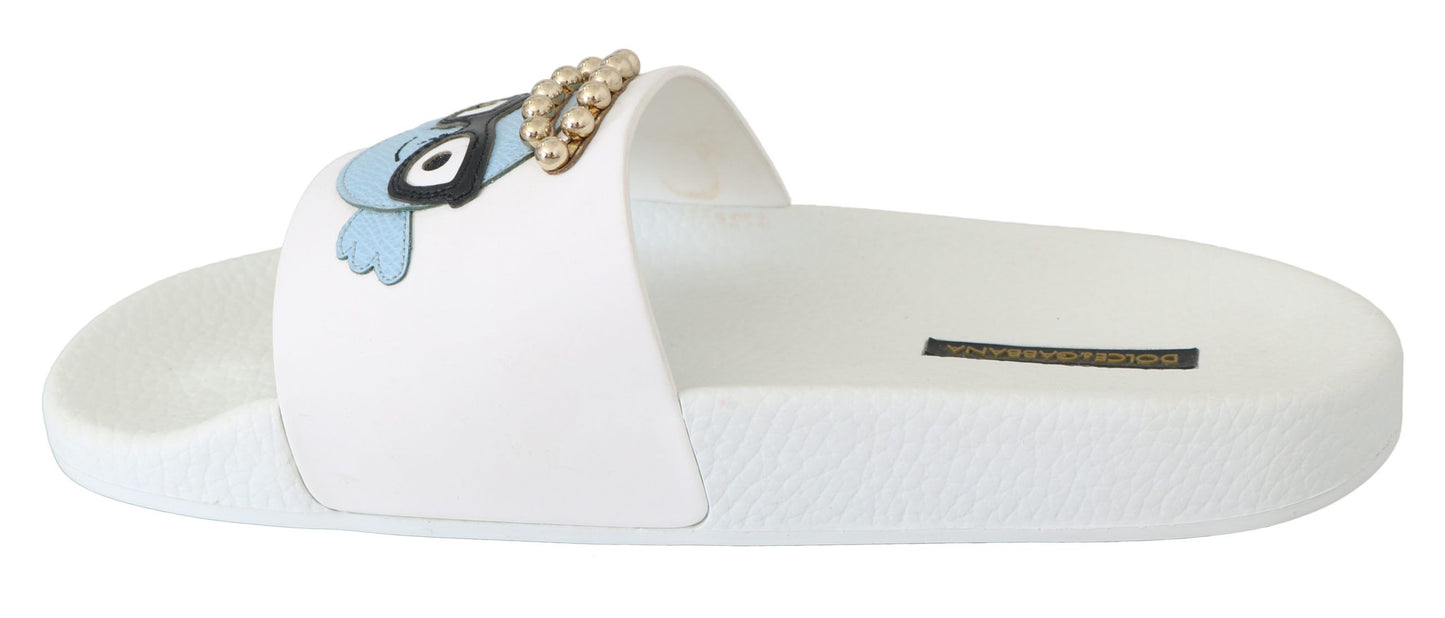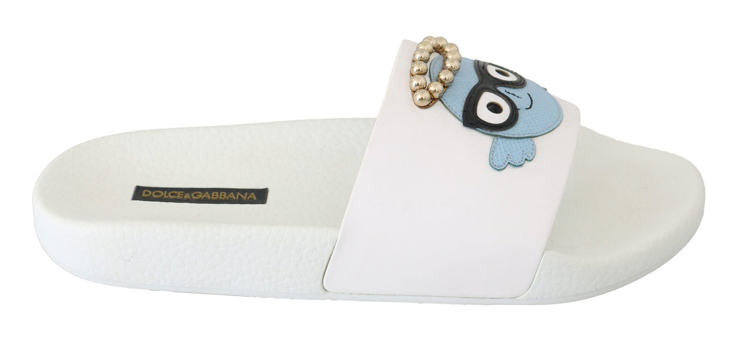 Step into elegance with these pristine white slide sandals from Dolce & Gabbana. Expertly crafted in Italy, they boast a luxurious 100% leather top paired with a comfortable rubber sole, designed to add a touch of sophistication to your summer wardrobe. Featuring the whimsical #dgfamily motif and the iconic logo detail, these sandals are not just shoes but a statement of style.