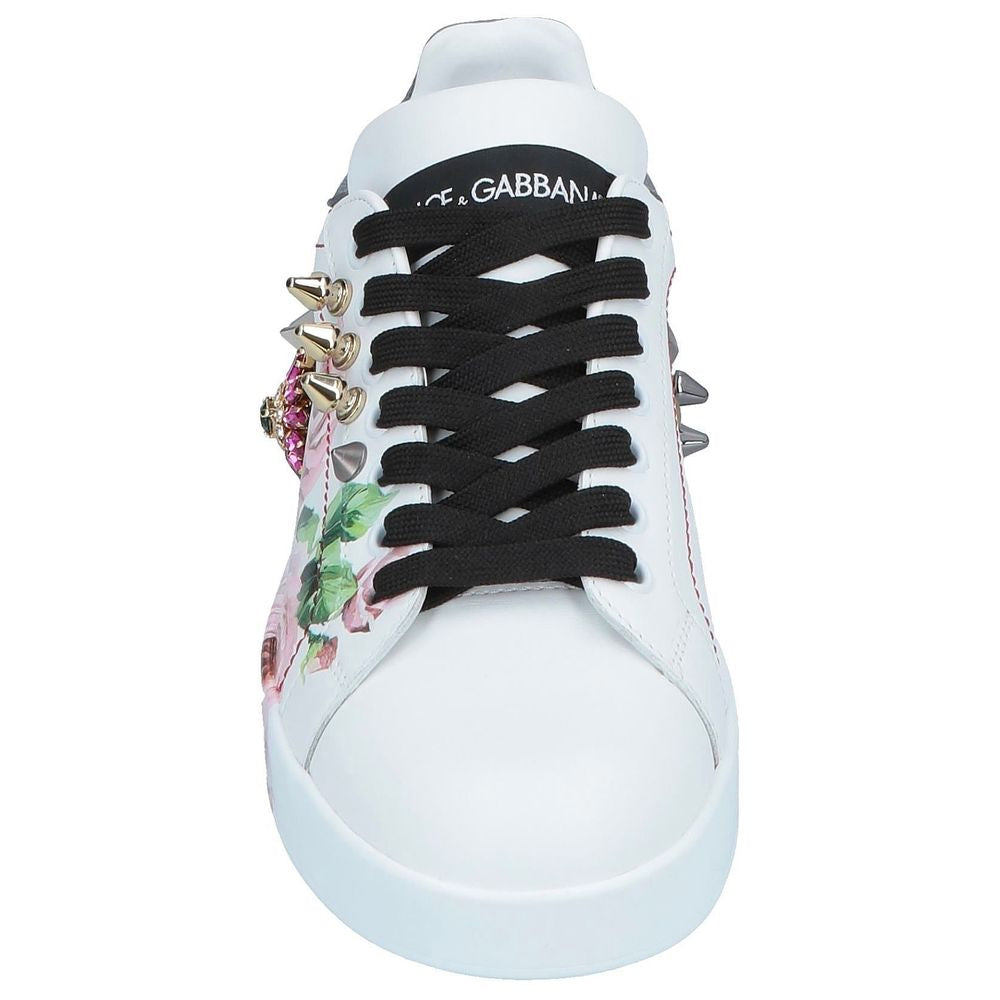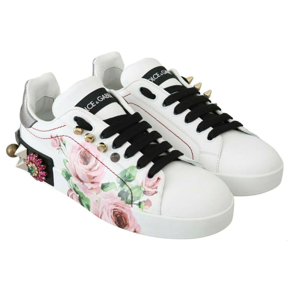 Step into luxury with these impeccably crafted white calfskin sneakers from a top-tier designer. Adorned with a feminine side rose print and tasteful studs, these shoes also feature eye-catching colored glass decorations on the heel for an extra dazzle. The silver patent leather heel counter boasts a striking rubber logo, adding a signature touch. Crafted with precision in Italy, these sneakers are a blend of traditional elegance and contemporary design.