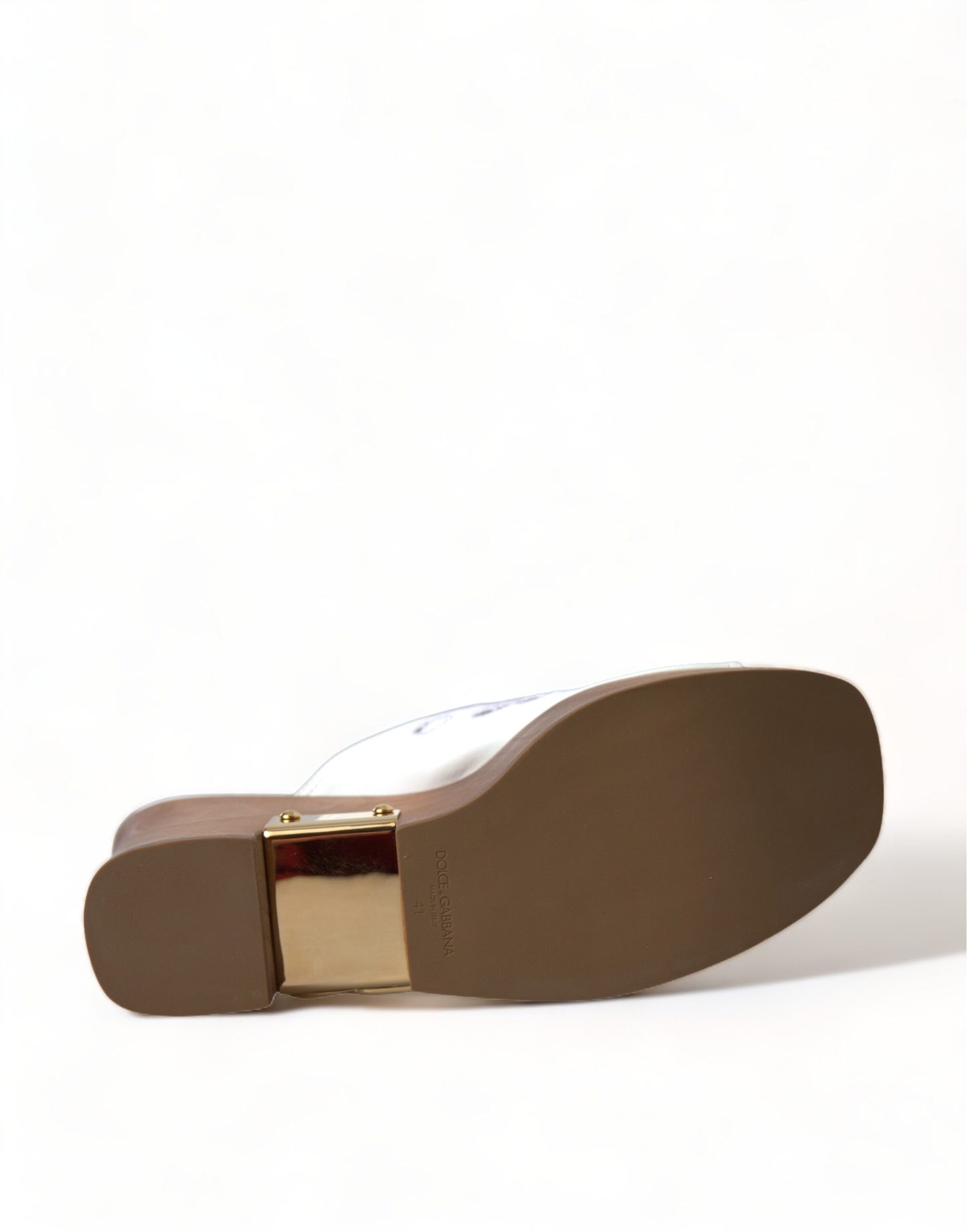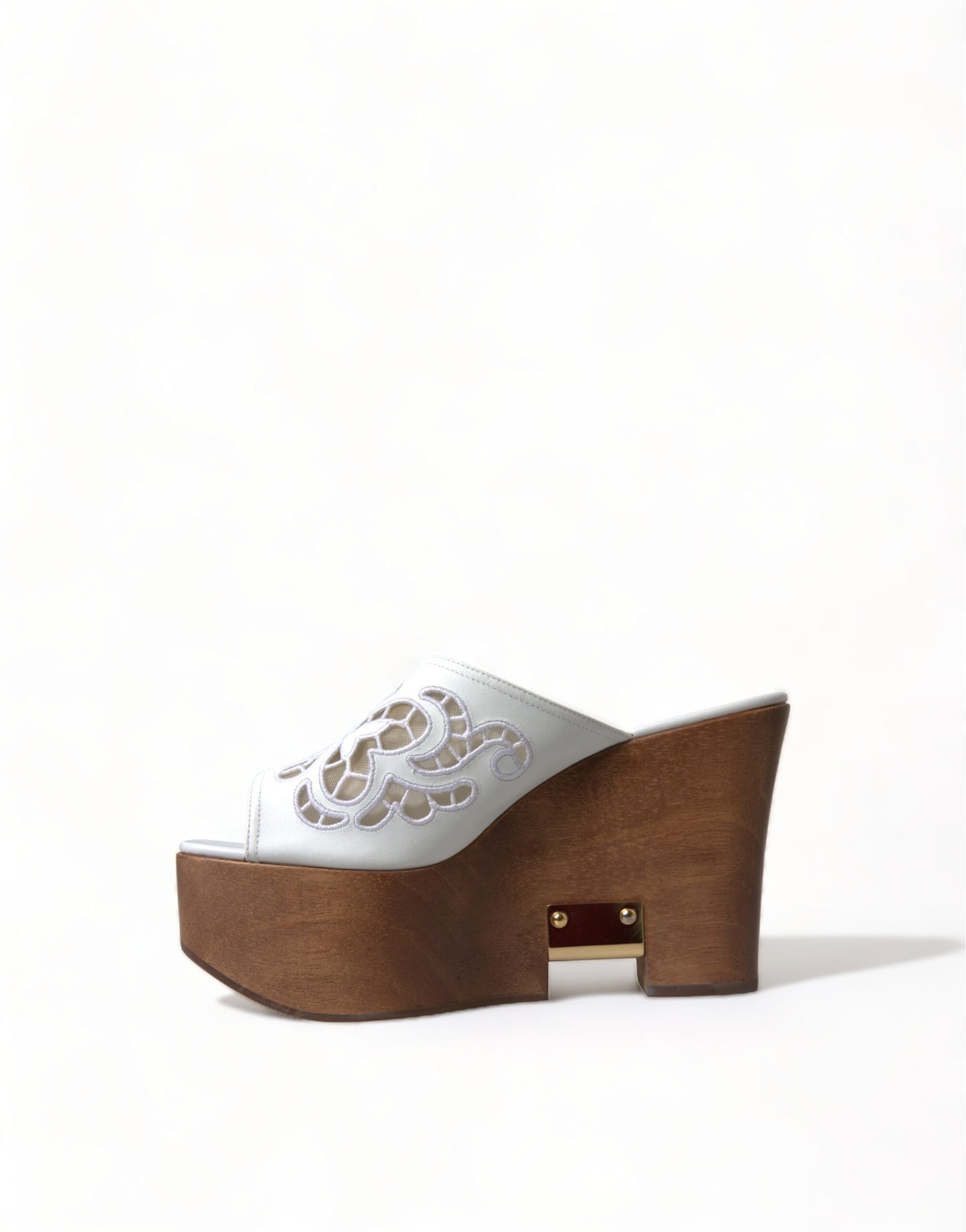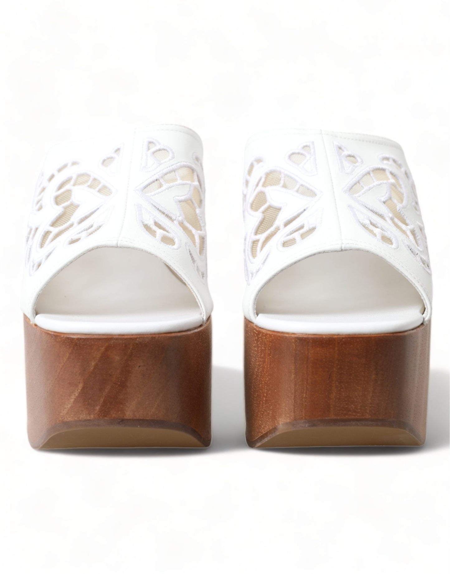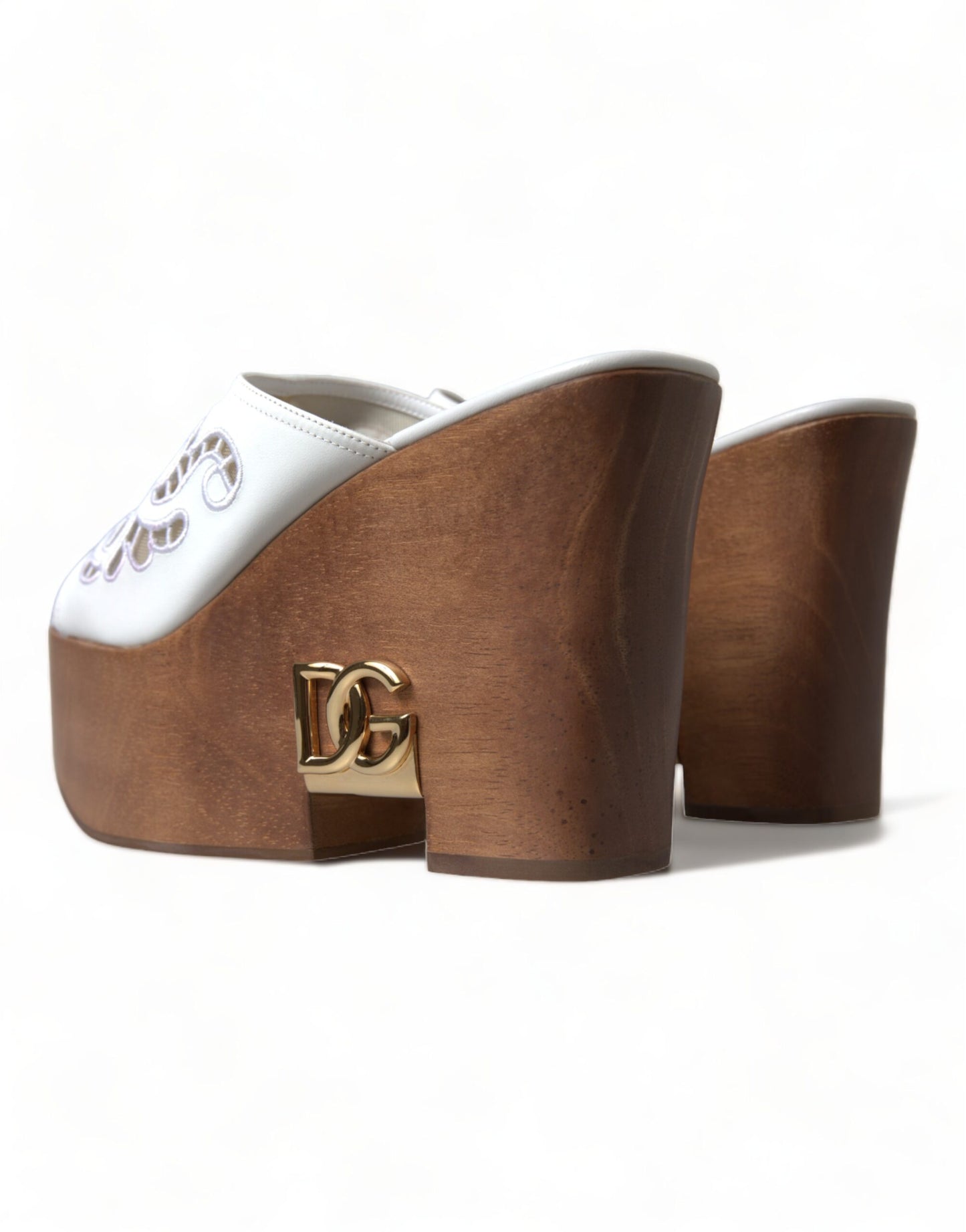 Step into luxury with these stunning, 100% Authentic white leather wedge sandals from the prestigious fashion house, Dolce & Gabbana. Perfect for adding a touch of elegance to any summer outfit, these open-toe platform sole mules are a gorgeous blend of classic style and modern appeal. Crafted with quality materials and impeccable attention to detail, they feature a comfortable rubber sole and a wooden wedge that offers both height and comfort. Complete with logo details, these Italian-made sandals are an essential addition to your sophisticated wardrobe.