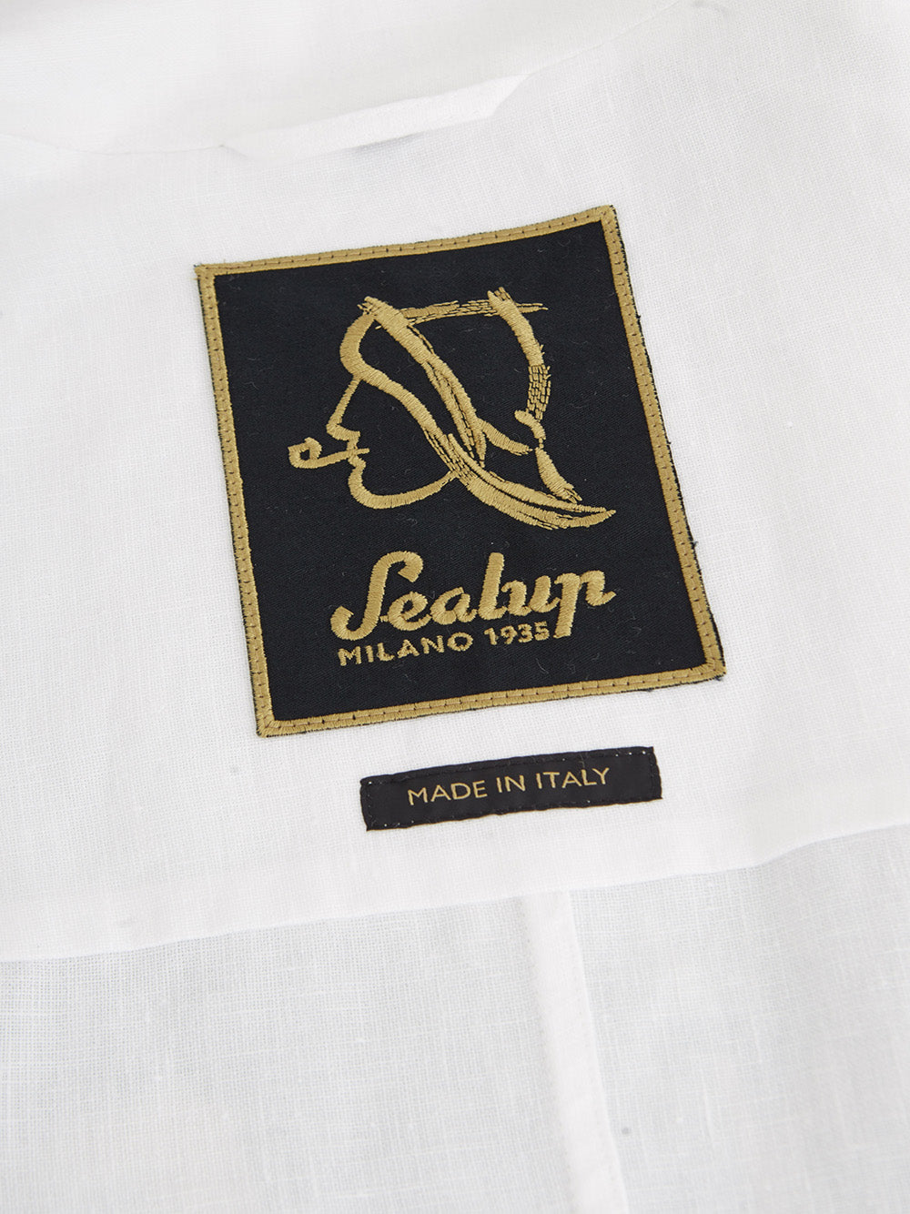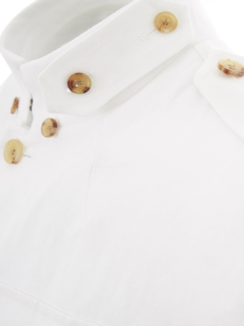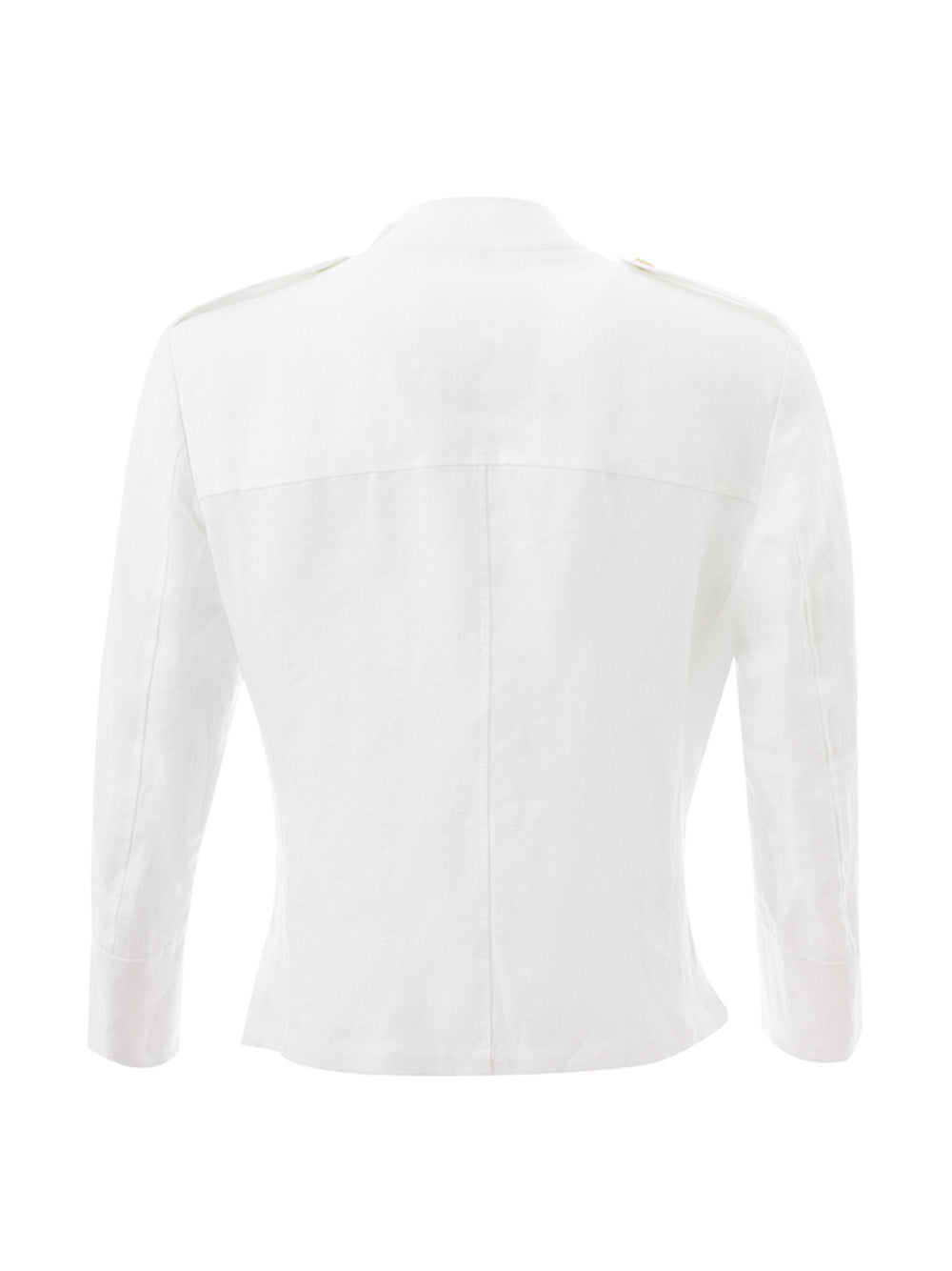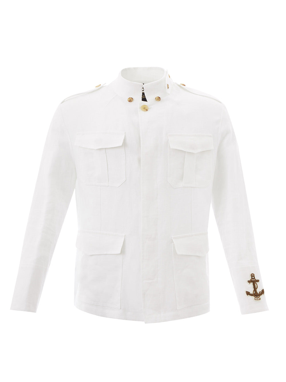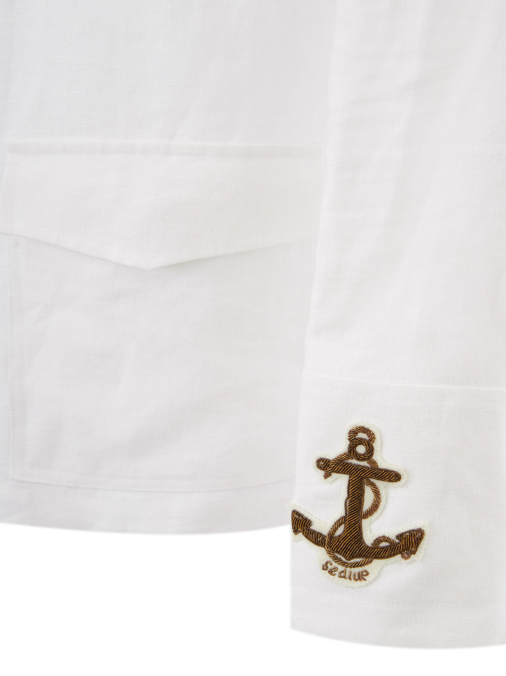 Gorgeous brand new with tags, 100% Authentic Sealup white linen Saharan jacket exudes marine elegance with a French collar, front covered button closure, and intricate anchor embroidery. Perfect for a refined wardrobe addition, offering both style and comfort.