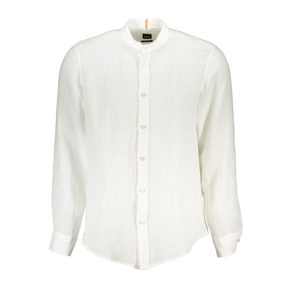 Step into suave elegance with this Hugo Boss Long Sleeved Shirt. Tailored to a regular fit with a distinct Mandarin collar and stylish single-button cuffs, this shirt exudes sophistication at its best. The crisp white linen is a timeless classic, guaranteeing a sharp look for any casual or semi-formal occasion.