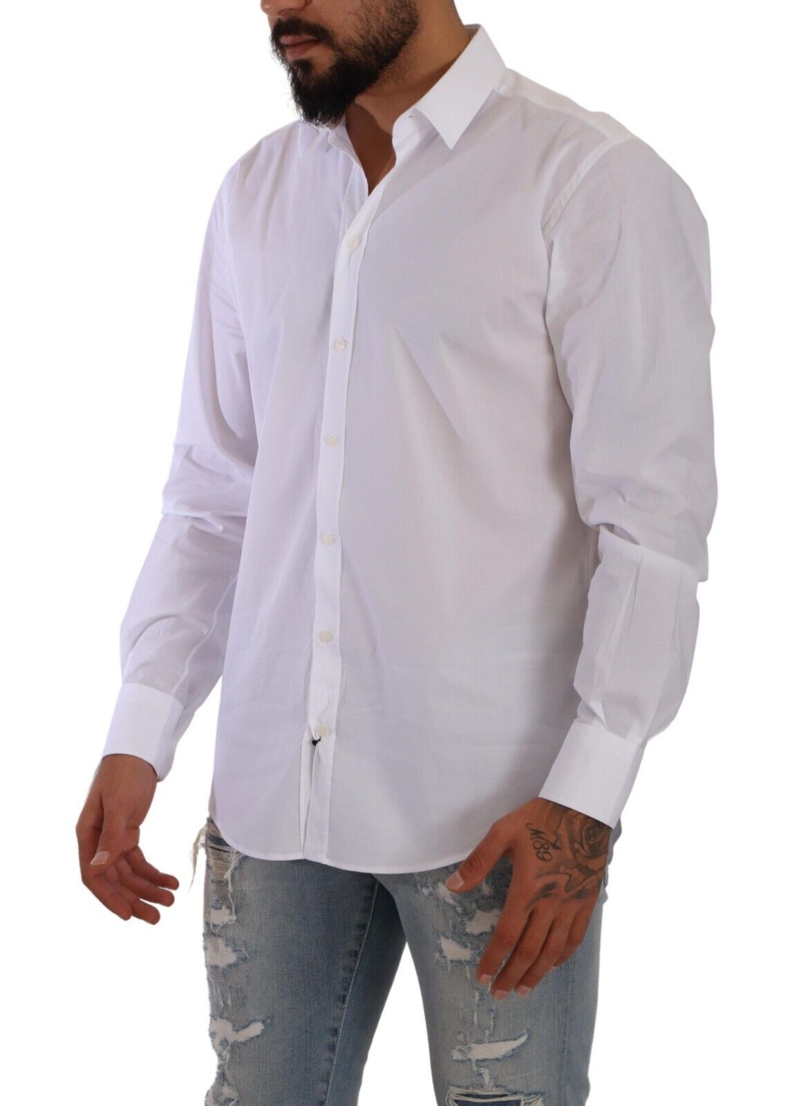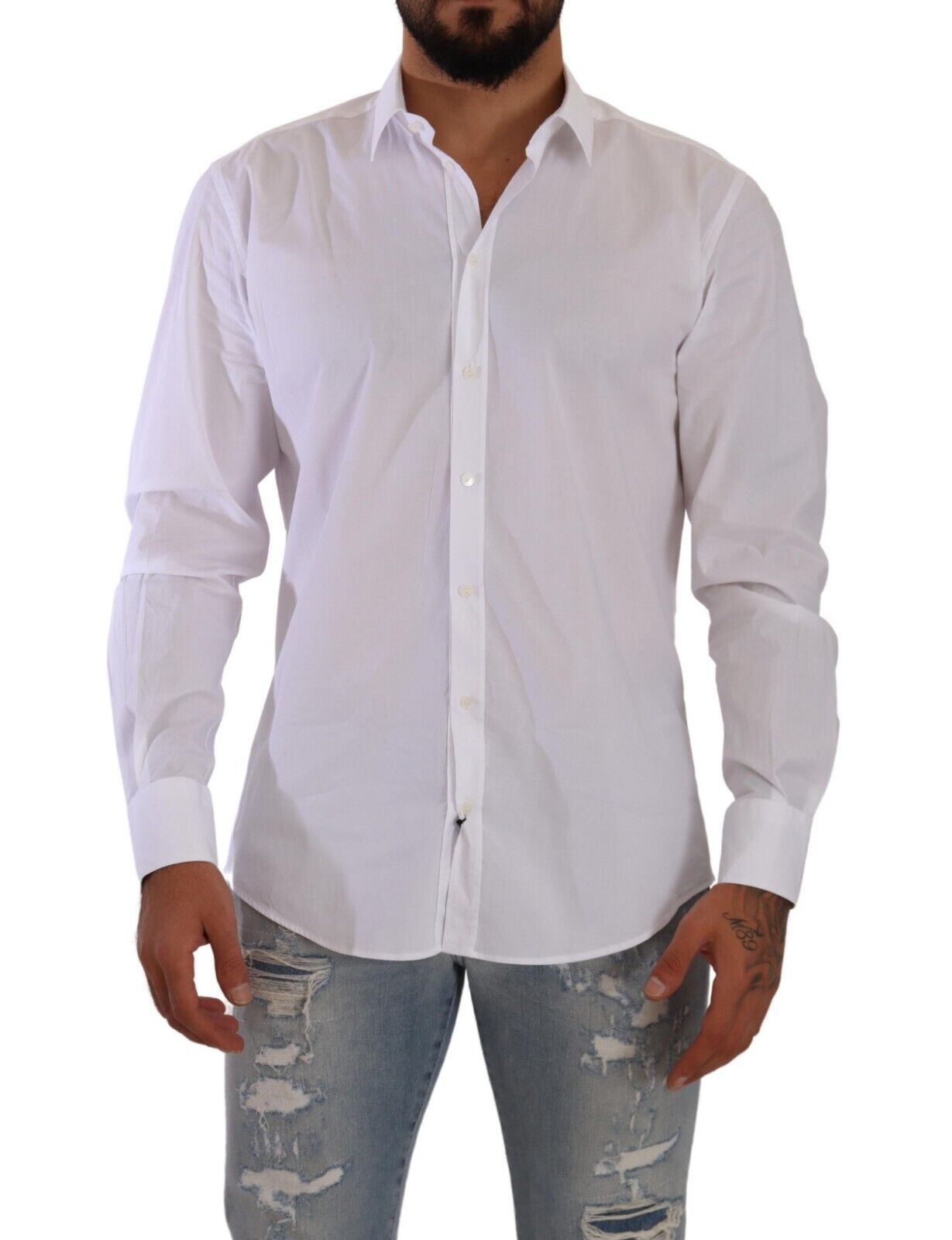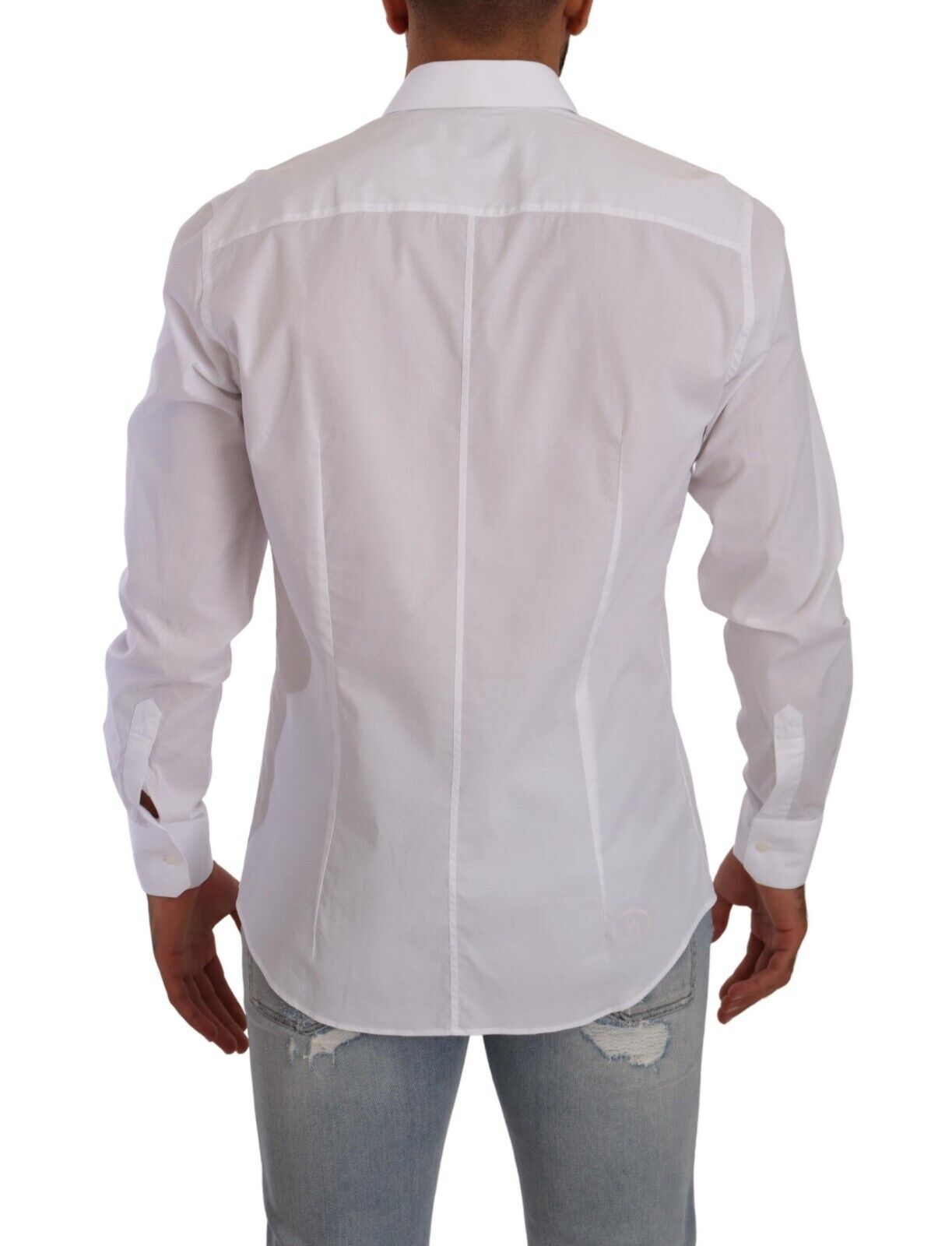 Exude timeless elegance in this pristine White Slim Fit Martini Dress Shirt by Dolce & Gabbana. Crafted from a luxurious blend of 97% cotton and 3% elastane, it promises not only a stunning aesthetic but also comfort and durability. The classic neck and long sleeves define sophistication, while the slim fit cut offers a modern silhouette. Perfect for any formal event or stylish affair, this shirt with front button closure and subtle logo details embodies Italian craftsmanship at its finest.