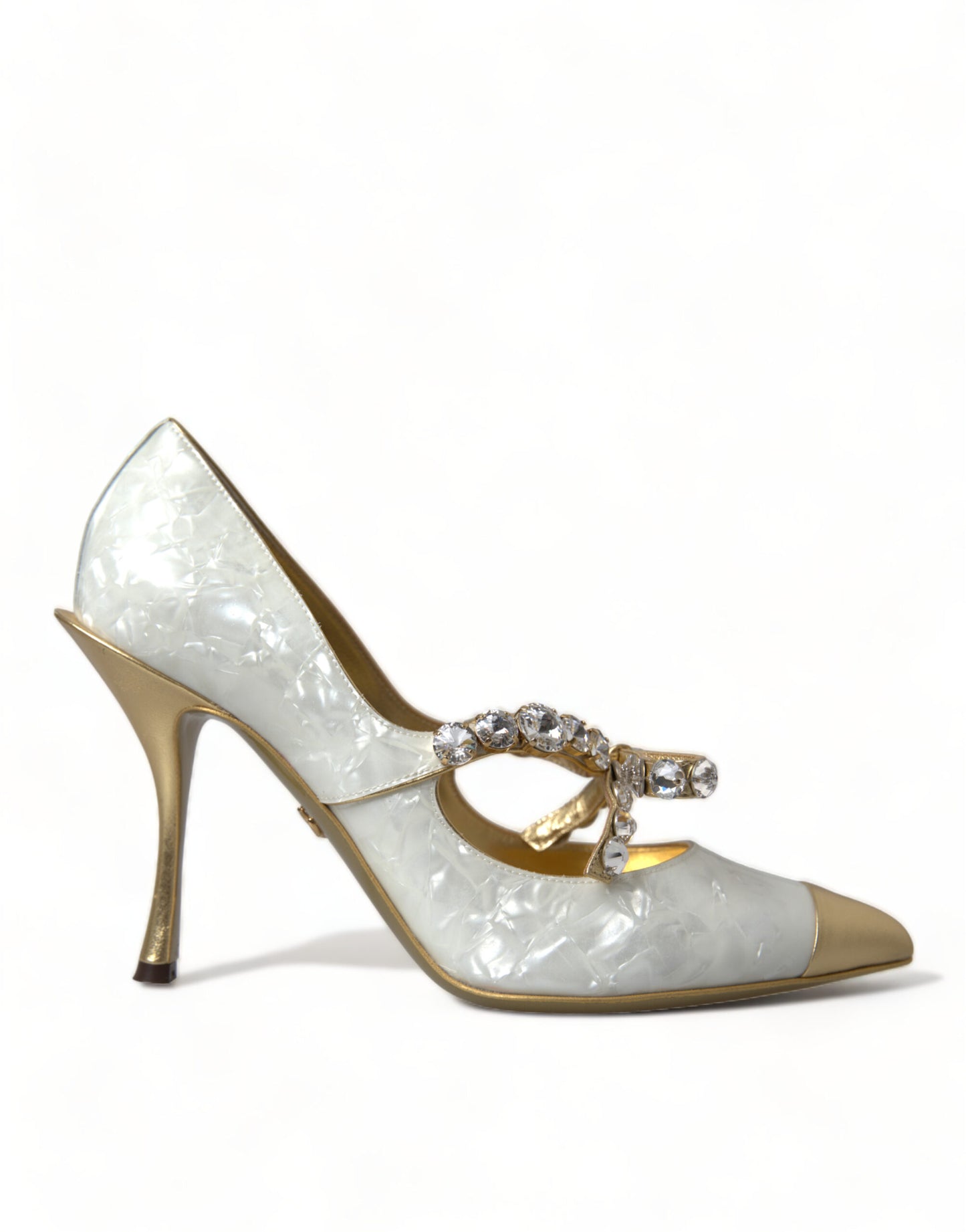 Step into a world of elegance and charm with these Dolce & Gabbana high heel shoes. Exquisitely crafted from patent leather featuring an iridescent finish, these heels are the epitome of luxury. Accented with a golden nappa bow encrusted with sparkling crystals, the design blends classic sophistication with a touch of glamour. Perfect for making a striking statement at any upscale event.