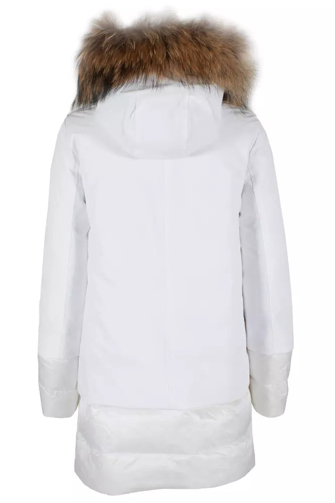 Infuse luxury and practicality into your wardrobe with our chic white technical fabric jacket, perfect for the fashion-forward woman. The sumptuous fur-trimmed hood adds a touch of glamour, while the versatile front zipper and button closure ensure warmth and style. Designed with utility in mind, it features both interior and side pockets to keep your essentials secure and easily accessible.