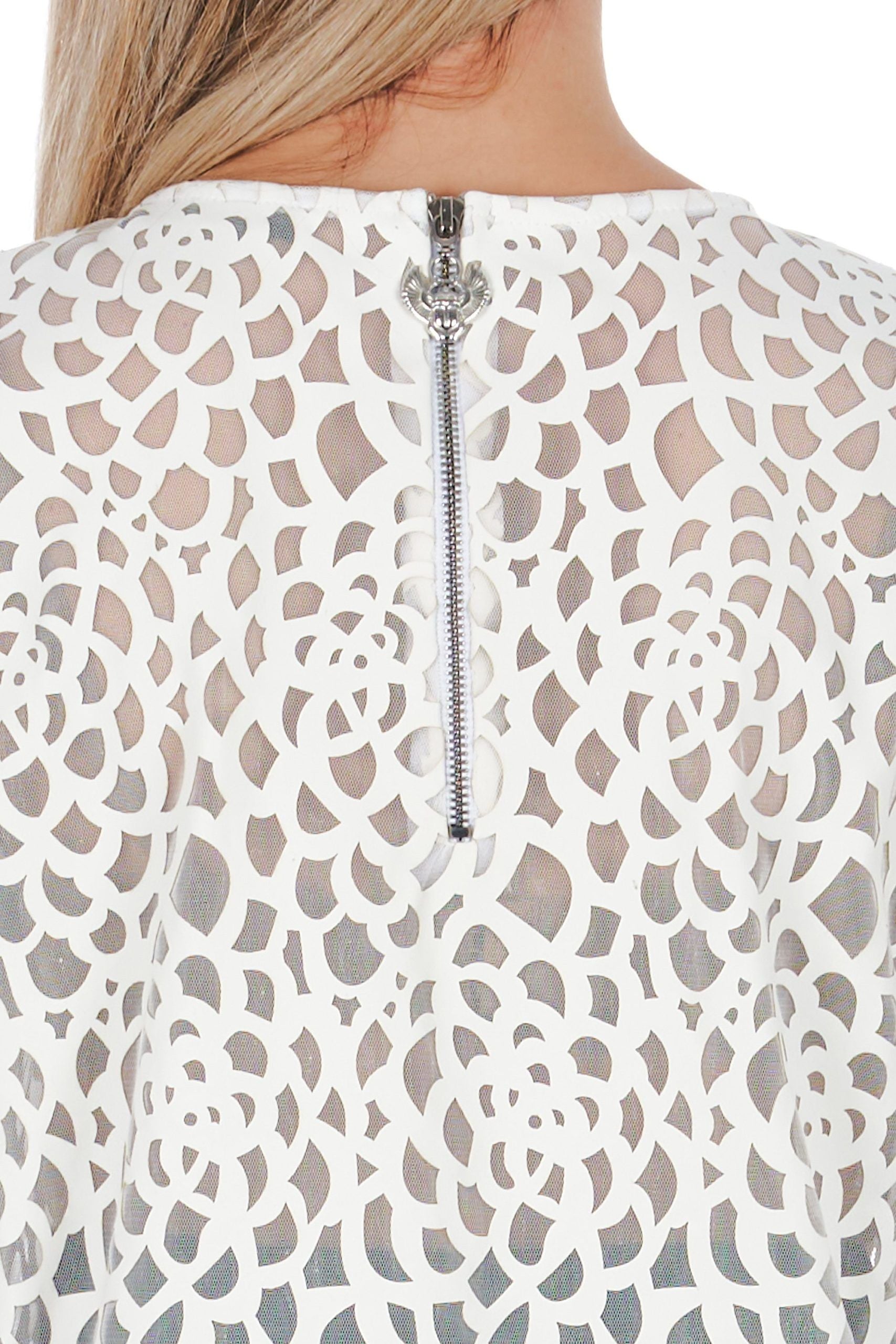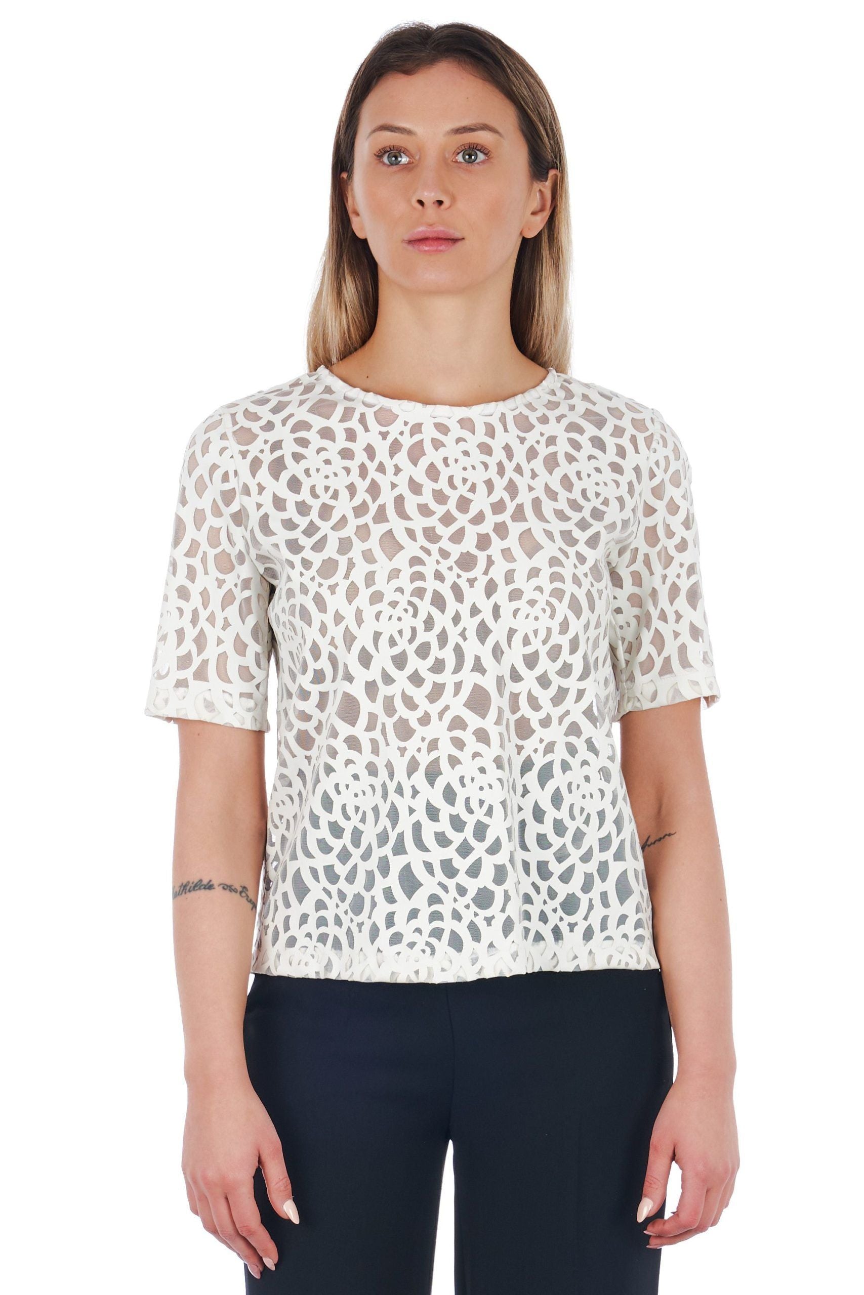 Elevate your wardrobe with the Frankie Morello short-sleeved blouse, masterfully crafted in a unique perforated eco-leather design that blends sophistication with edge. Perfect for those who admire a sleek, modern aesthetic, this top features an easy-to-wear back zip closure, ensuring a perfect fit.