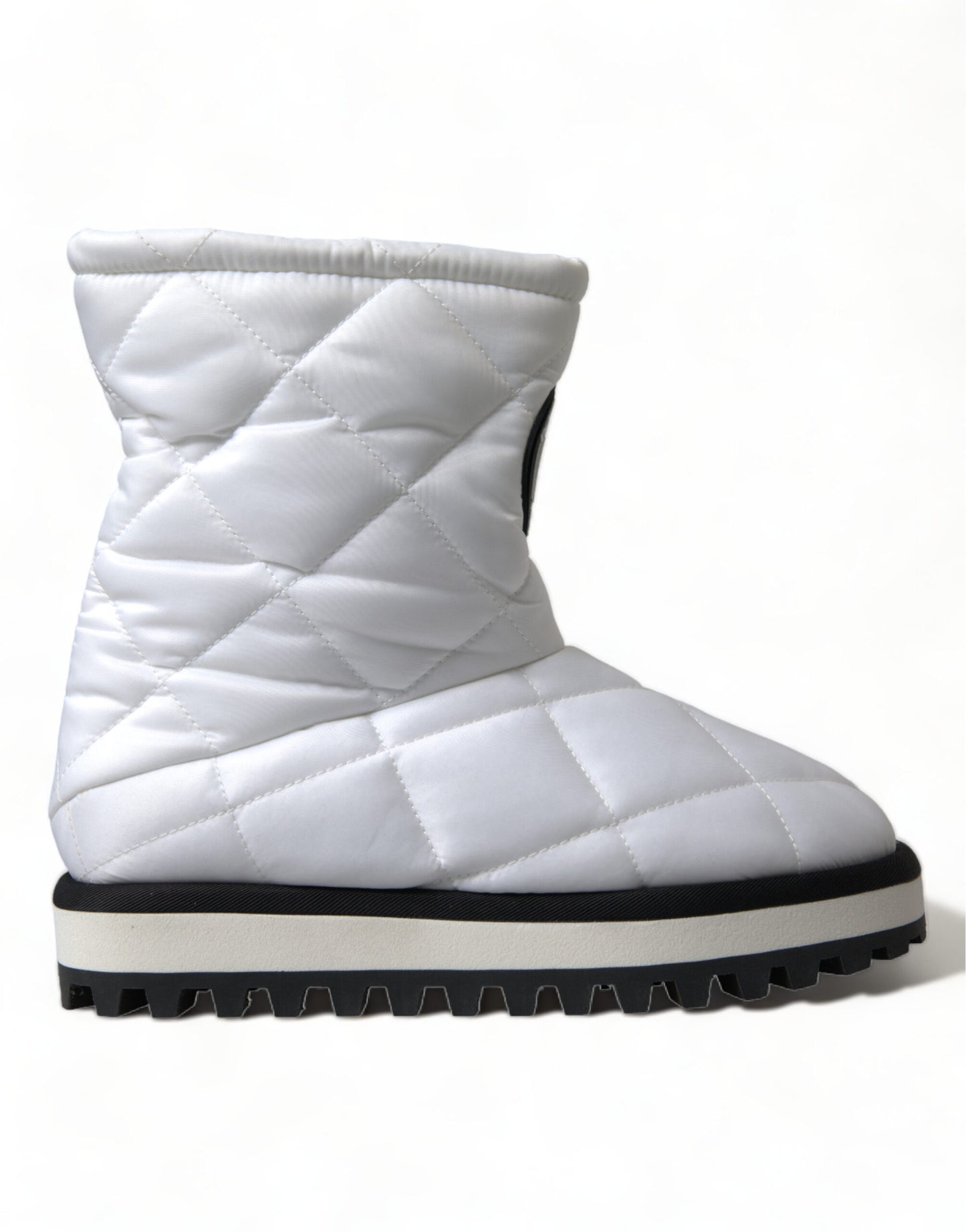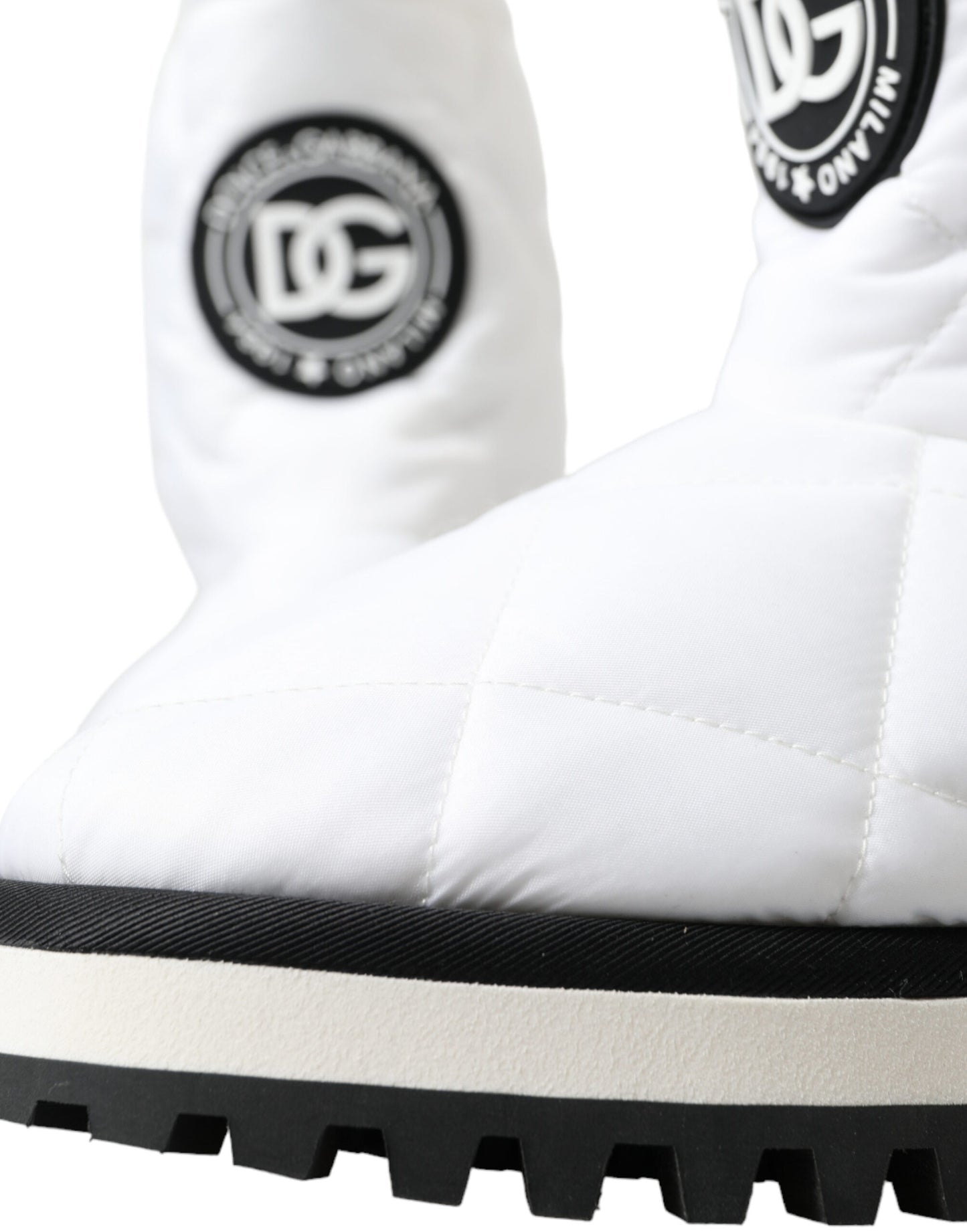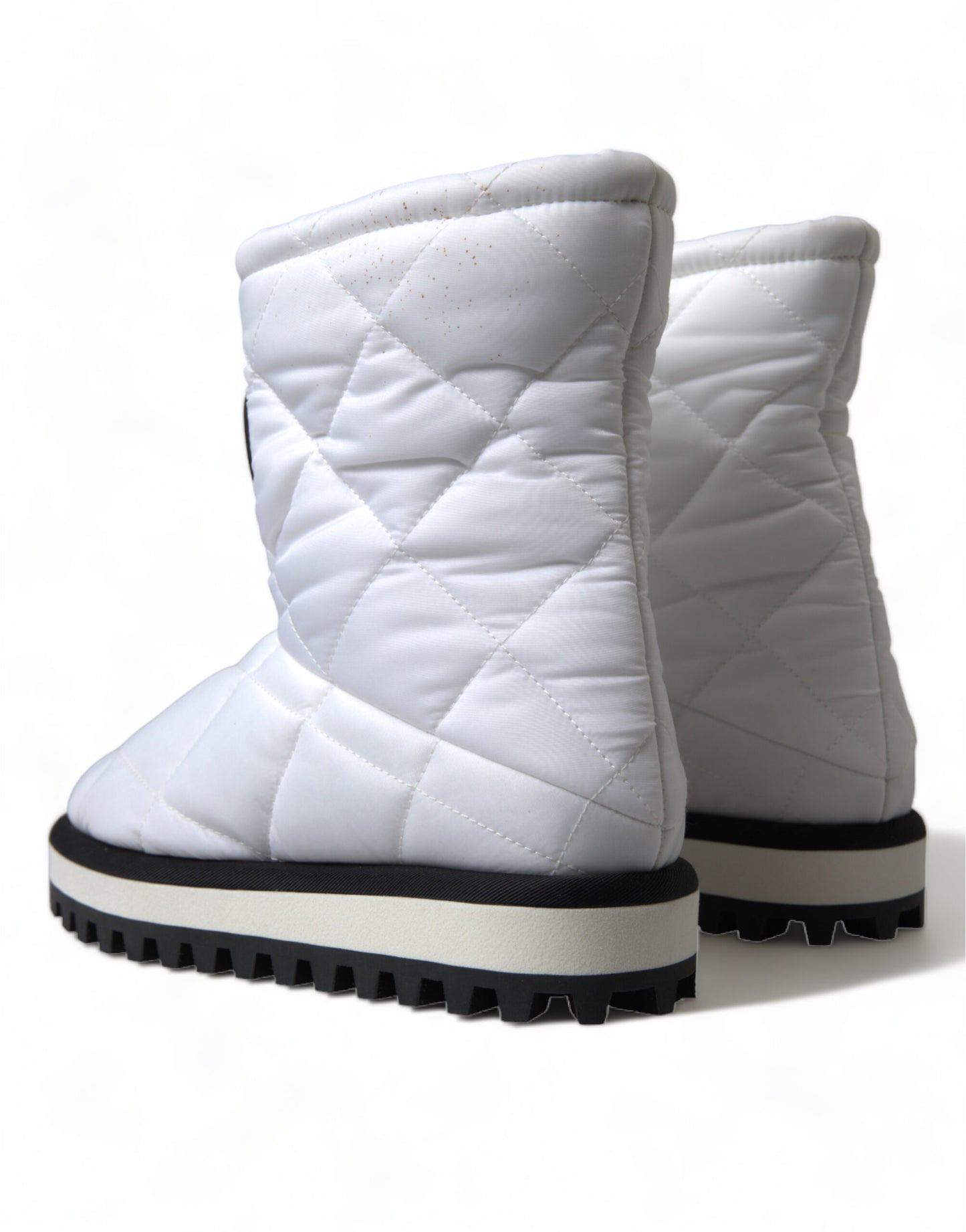 Indulge in the epitome of winter luxury with these striking white quilted mid-calf boots by Dolce & Gabbana. These boots exude elegance with their shiny new tags and pristine condition. Designed to blend sophistication with comfort, they feature a standout rubberized logo badge set against pure white for an undeniably upscale look. Their slip-on style ensures ease of wear, while their construction provides a cushioned embrace for your feet, thanks to the soft leather interior and snuggly wool insole. The non-slip rubber sole offers stability with every step, creating a harmonious balance between functionality and high fashion—direct from the artisans of Italy to your wardrobe.