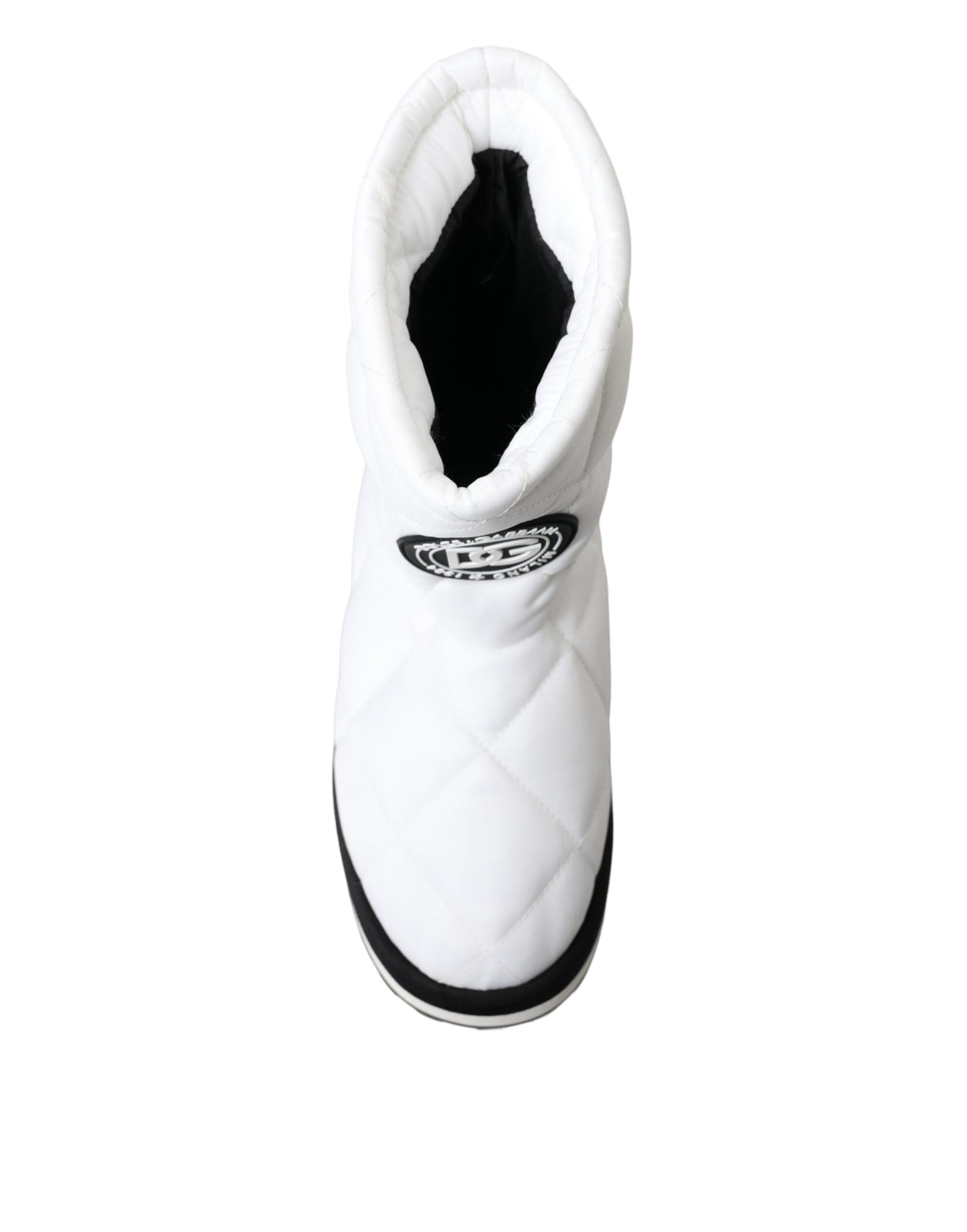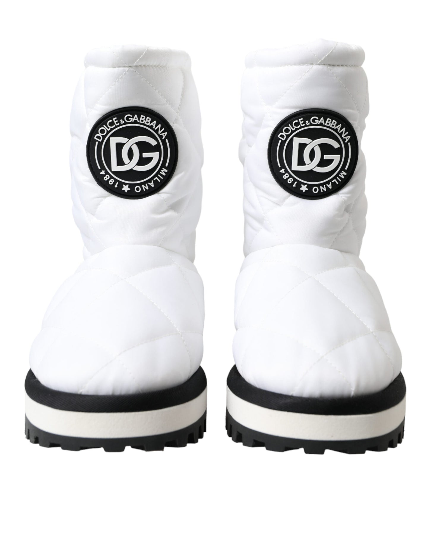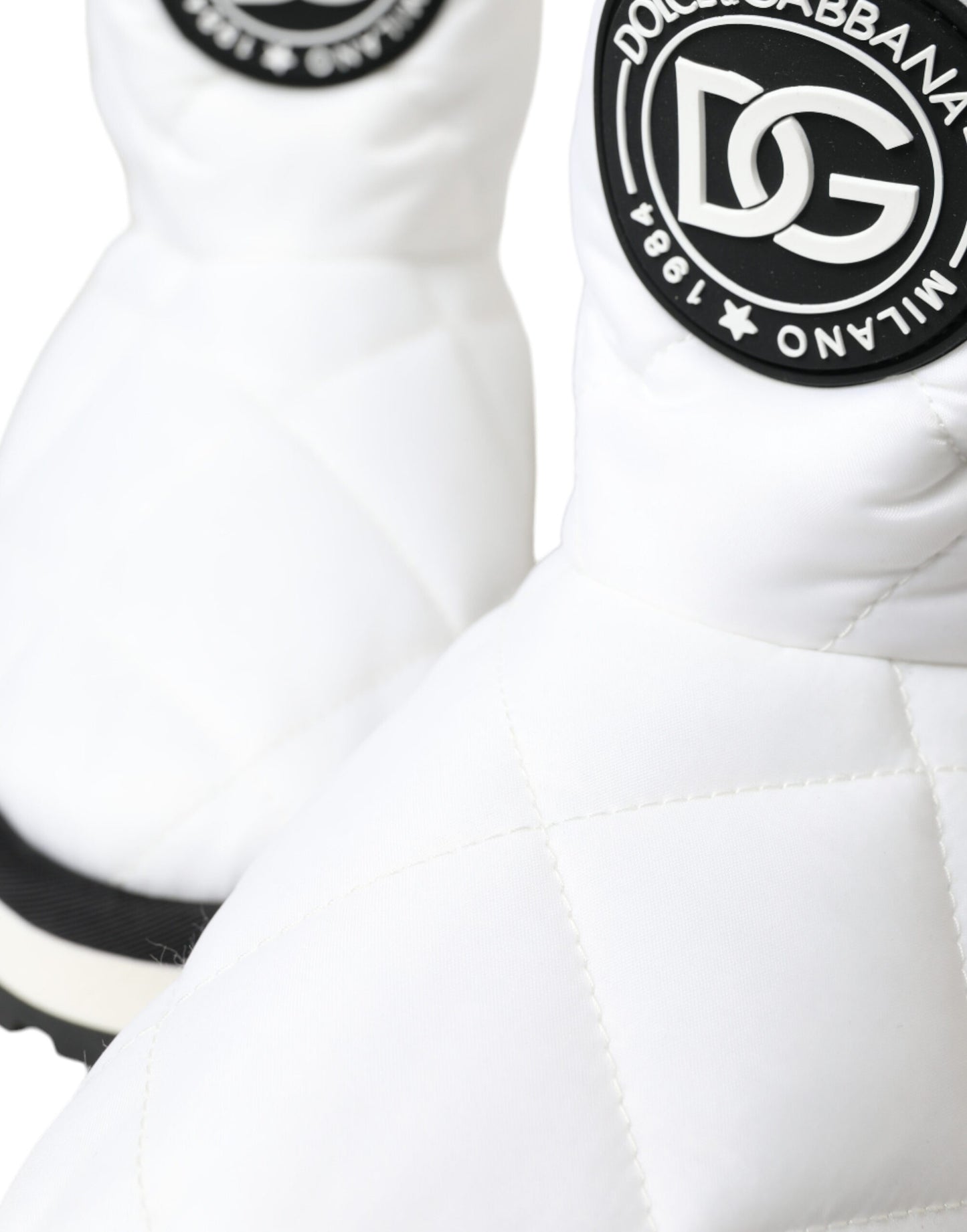 Indulge in the epitome of winter luxury with these striking white quilted mid-calf boots by Dolce & Gabbana. These boots exude elegance with their shiny new tags and pristine condition. Designed to blend sophistication with comfort, they feature a standout rubberized logo badge set against pure white for an undeniably upscale look. Their slip-on style ensures ease of wear, while their construction provides a cushioned embrace for your feet, thanks to the soft leather interior and snuggly wool insole. The non-slip rubber sole offers stability with every step, creating a harmonious balance between functionality and high fashion—direct from the artisans of Italy to your wardrobe.