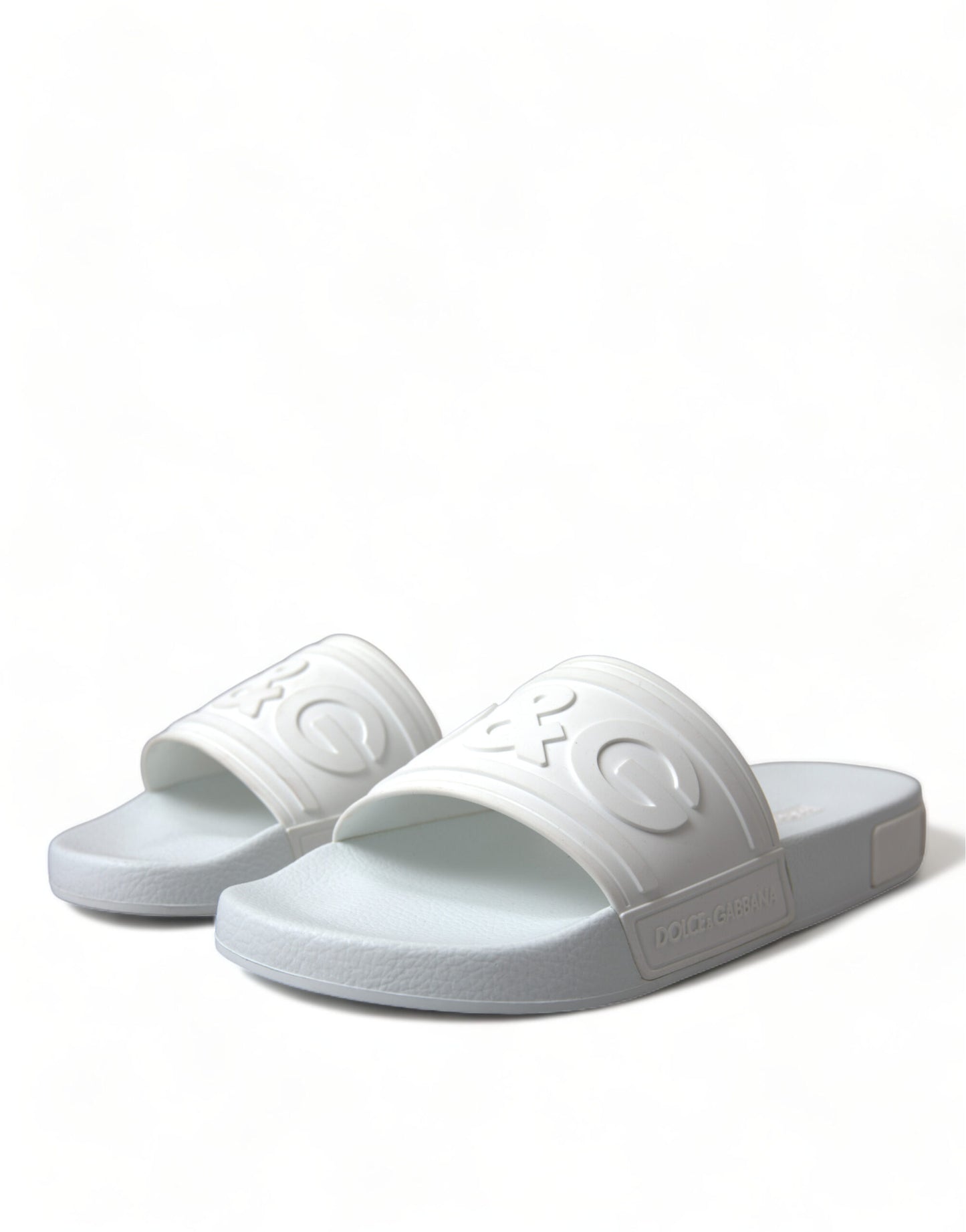 Step into luxury with these Dolce & Gabbana slides that combine understated elegance with comfort. These brand new, authentic slides are perfect for those who appreciate high fashion and relaxed sophistication. Adorned with the iconic logo print, the pure white rubber construction ensures a lightweight feel, while the embossed sole adds a touch of class.