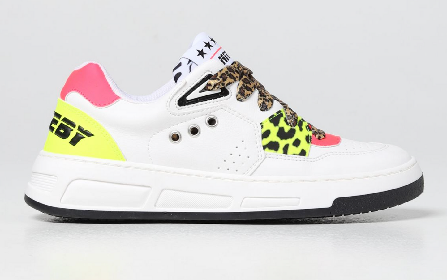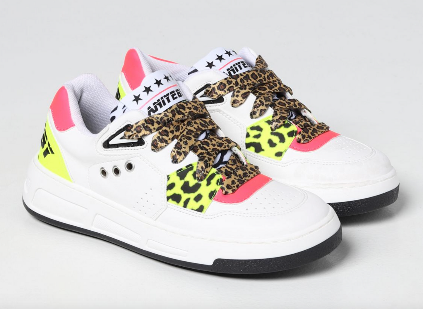 Step into sustainable style with these eco-leather sneakers that fuse comfort with fashion. The white base is elegantly contrasted by pops of yellow and neon pink, giving your footwear a distinctive edge. Complementing the bold colors are the leopard print laces that add a quirky touch to any outfit. Designed with a commitment to eco-friendly fashion, these sneakers are a testament to modern style meets consciousness.